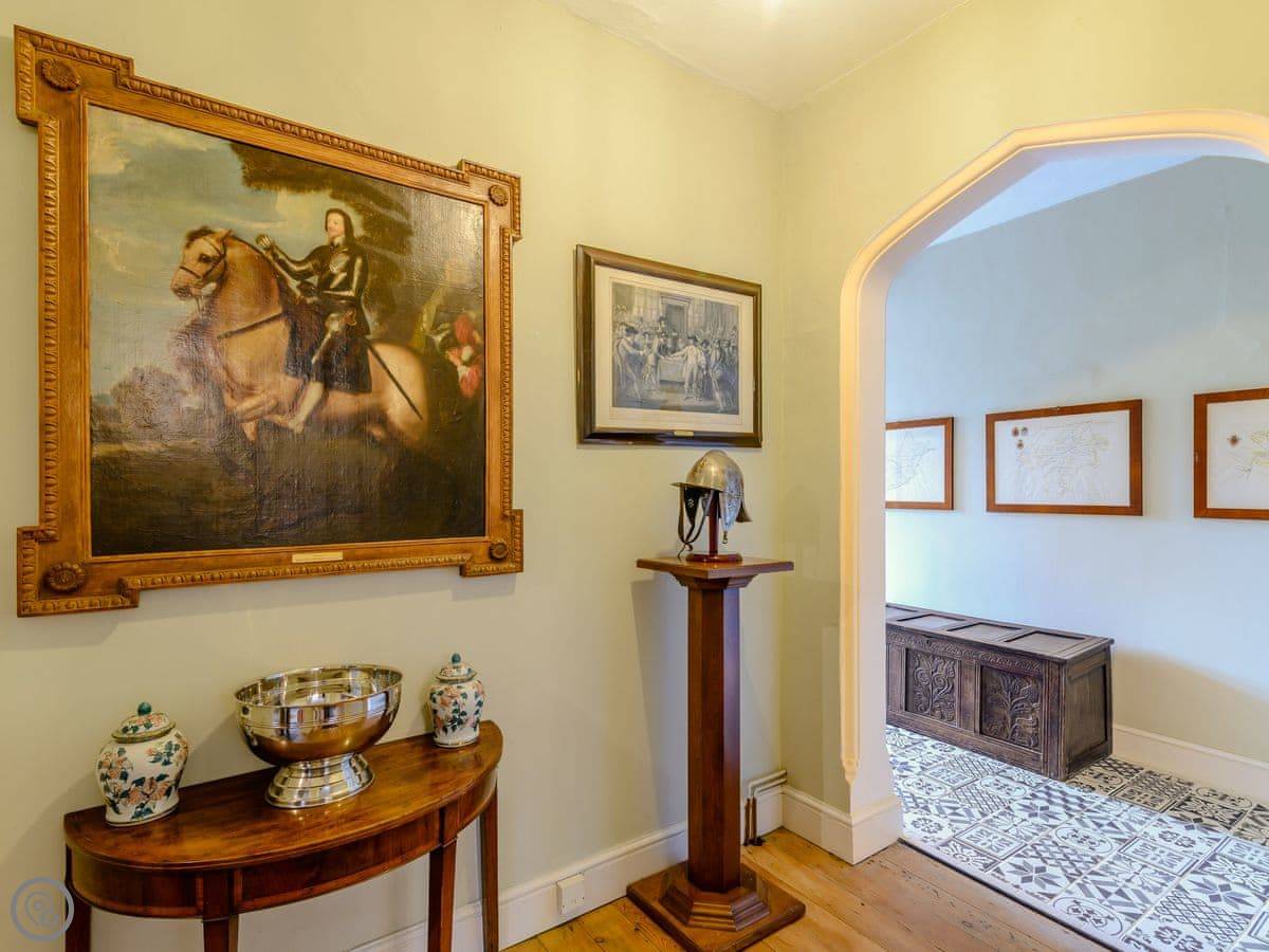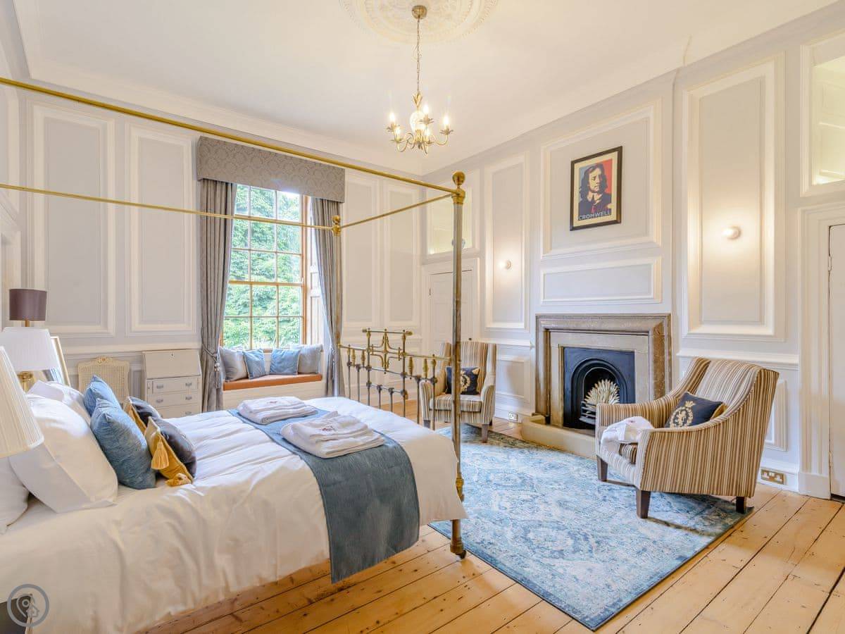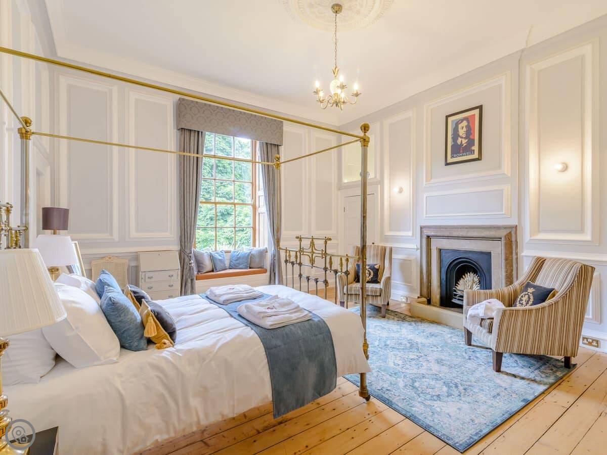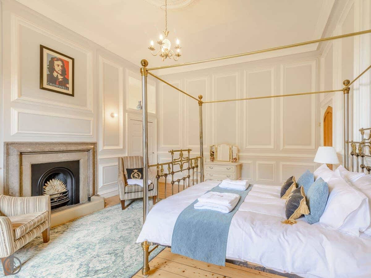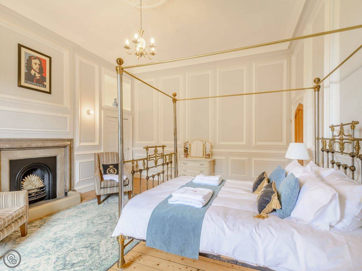It sleeps eight, but there are only three bedrooms. They're large suites really, each with its own bathroom. There's a fourth bathroom downstairs too. One room is called the Cromwell Room. He did apparently stay here. The Queen's Chamber is another. The story is Mary Queen of Scots stopped here. They're just bedrooms though, comfortable ones.