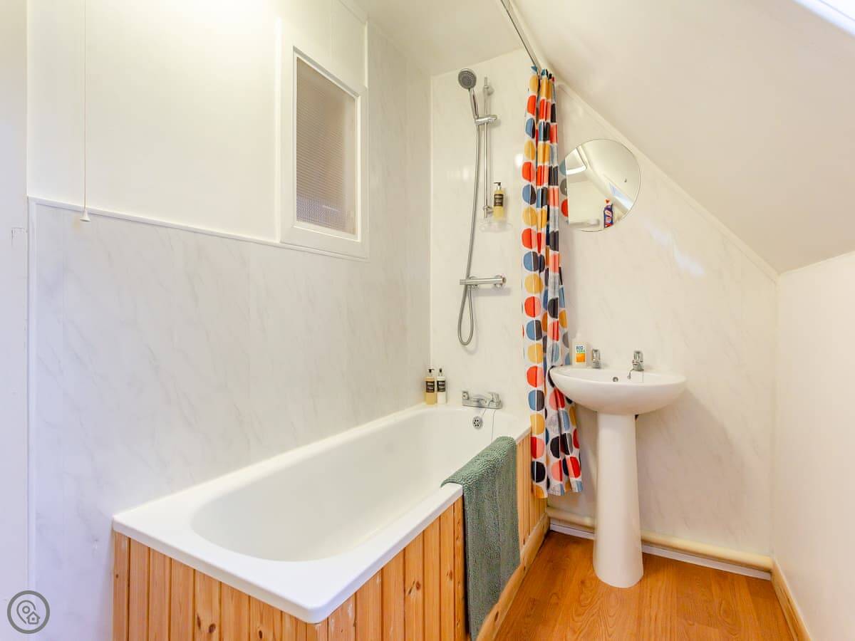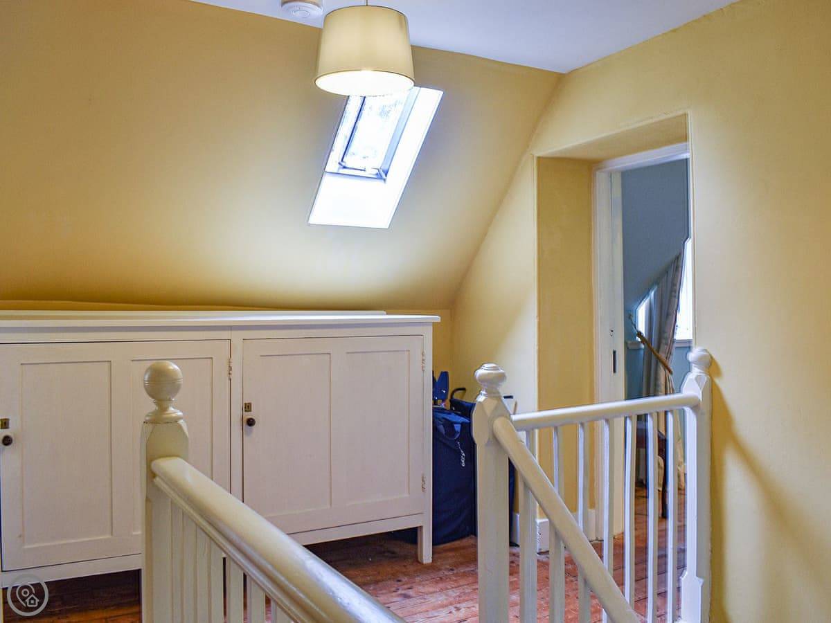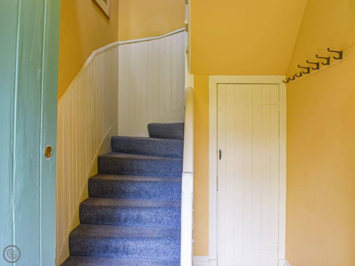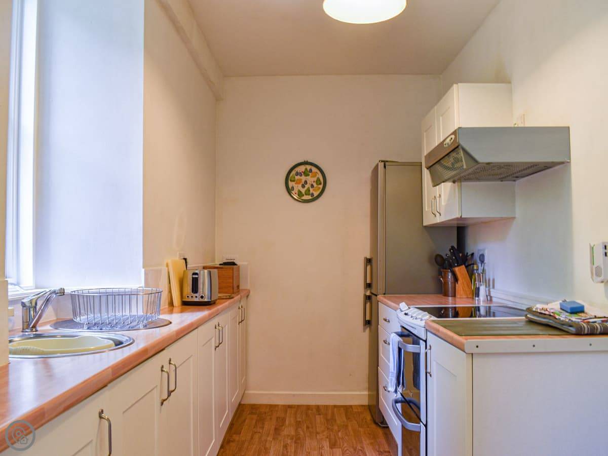 The house itself sleeps four. Two bedrooms upstairs, one bathroom. It's got a 3 Star rating. The stairs are steep, like in a lot of old places. The bathroom is small, with a shower over the bath. The kitchen has what you need, fridge-freezer, washing machine. There's a wood burner in the living room.