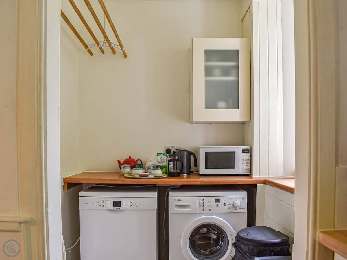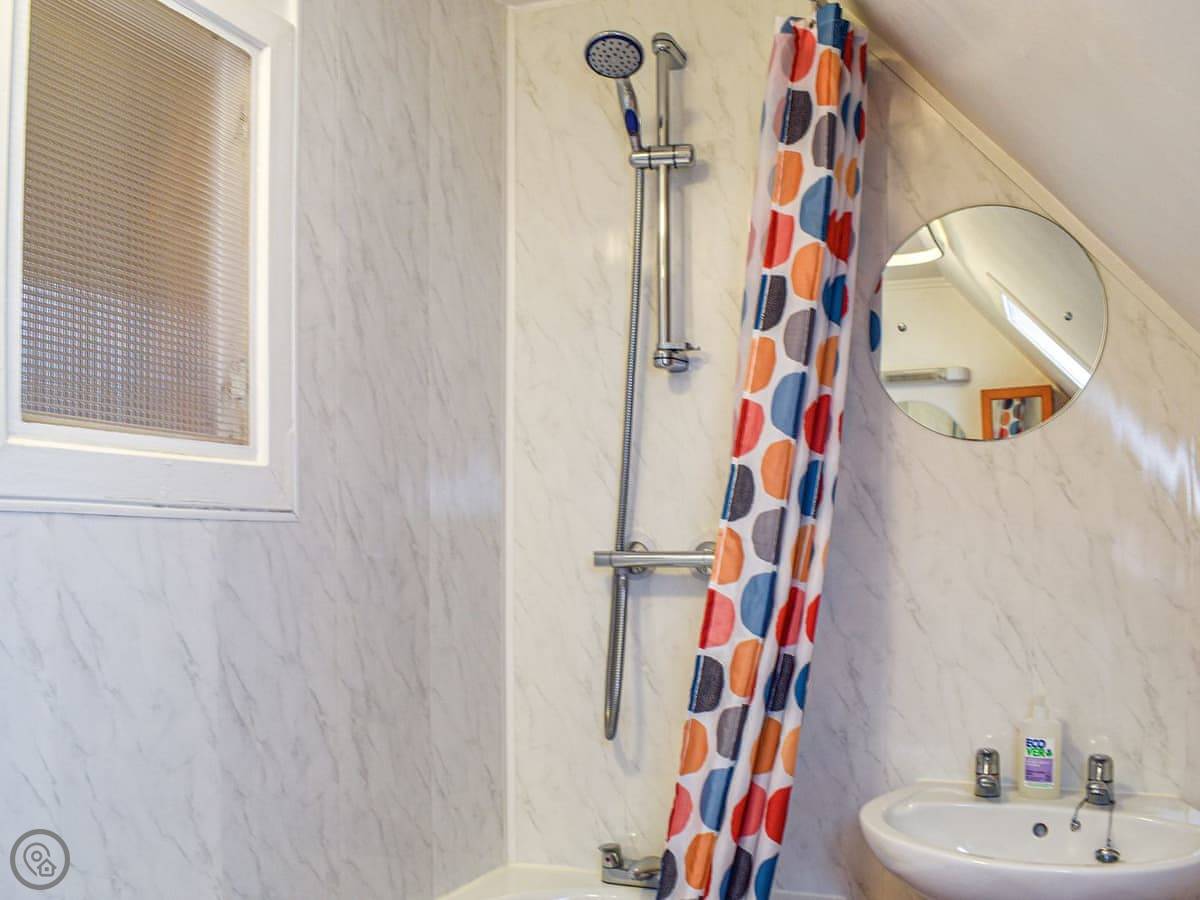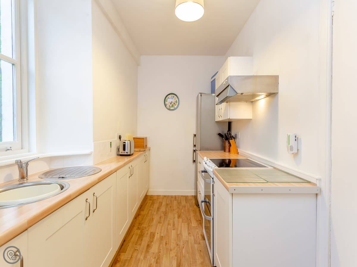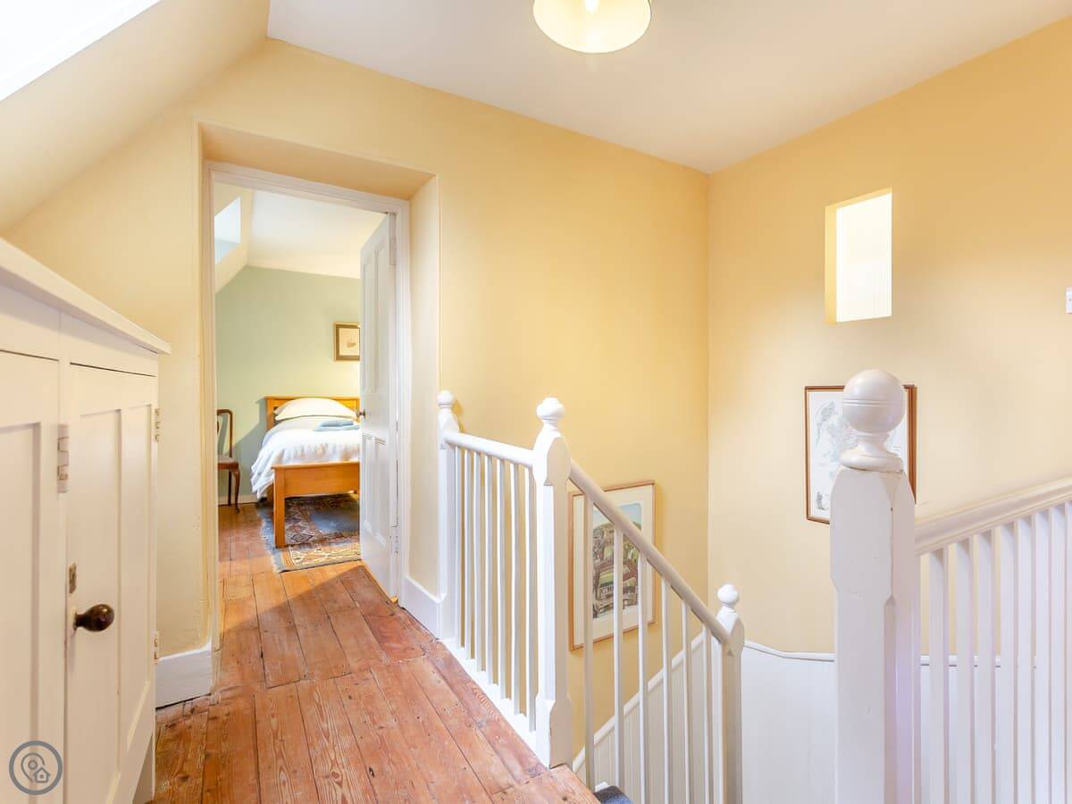 The house itself sleeps four. Two bedrooms upstairs, one bathroom. It's got a 3 Star rating. The stairs are steep, like in a lot of old places. The bathroom is small, with a shower over the bath. The kitchen has what you need, fridge-freezer, washing machine. There's a wood burner in the living room.