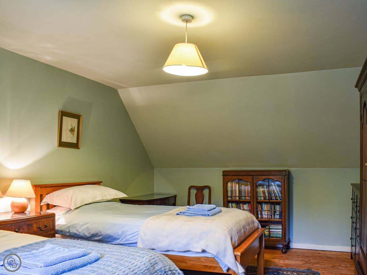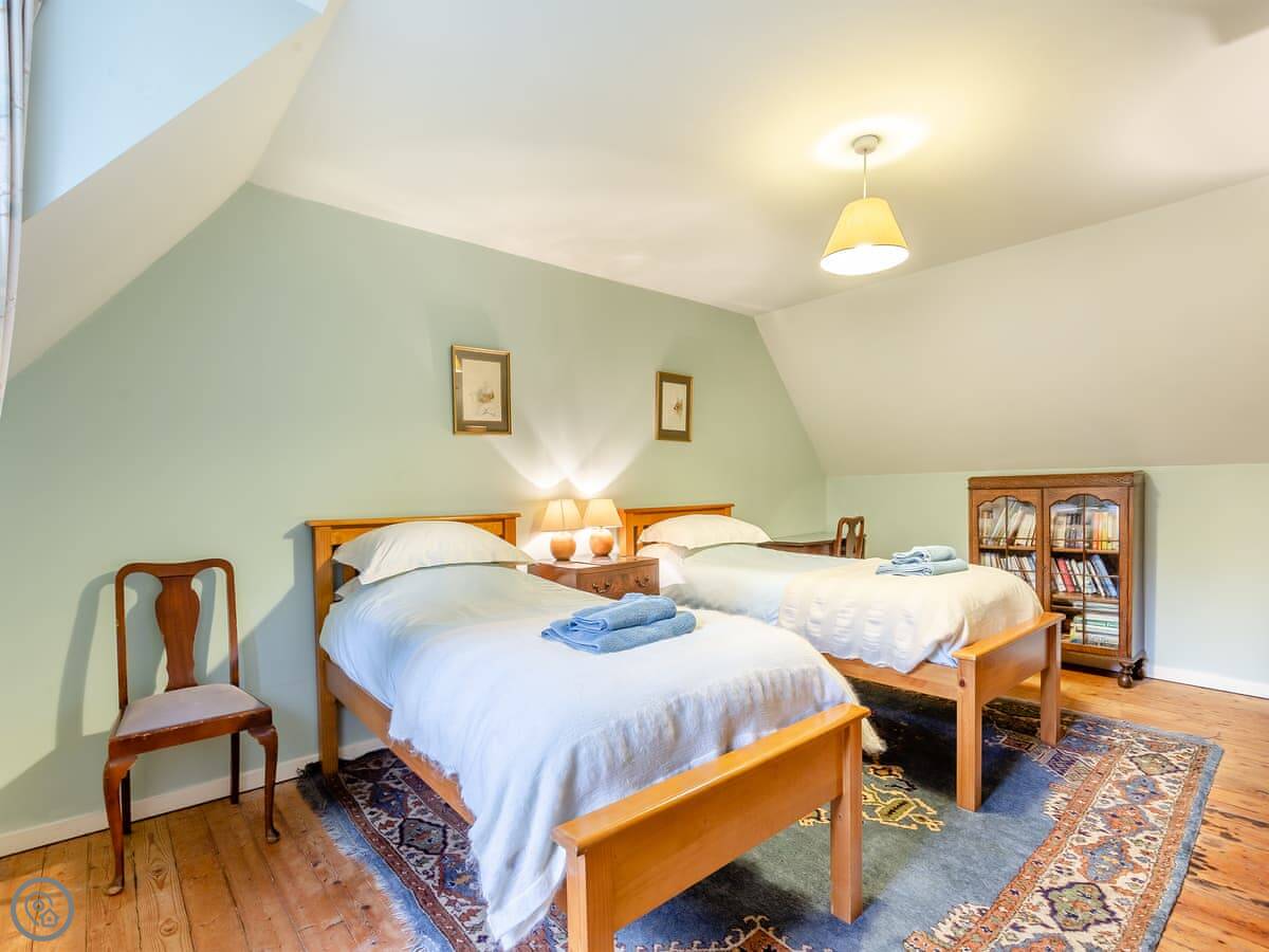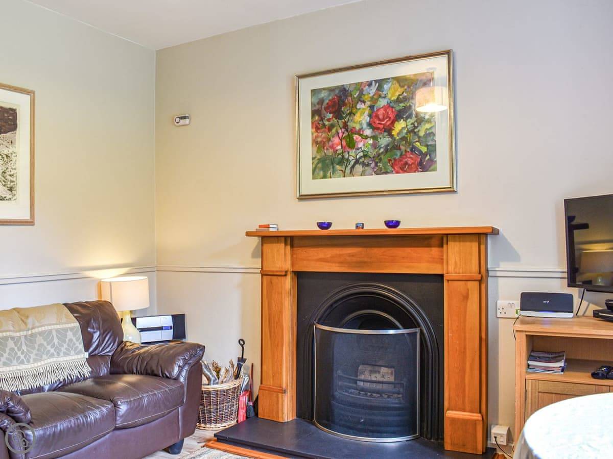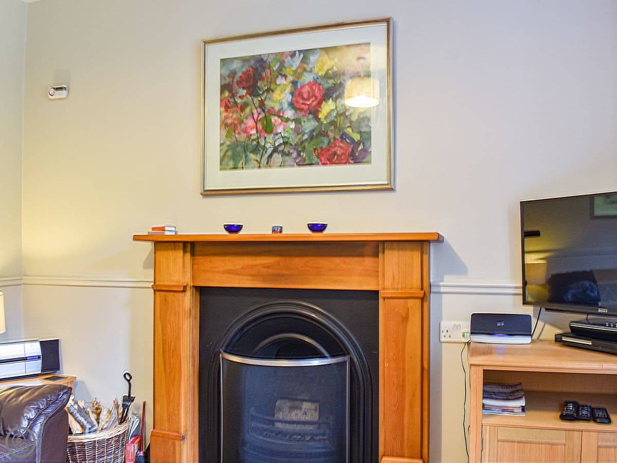 The house itself sleeps four. Two bedrooms upstairs, one bathroom. It's got a 3 Star rating. The stairs are steep, like in a lot of old places. The bathroom is small, with a shower over the bath. The kitchen has what you need, fridge-freezer, washing machine. There's a wood burner in the living room.