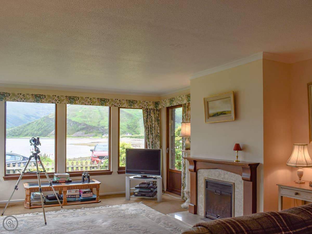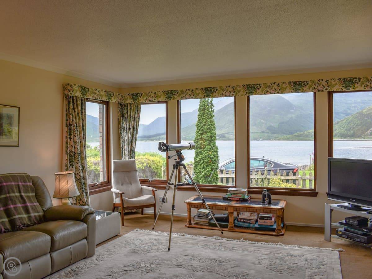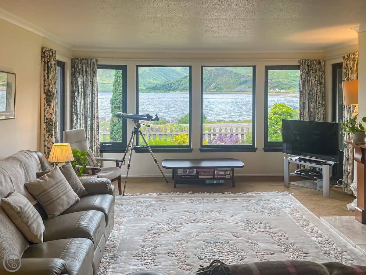 Being a bungalow, everything's on one level. The patio is covered, which is useful here. There's a proper telescope in the living room if you want a closer look at the hills or the water.