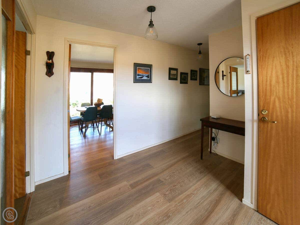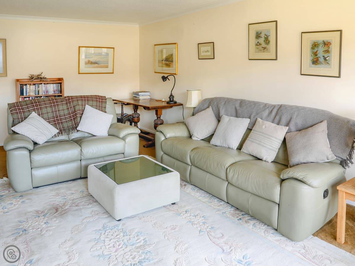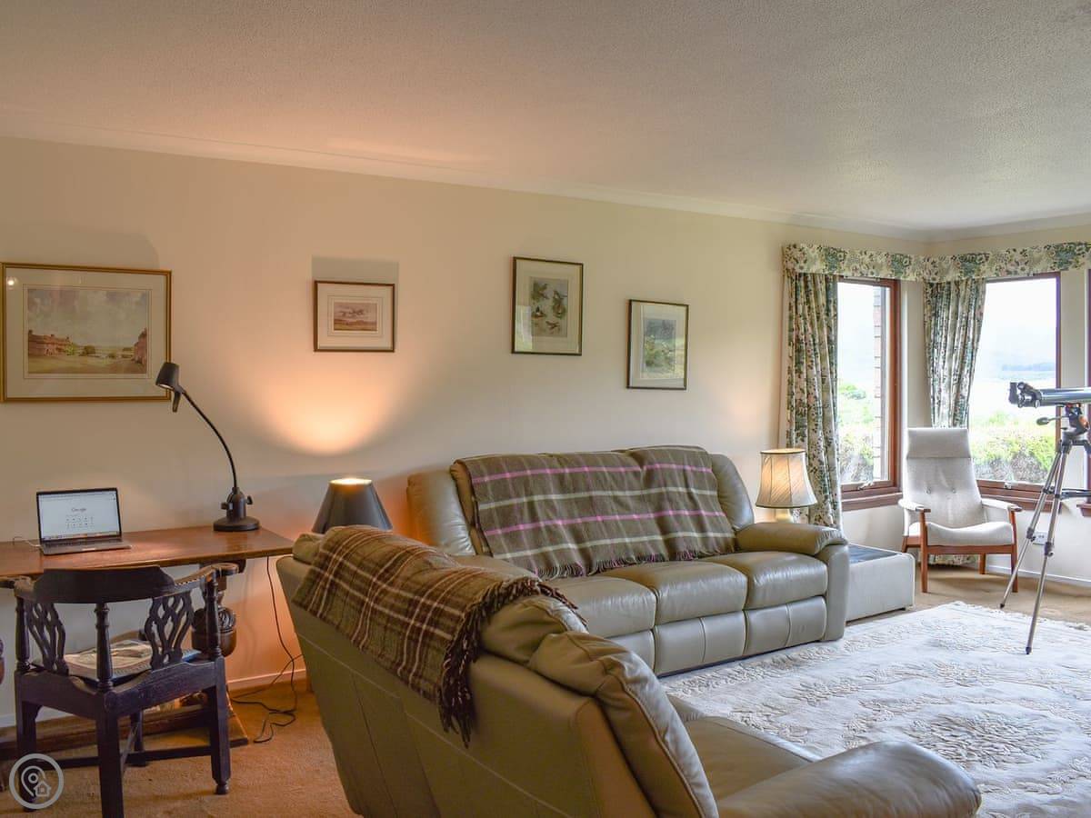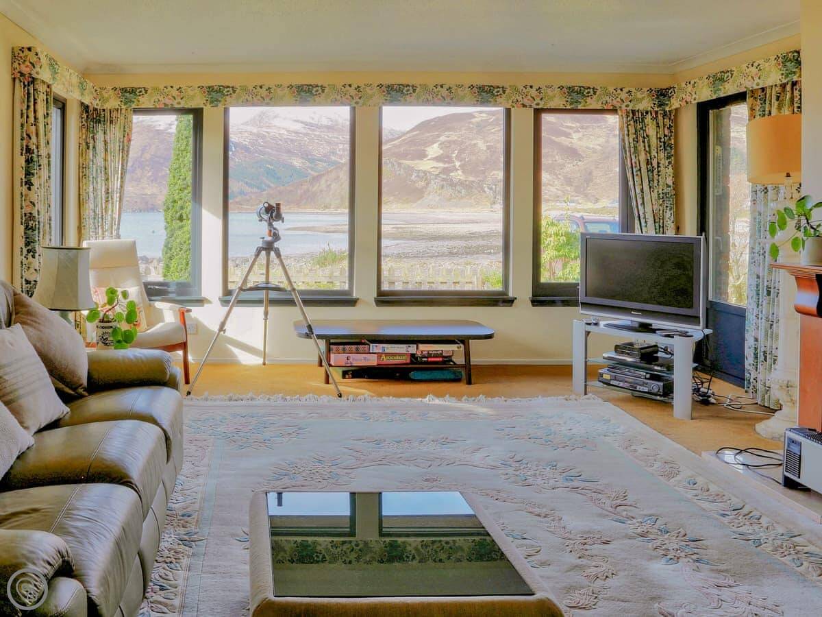 Being a bungalow, everything's on one level. The patio is covered, which is useful here. There's a proper telescope in the living room if you want a closer look at the hills or the water.