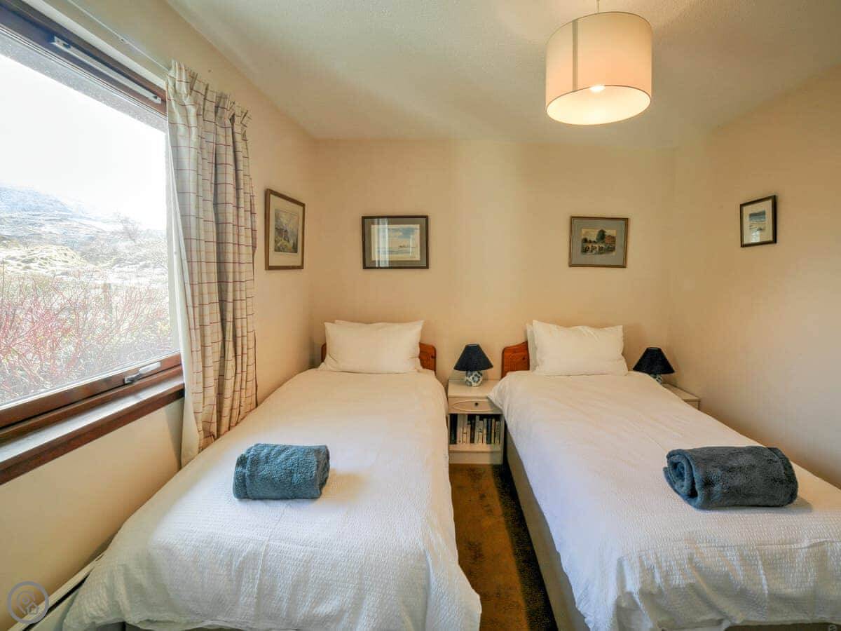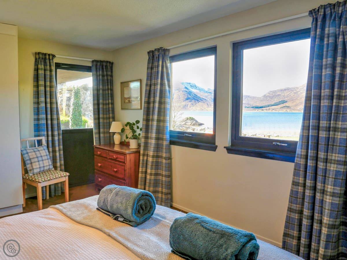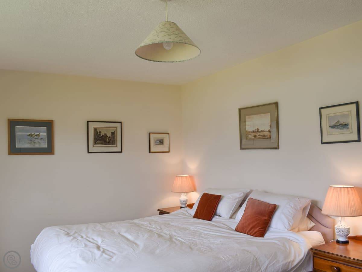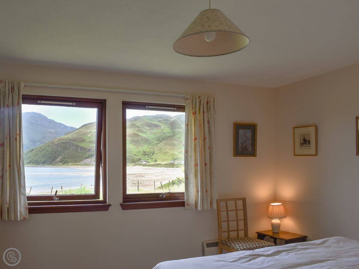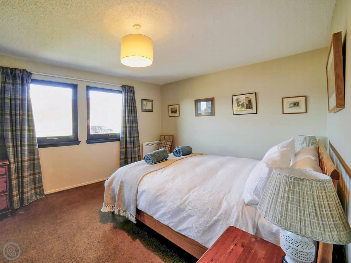 It sleeps four in two bedrooms. Both bedrooms have their own bathrooms, which is handy. The main bedroom looks straight out over the water to Skye. The view from the living room and kitchen is the same, just fields and the sea. It's a 4 Star place, so it's comfortable and well kept.