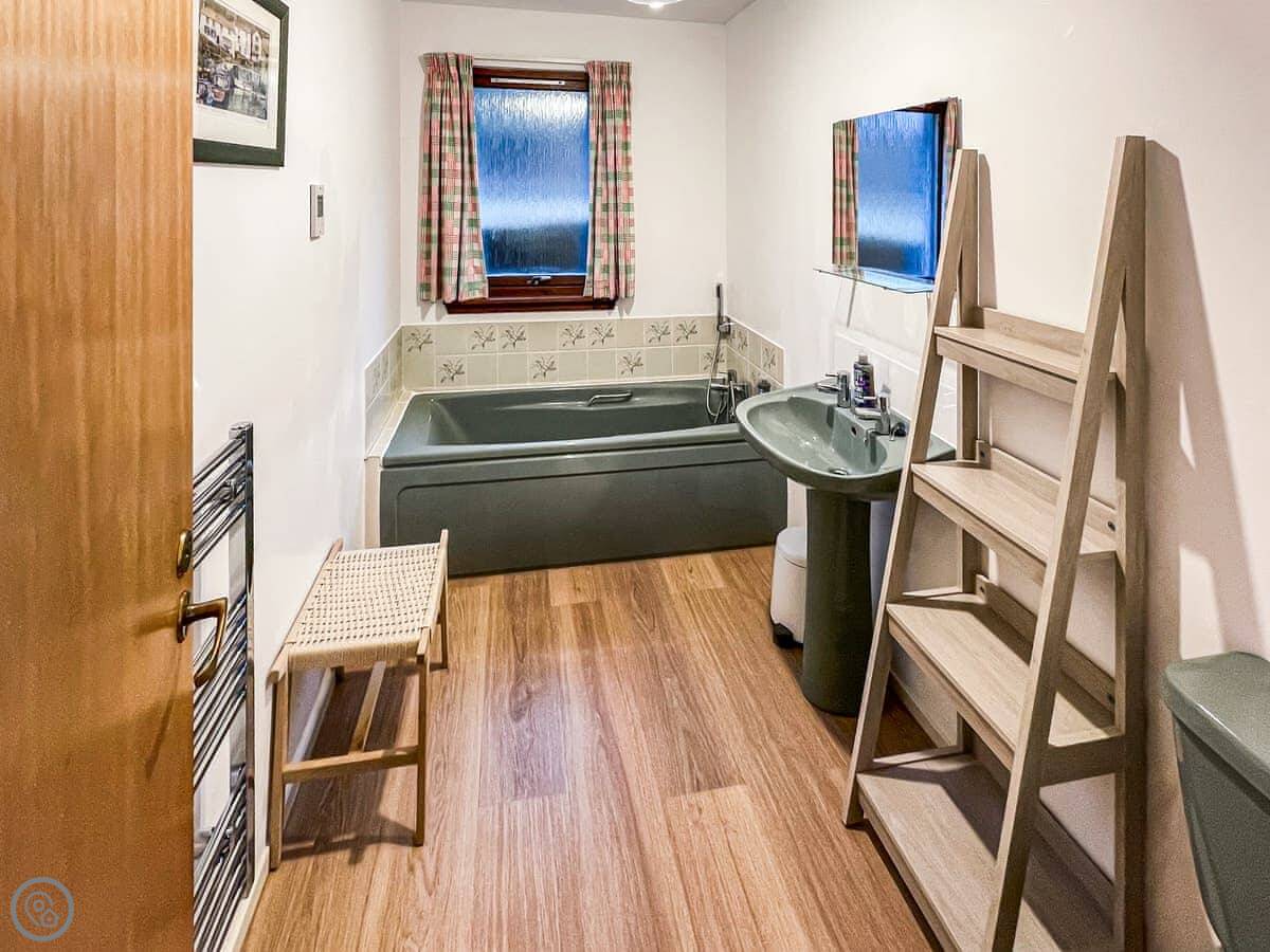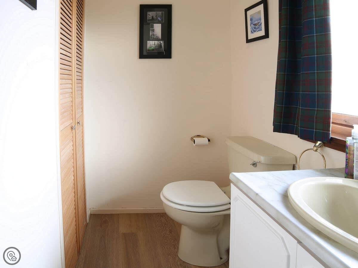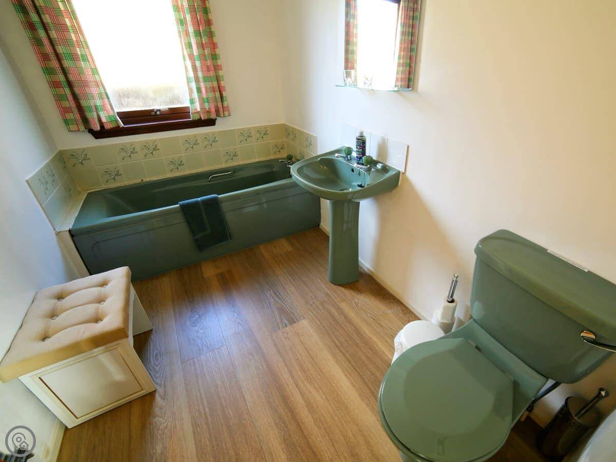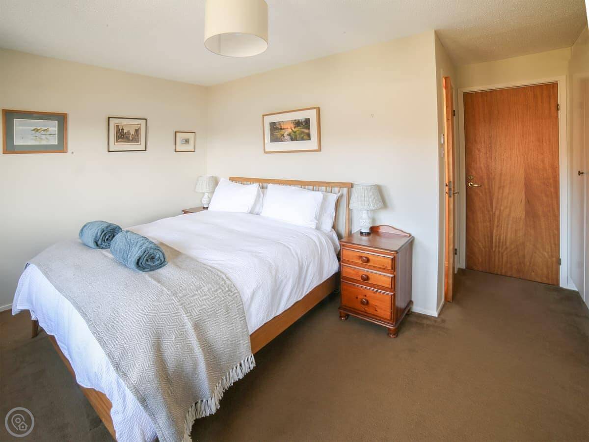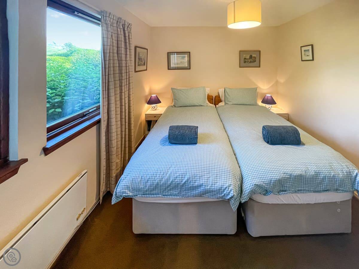 It sleeps four in two bedrooms. Both bedrooms have their own bathrooms, which is handy. The main bedroom looks straight out over the water to Skye. The view from the living room and kitchen is the same, just fields and the sea. It's a 4 Star place, so it's comfortable and well kept.