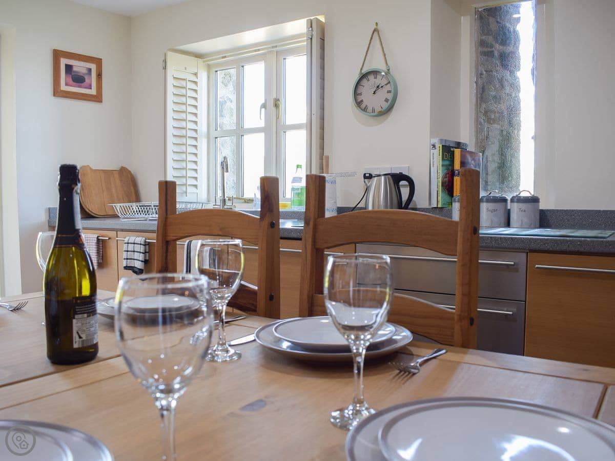 The main living room is a big, double-height space with beams. There's a wood burner there. Doors open out to the patio. The kitchen is separate, through an archway. It has a table for six, a dishwasher, and there's a utility room off it with a washing machine.