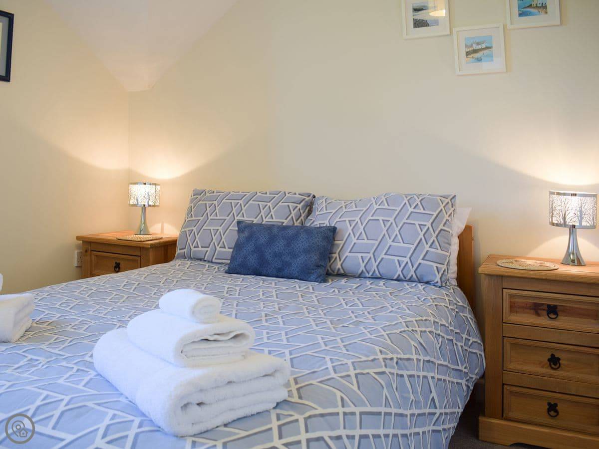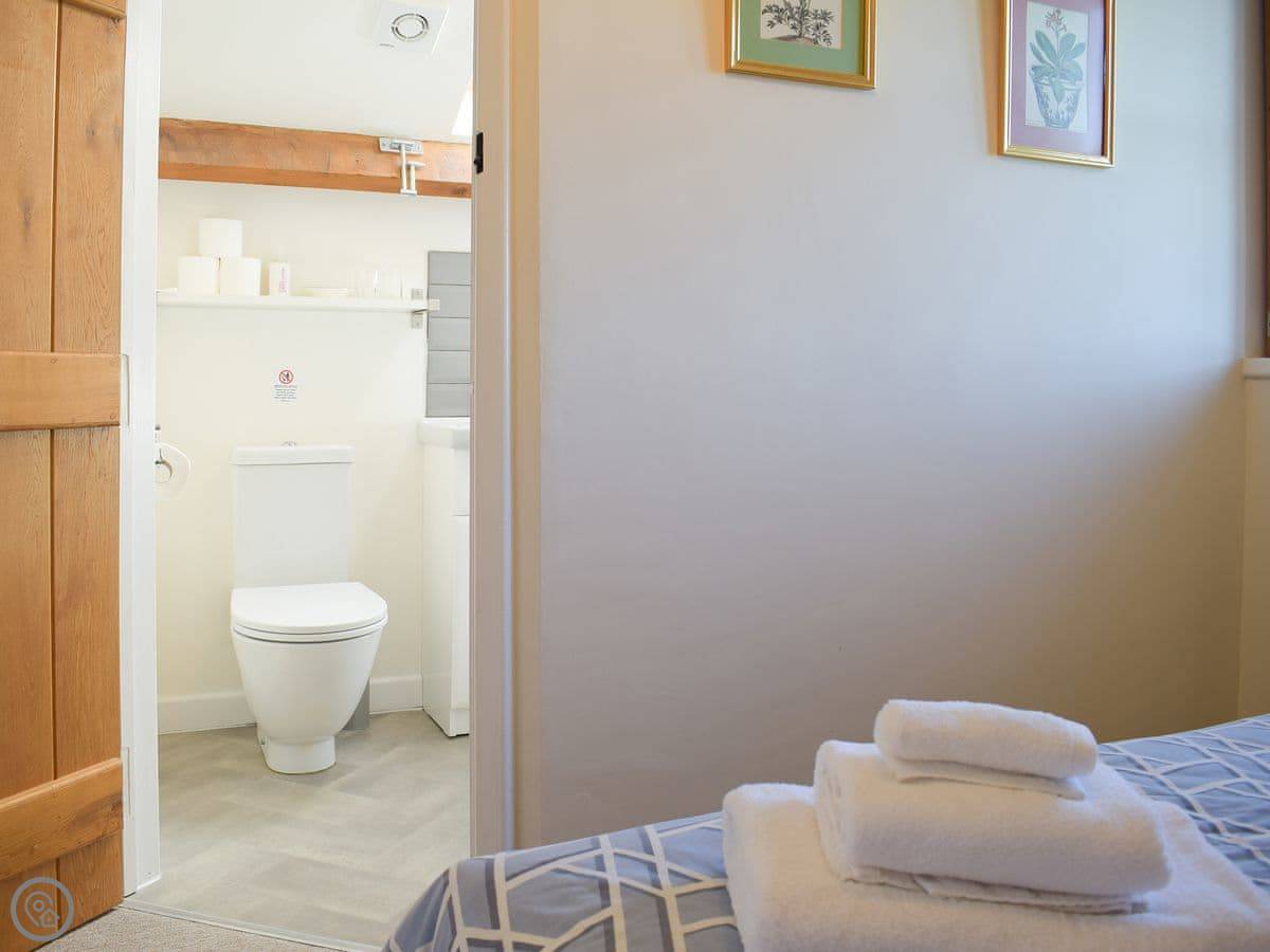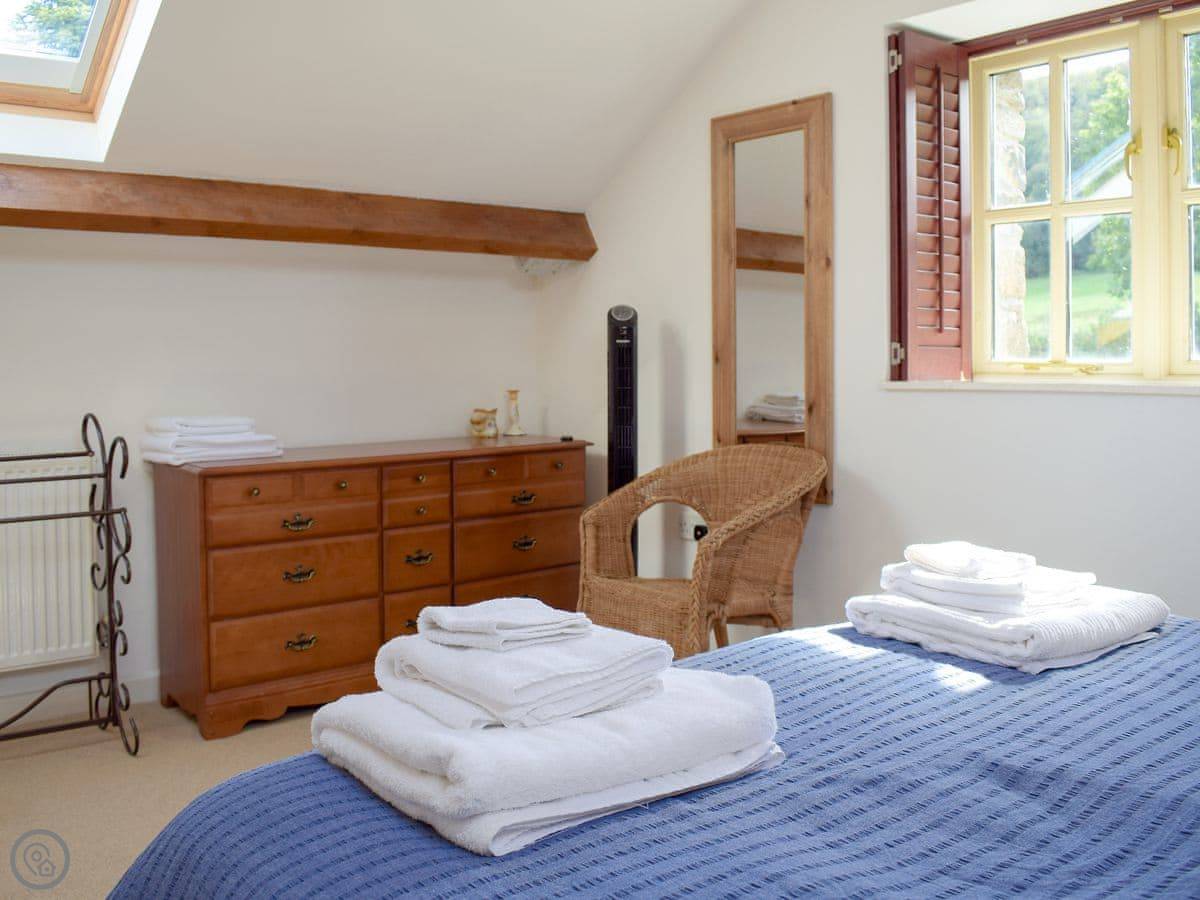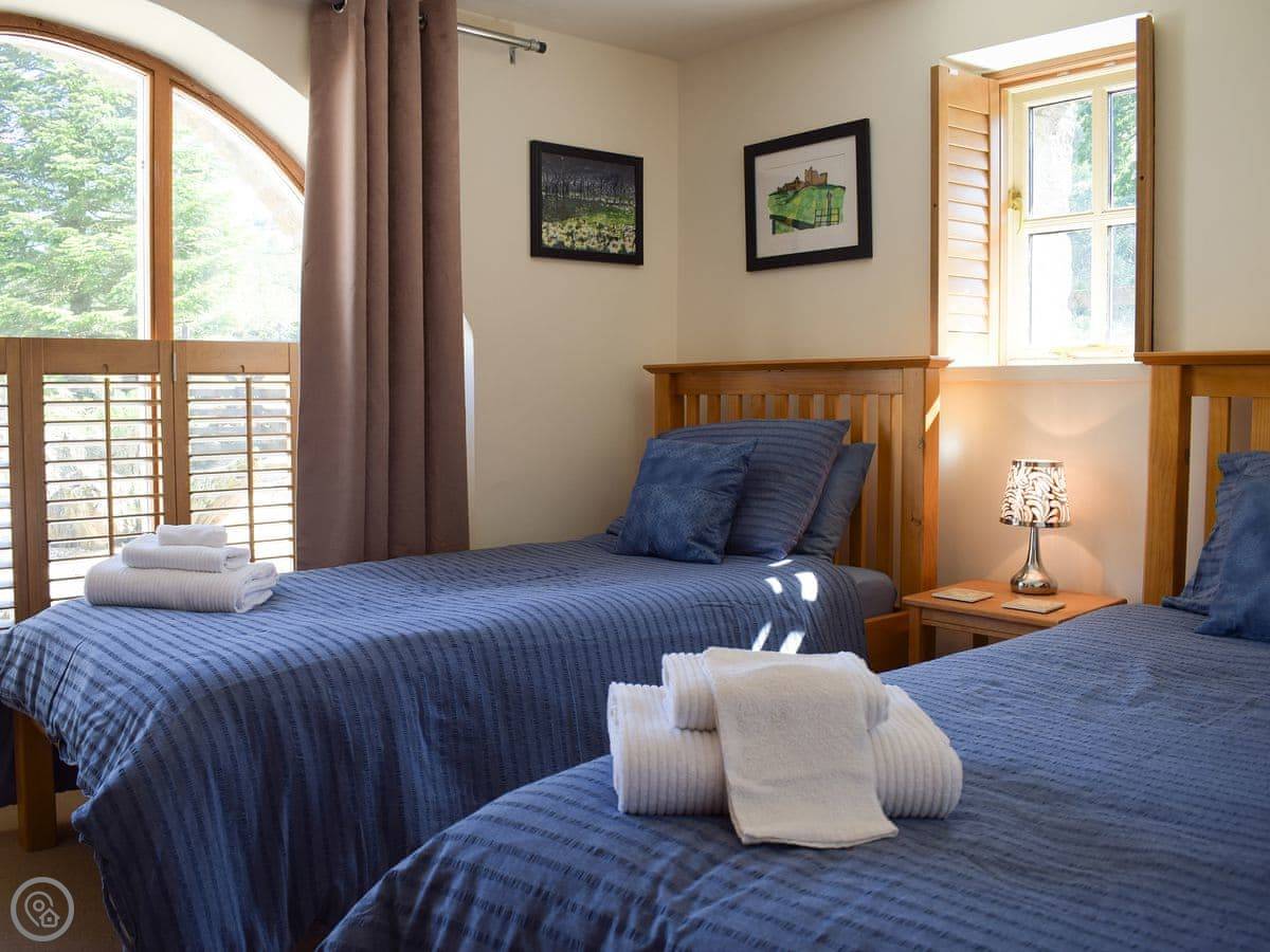 It sleeps six. Three bedrooms, two bathrooms. One bathroom is en-suite to the master, the other is a family bathroom. It's a 4 Star place. One of the double bedrooms is upstairs, the twin and the master are on the ground floor.