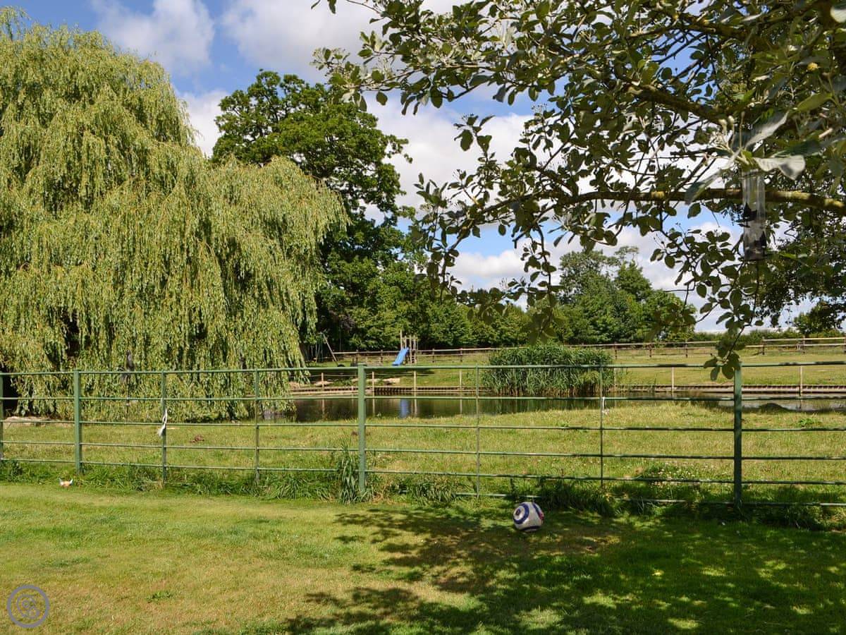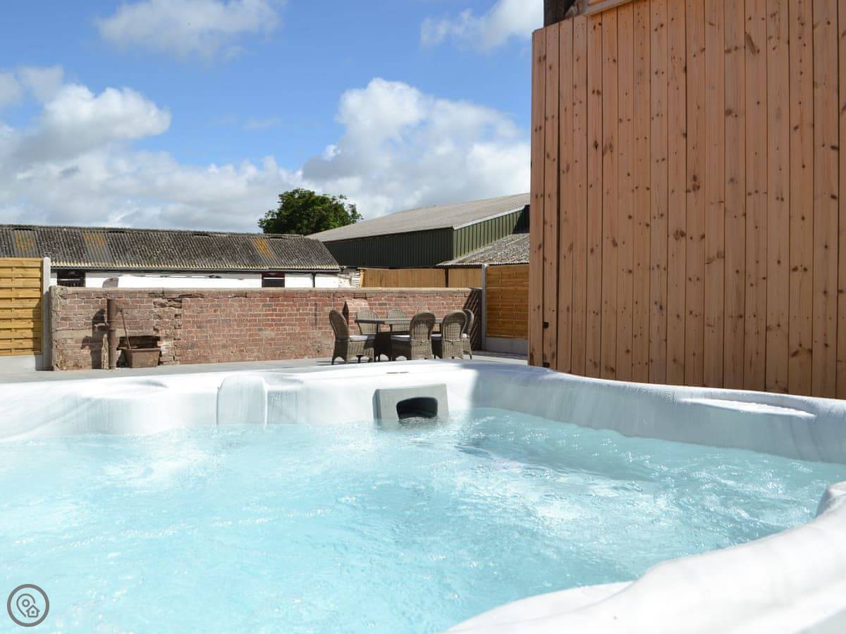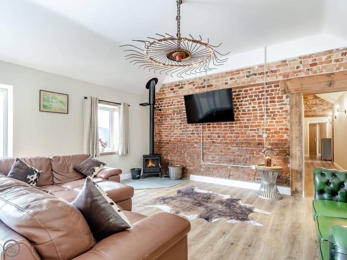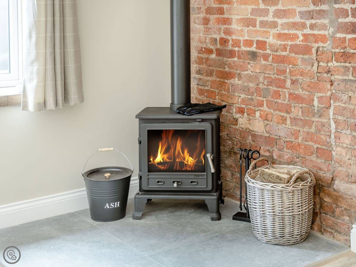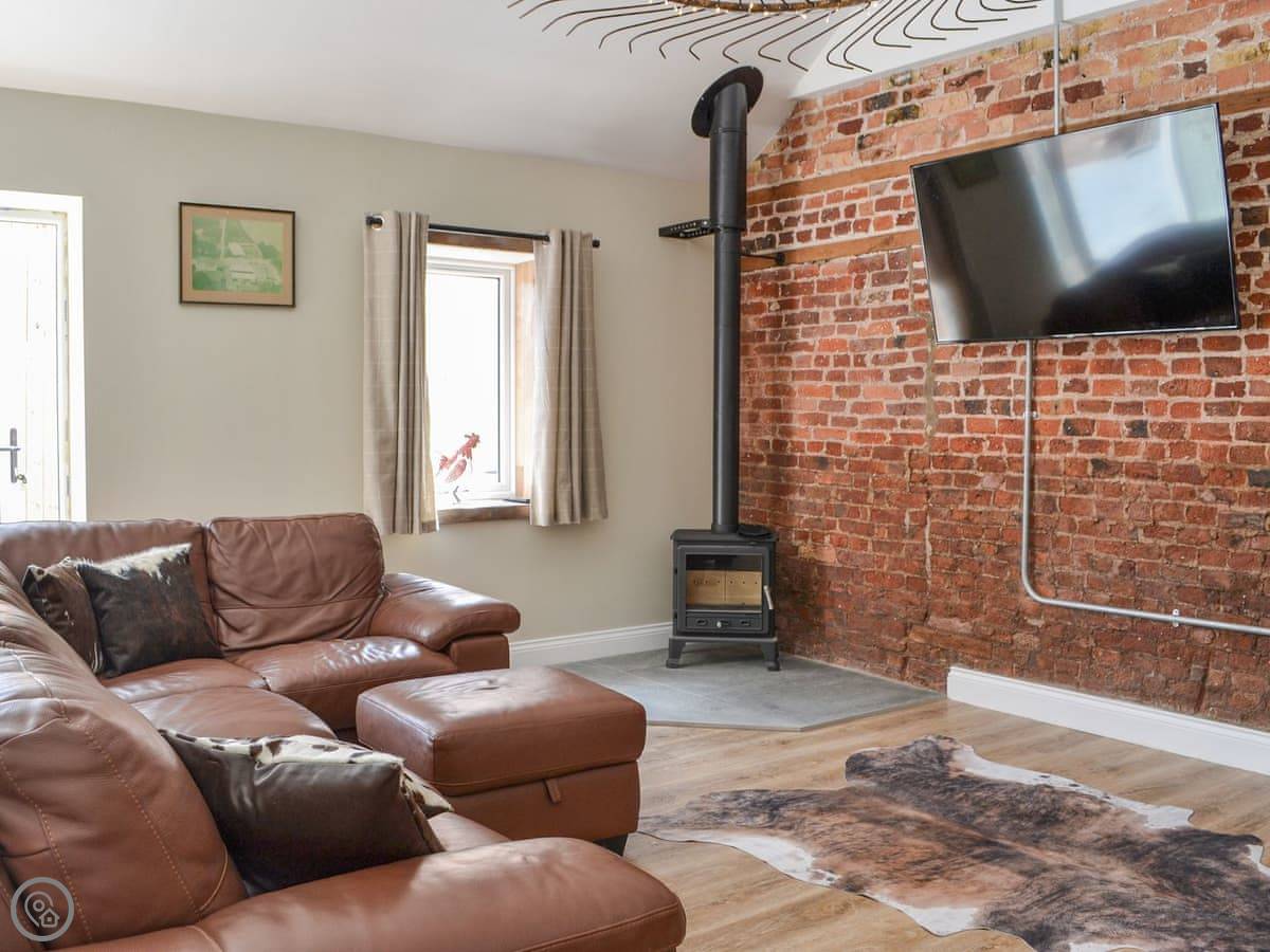 You've got a wood burner in the main room. There's a Smart TV. The kitchen has what you need. The garden is enclosed, with a patio and a hot tub. You can see the fields from there.