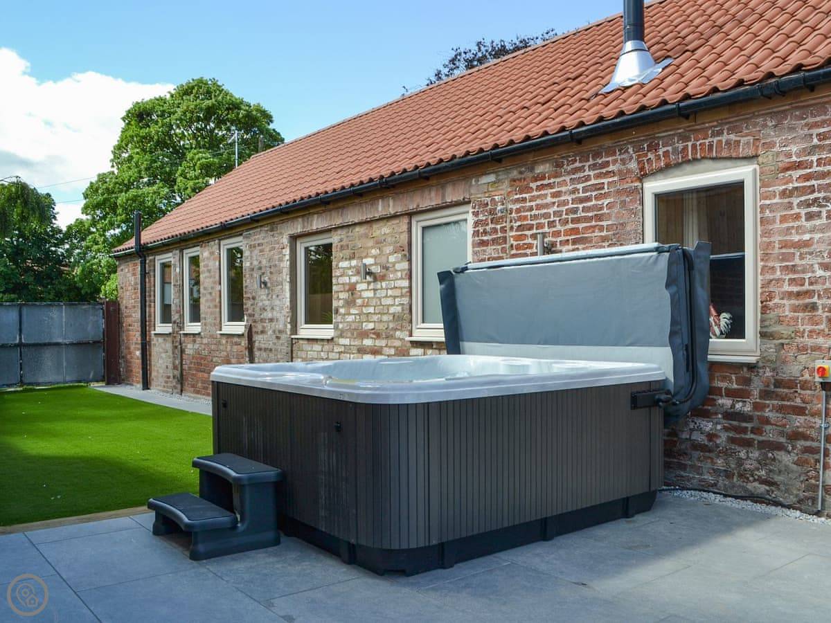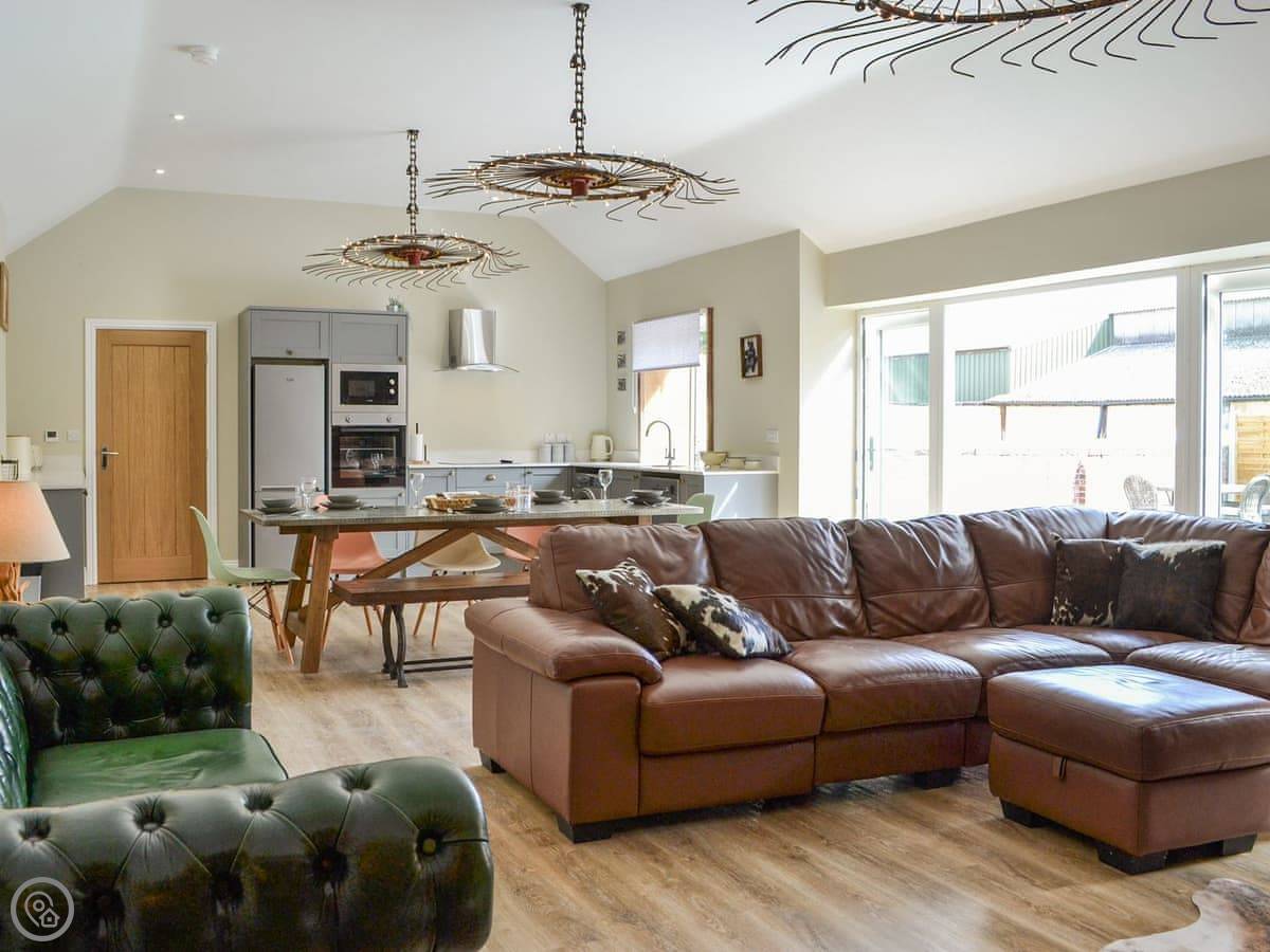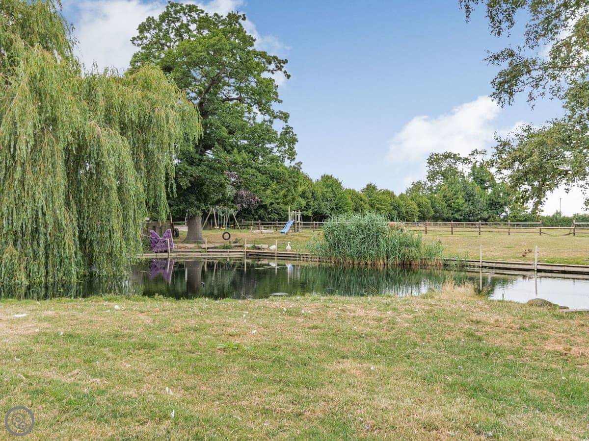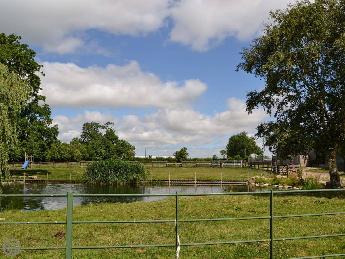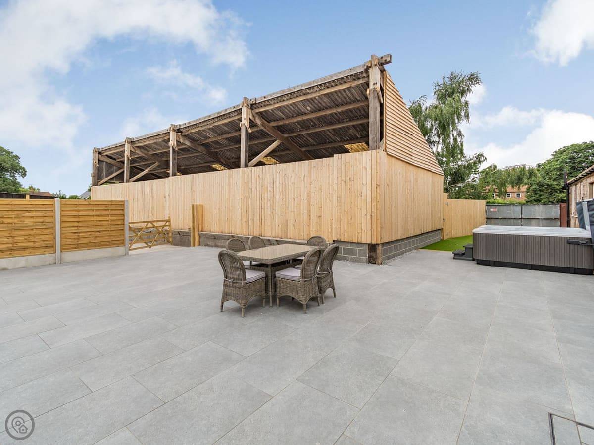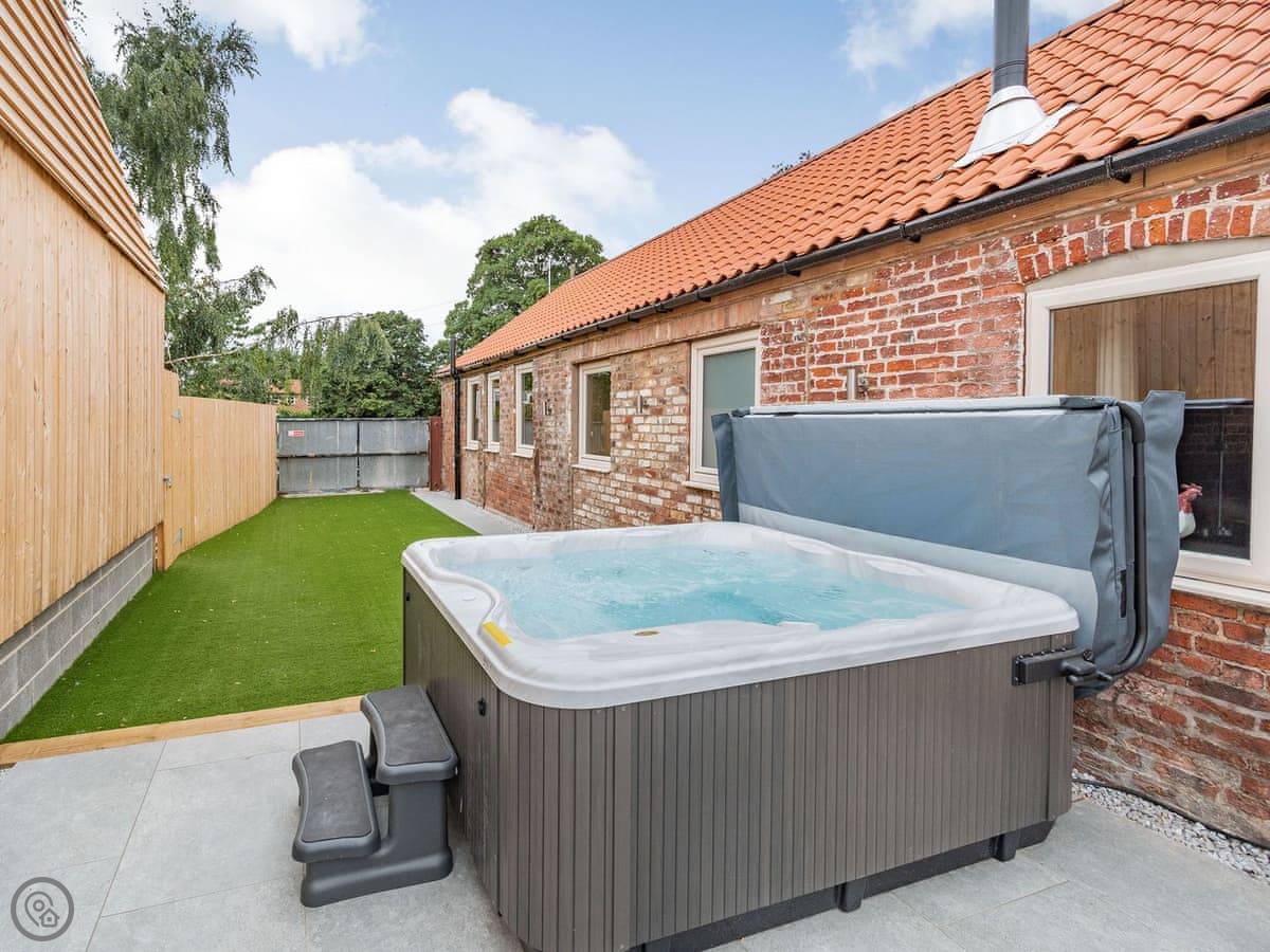 You've got a wood burner in the main room. There's a Smart TV. The kitchen has what you need. The garden is enclosed, with a patio and a hot tub. You can see the fields from there.