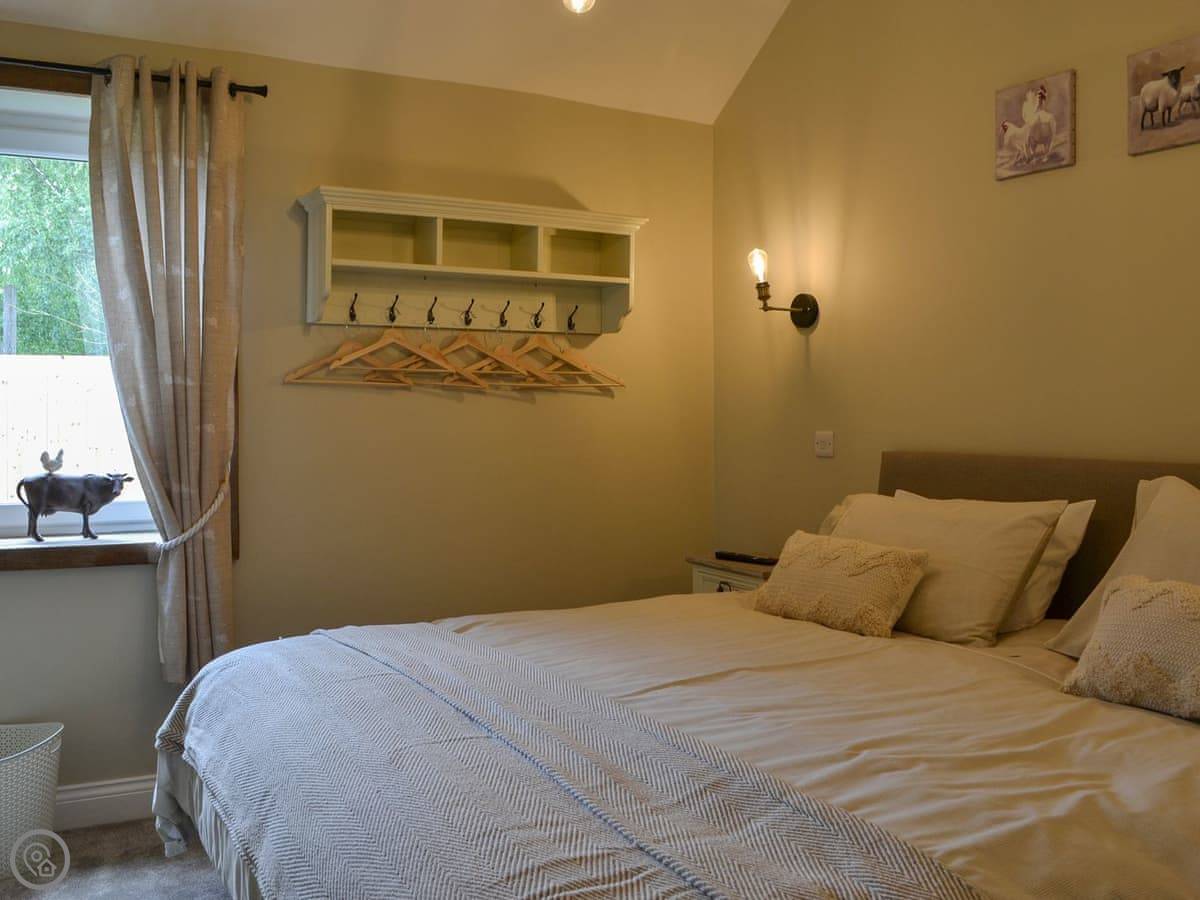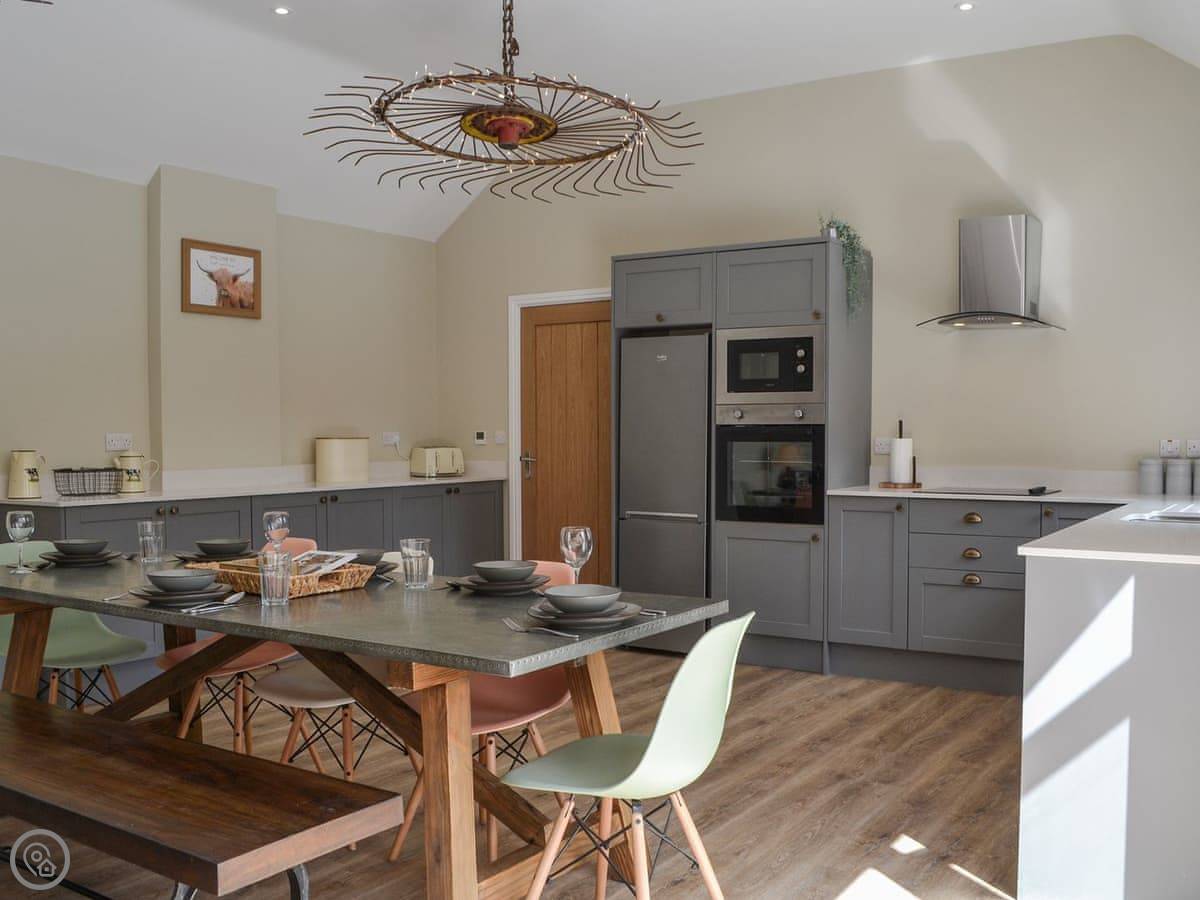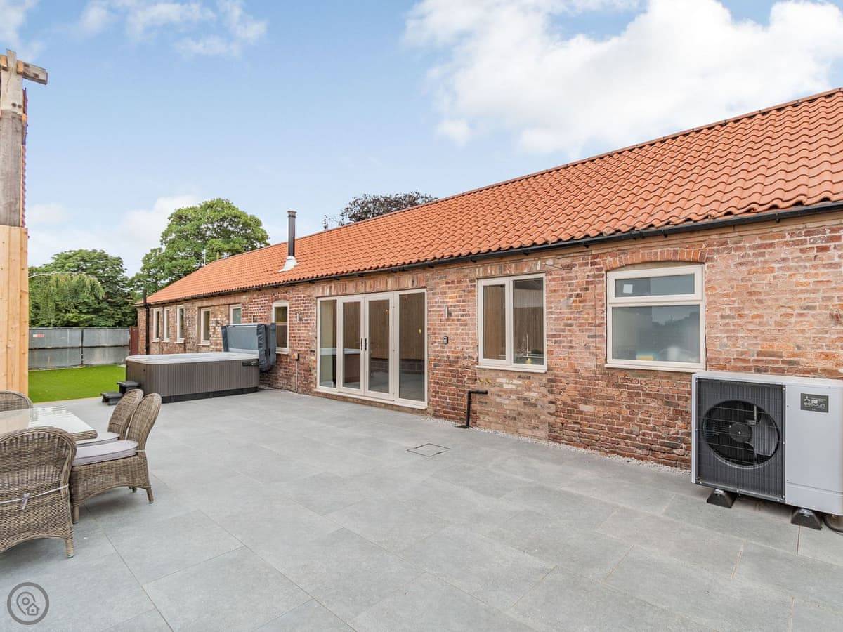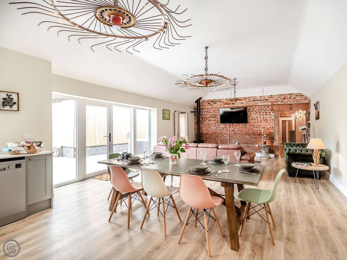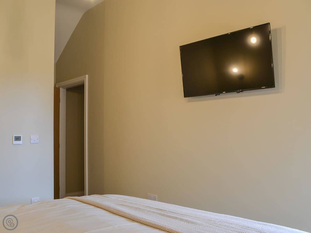 You've got a wood burner in the main room. There's a Smart TV. The kitchen has what you need. The garden is enclosed, with a patio and a hot tub. You can see the fields from there.