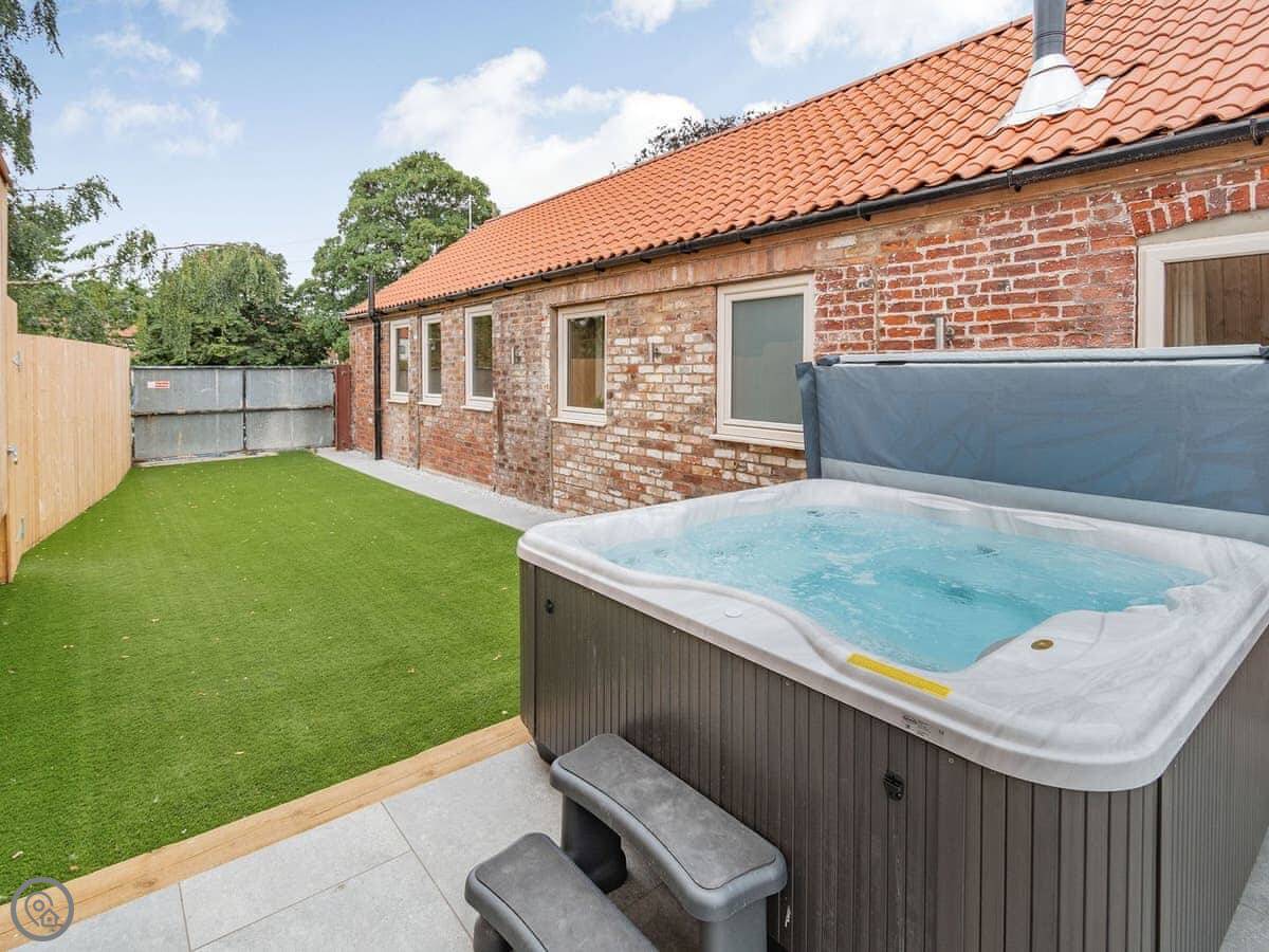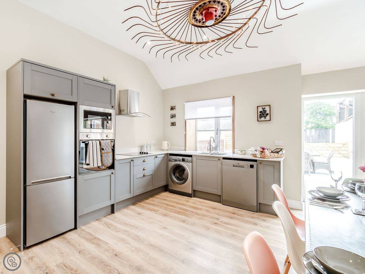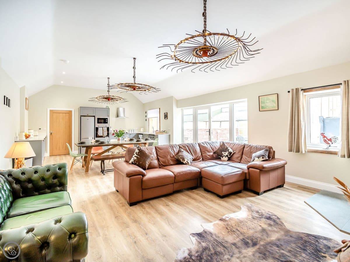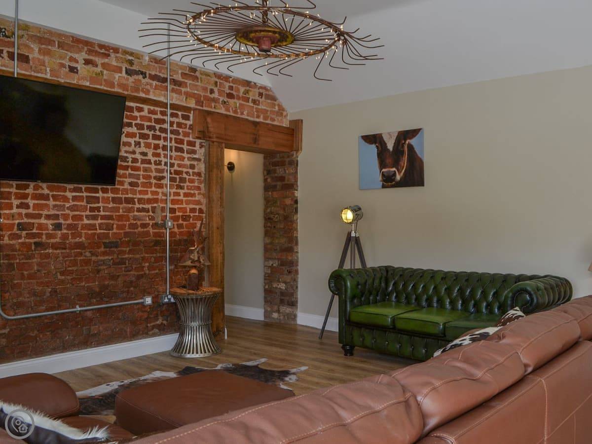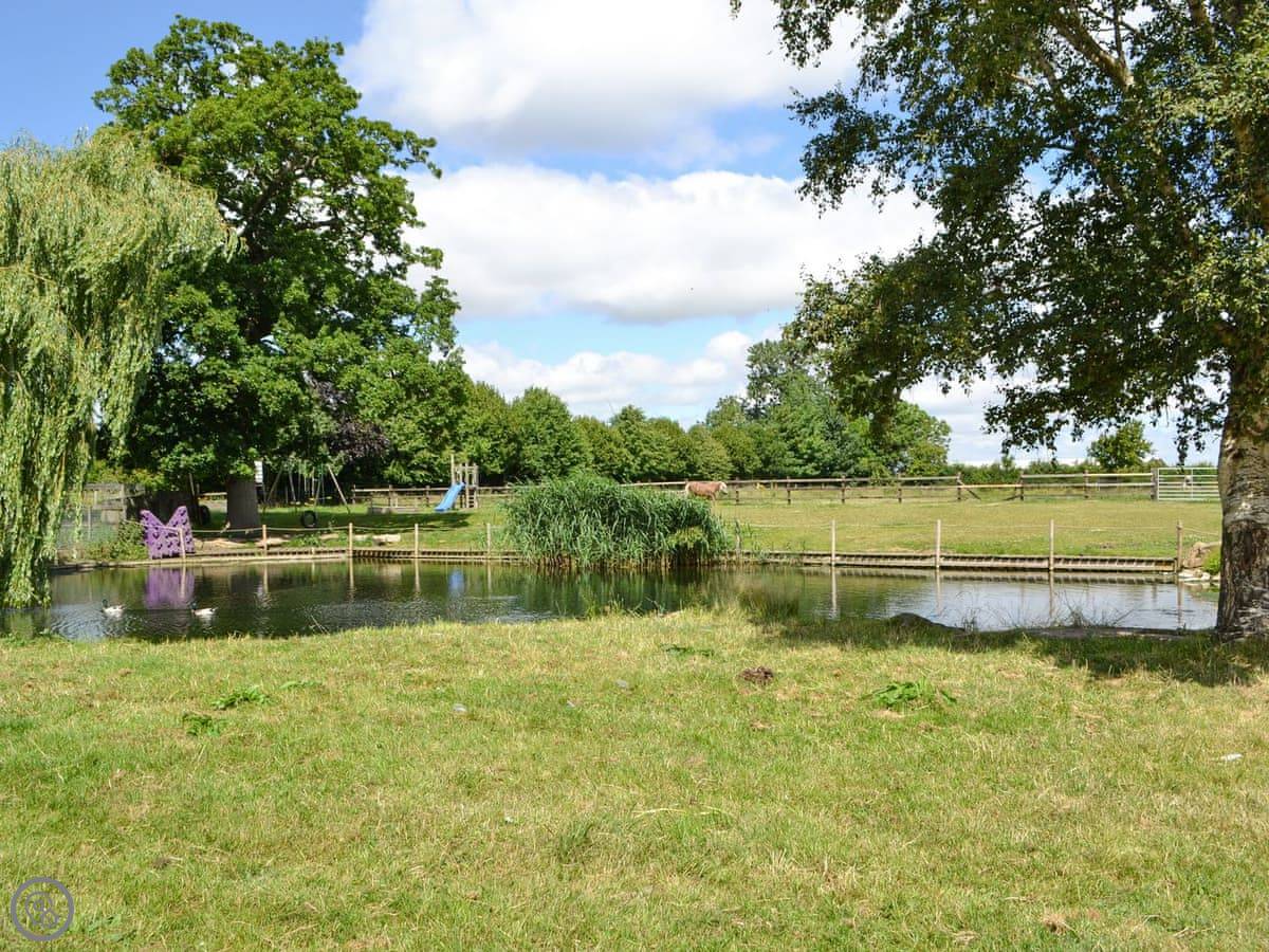 You've got a wood burner in the main room. There's a Smart TV. The kitchen has what you need. The garden is enclosed, with a patio and a hot tub. You can see the fields from there.