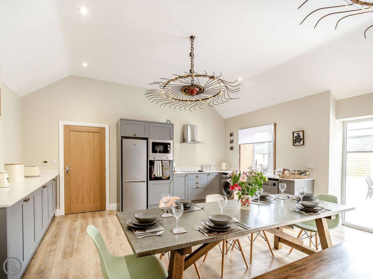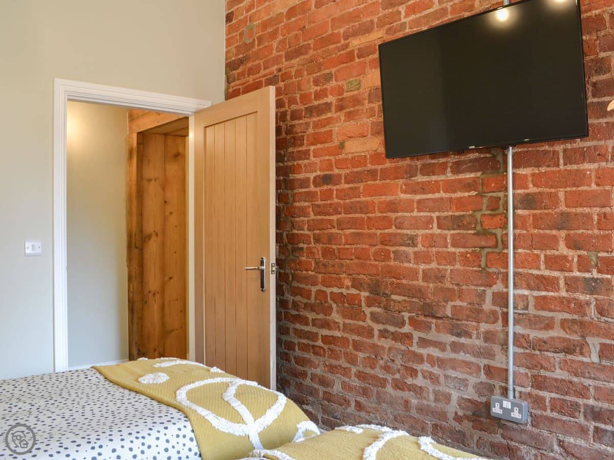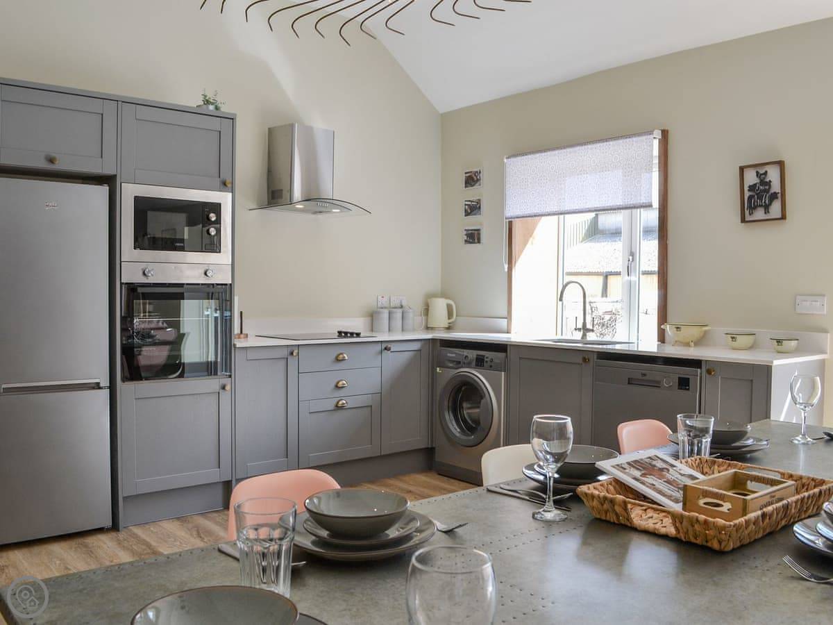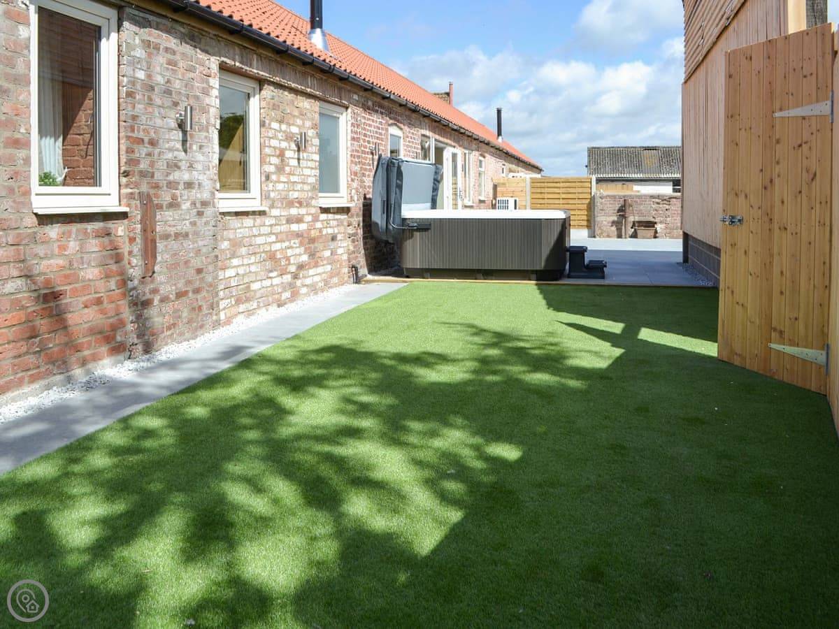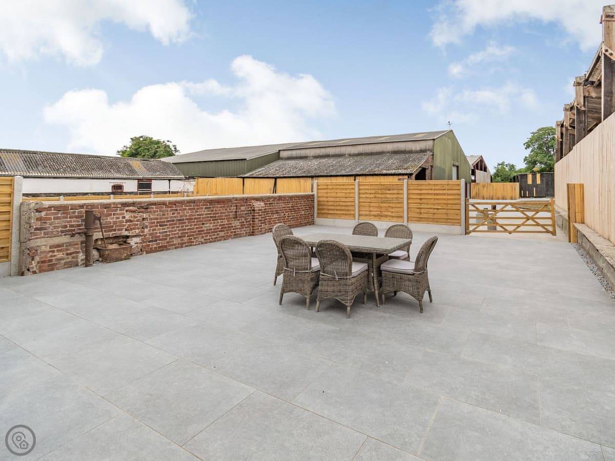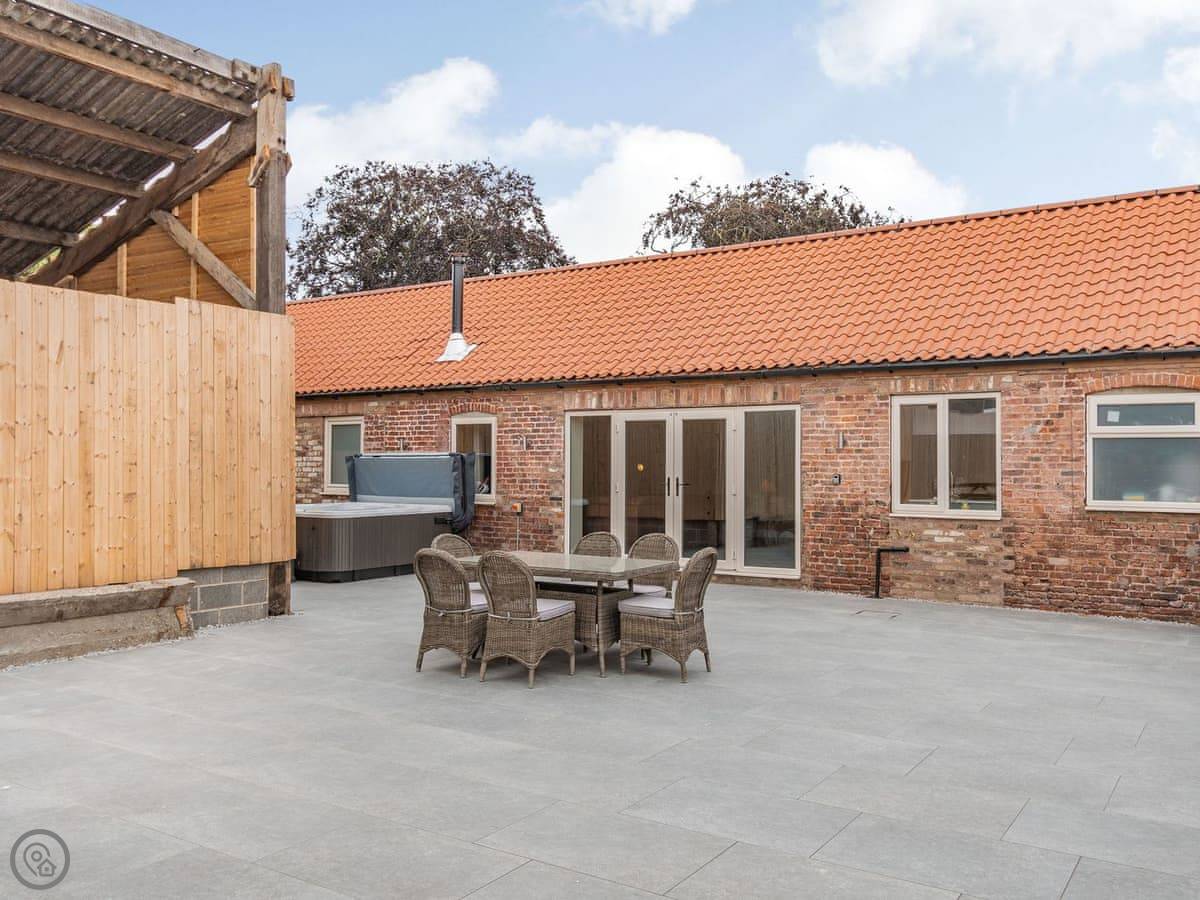 You've got a wood burner in the main room. There's a Smart TV. The kitchen has what you need. The garden is enclosed, with a patio and a hot tub. You can see the fields from there.