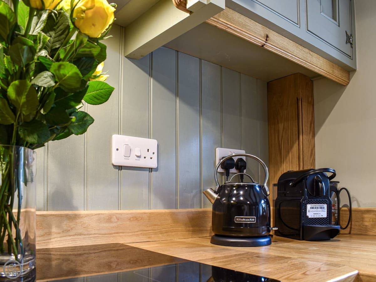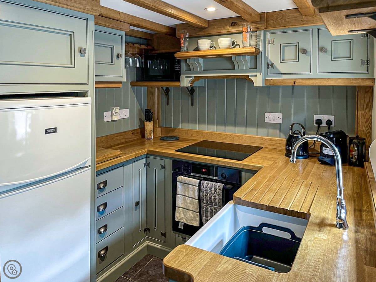 The kitchen is small, but it has a dishwasher. The sitting room has a dining table and an electric fire that looks like a wood burner. It’s warm. Outside there's a patio with a table and a barbecue. The view is nice. You get one parking space next to the cottage. There's an outhouse with a washing machine and a tumble dryer in it.