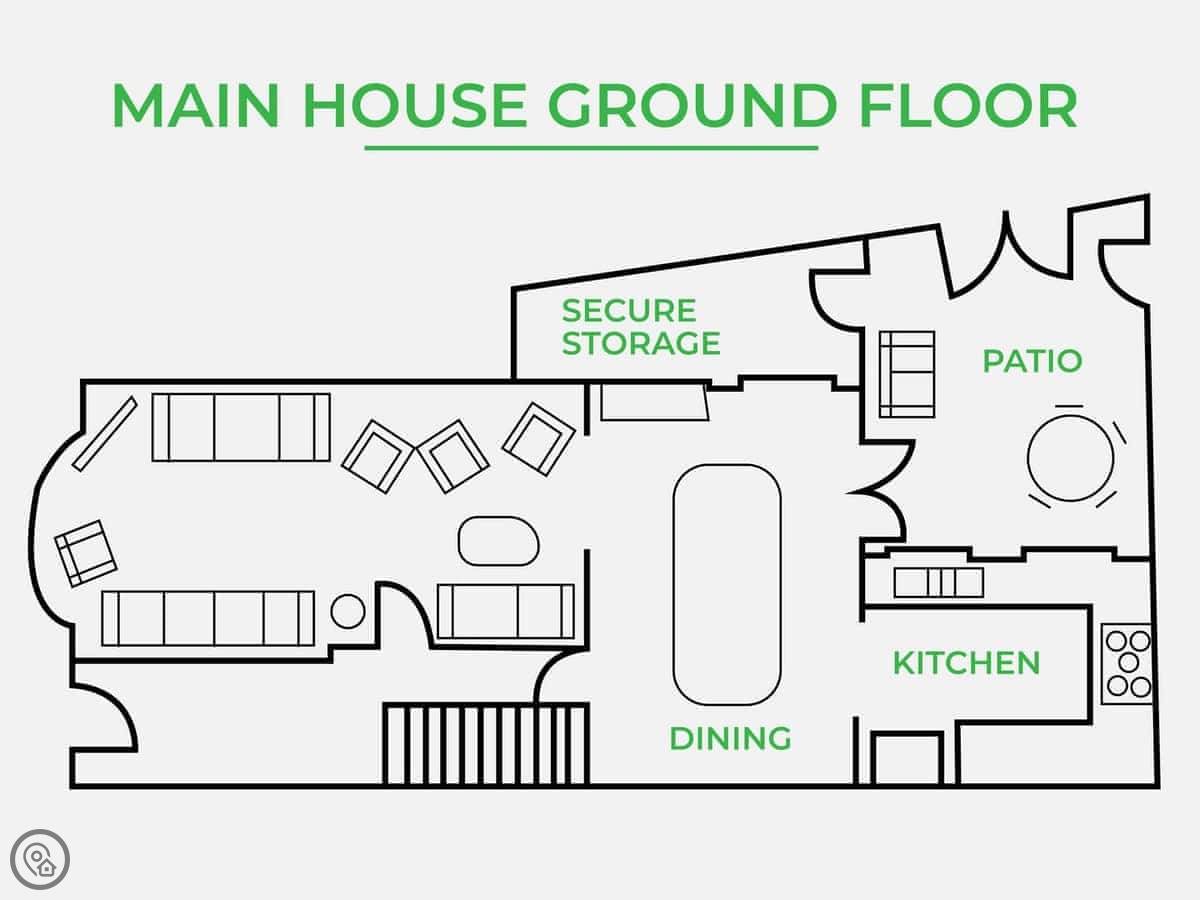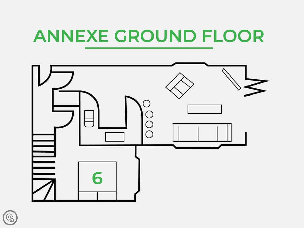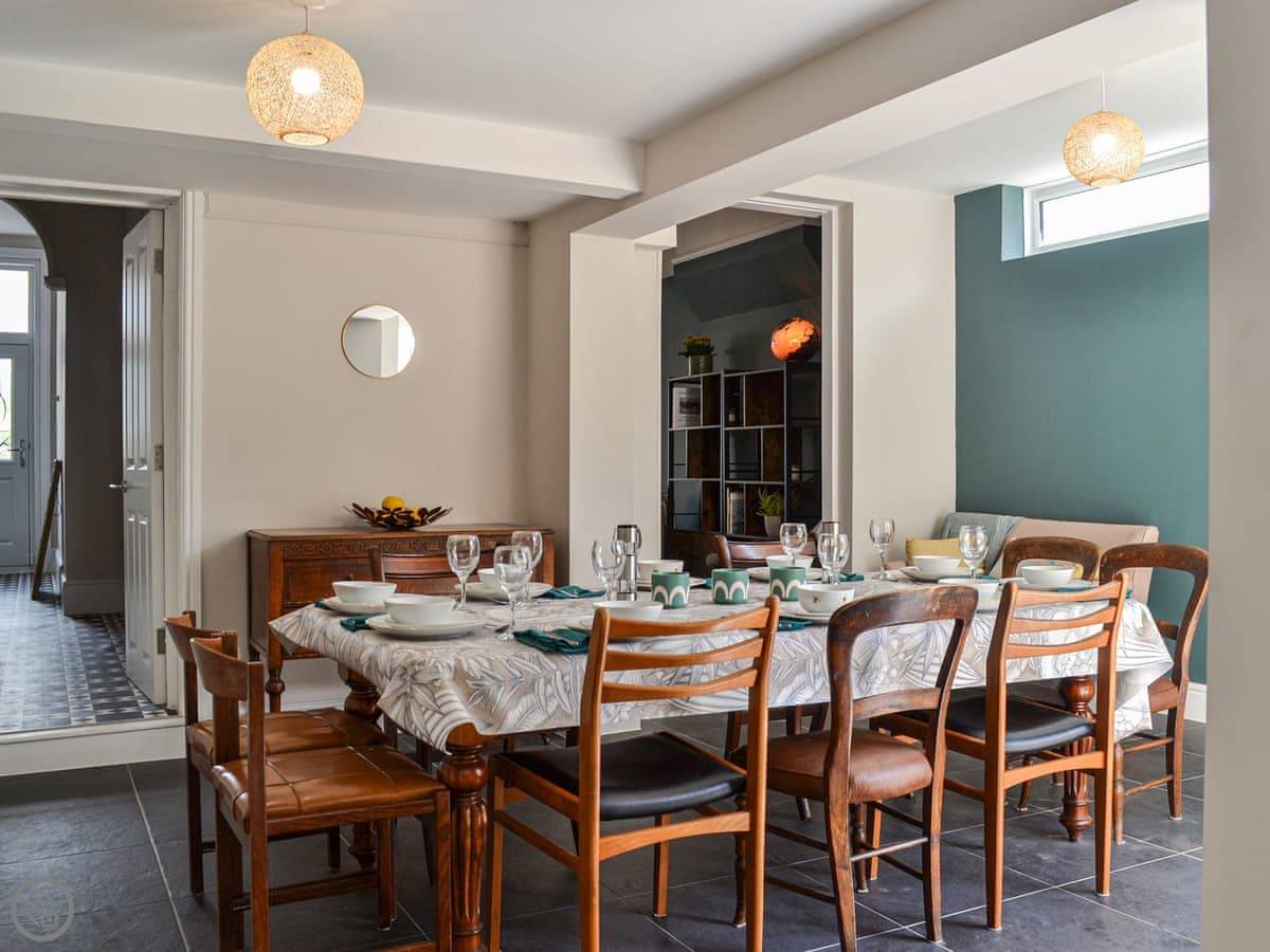 The house is actually two buildings. There's the main house and then a separate annexe in the garden. That means you've got two kitchens and two living areas. It works well for big groups because people can spread out. The main dining table seats eighteen.