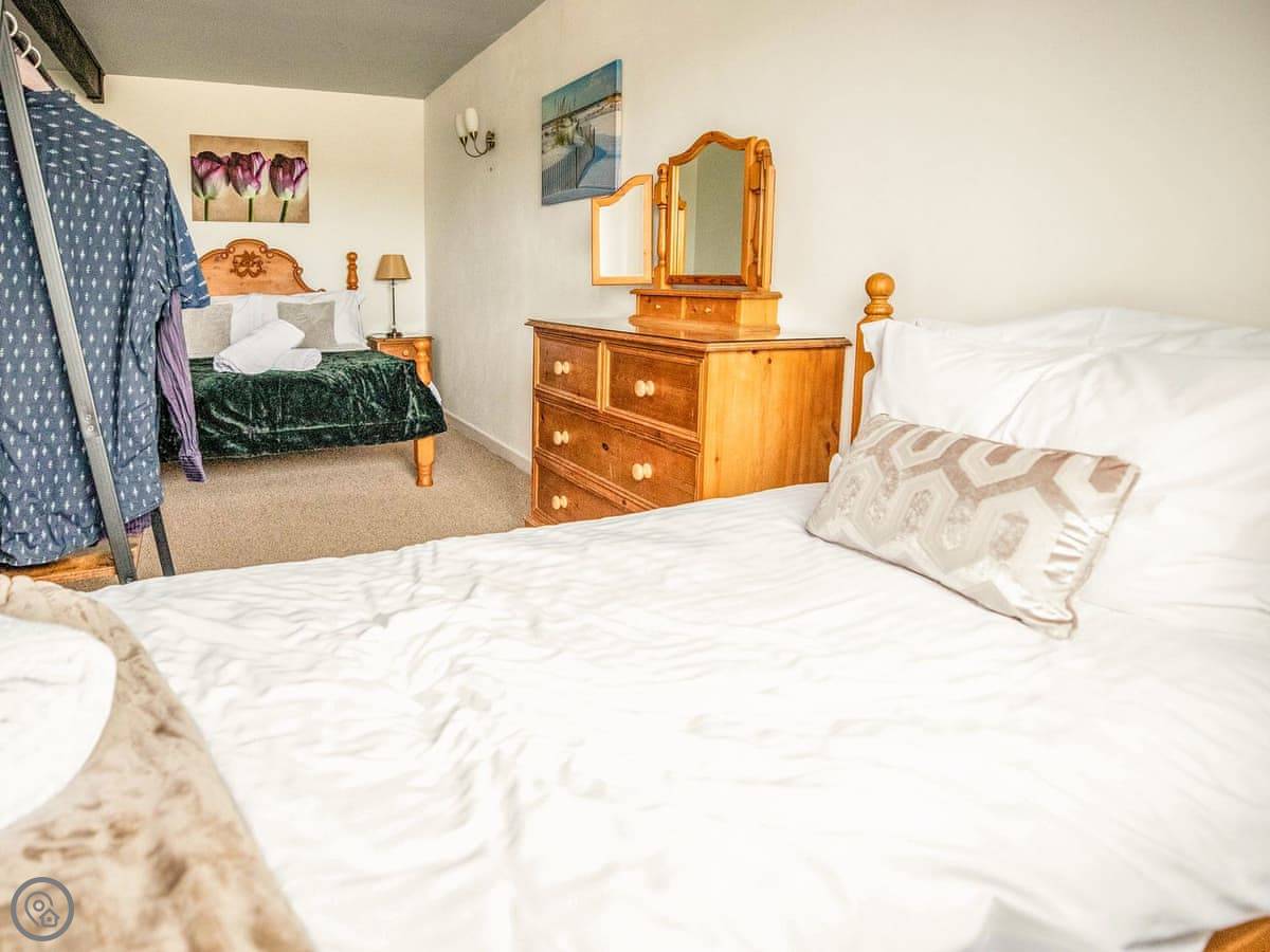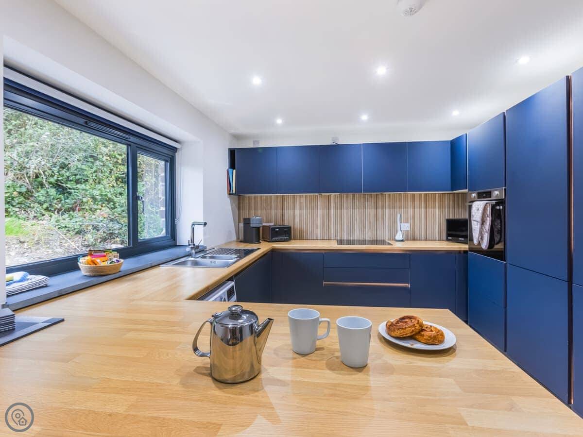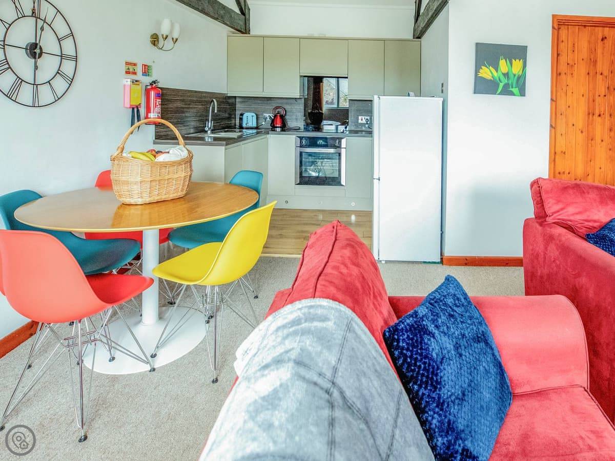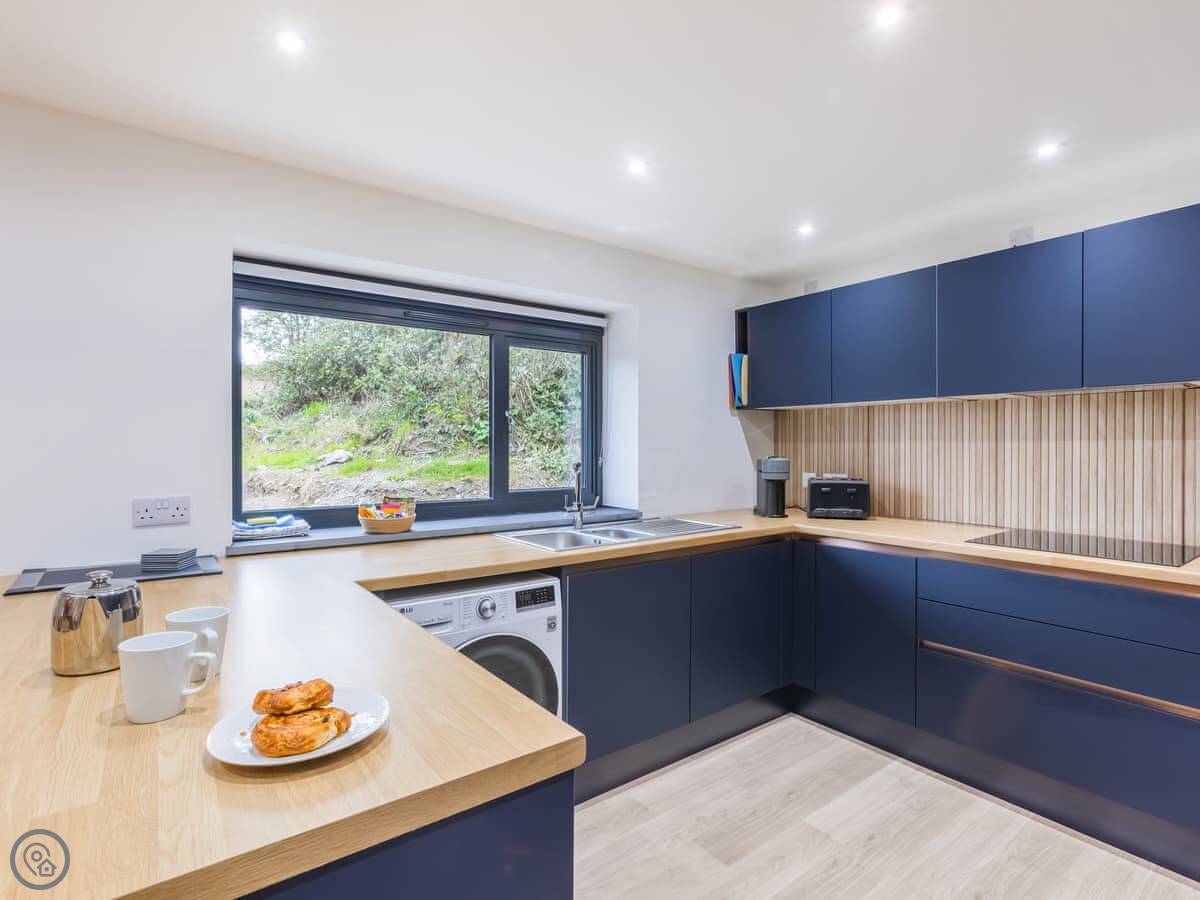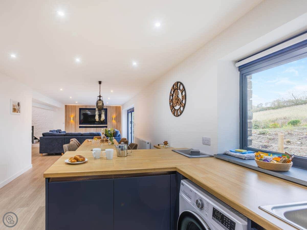 Inside, it's open plan. Washing machine, dishwasher, towels and bedding are all there. We allow up to two dogs. There's a cot if you need one.