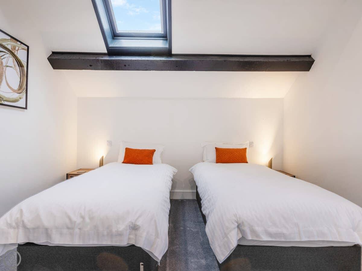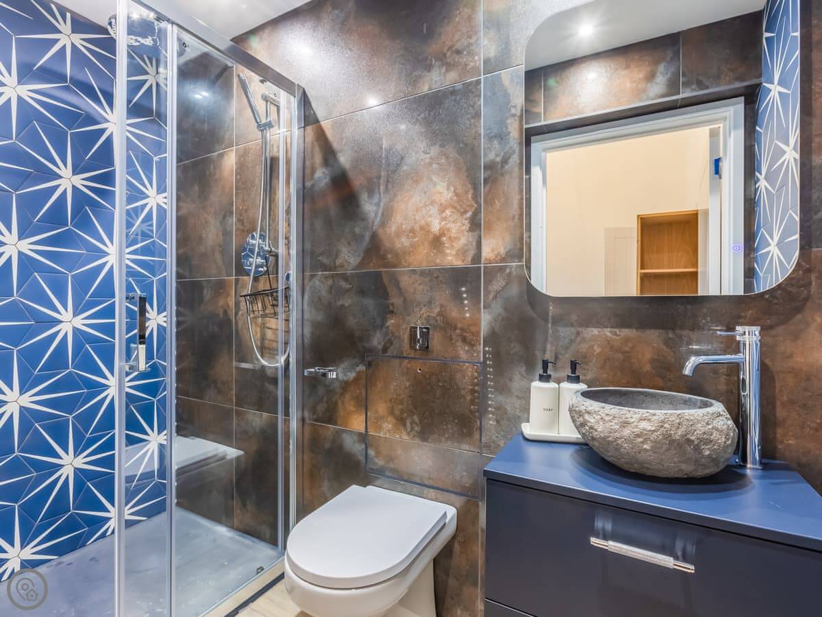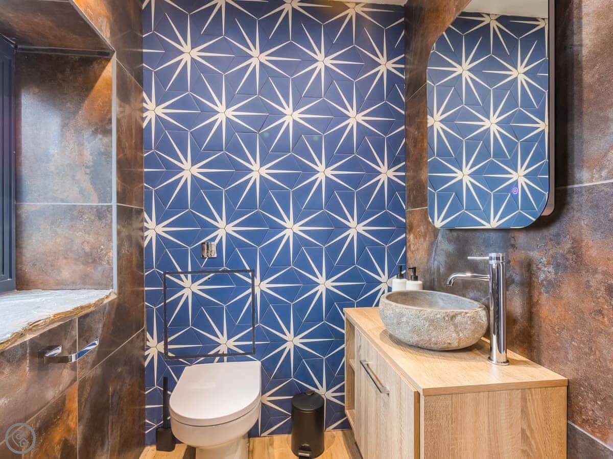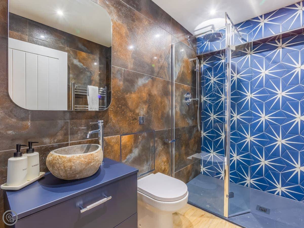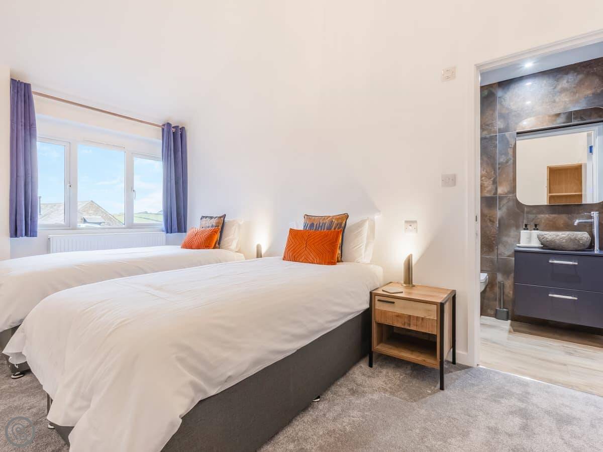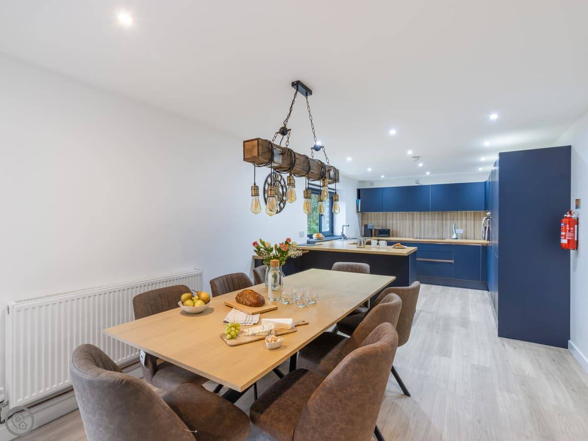The house sleeps eight. Four bedrooms, each with its own bathroom. It's got a 4 Star rating, so it's well equipped and comfortable. There's a games room with a pool table and things, but it's shared with the other cottages on site if they're booked. Good for kids. The entrance is wheelchair accessible and there's parking right there.