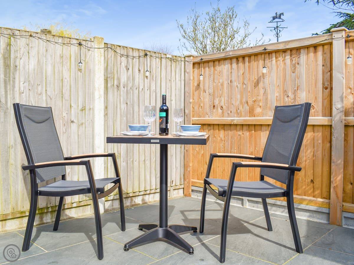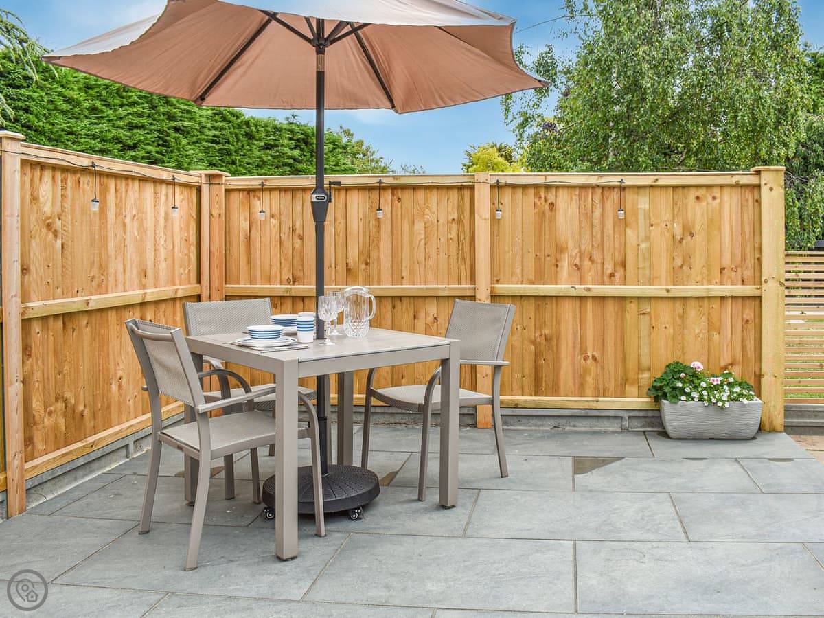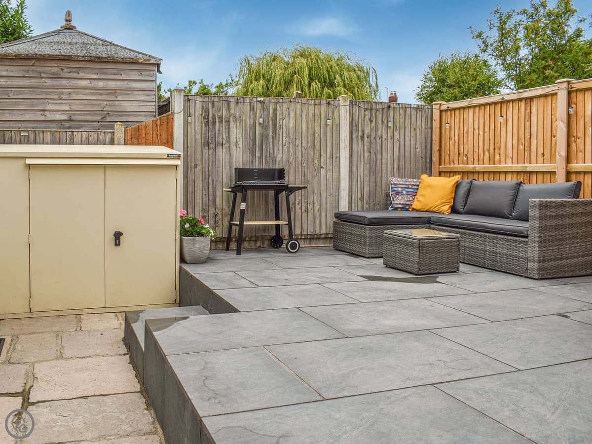 The patio gets the sun in the evening. There’s a table and chairs with a parasol, and a rattan corner sofa. The cushions for the sofa are stored in the bike shed when not in use. You can fit two bikes in there.