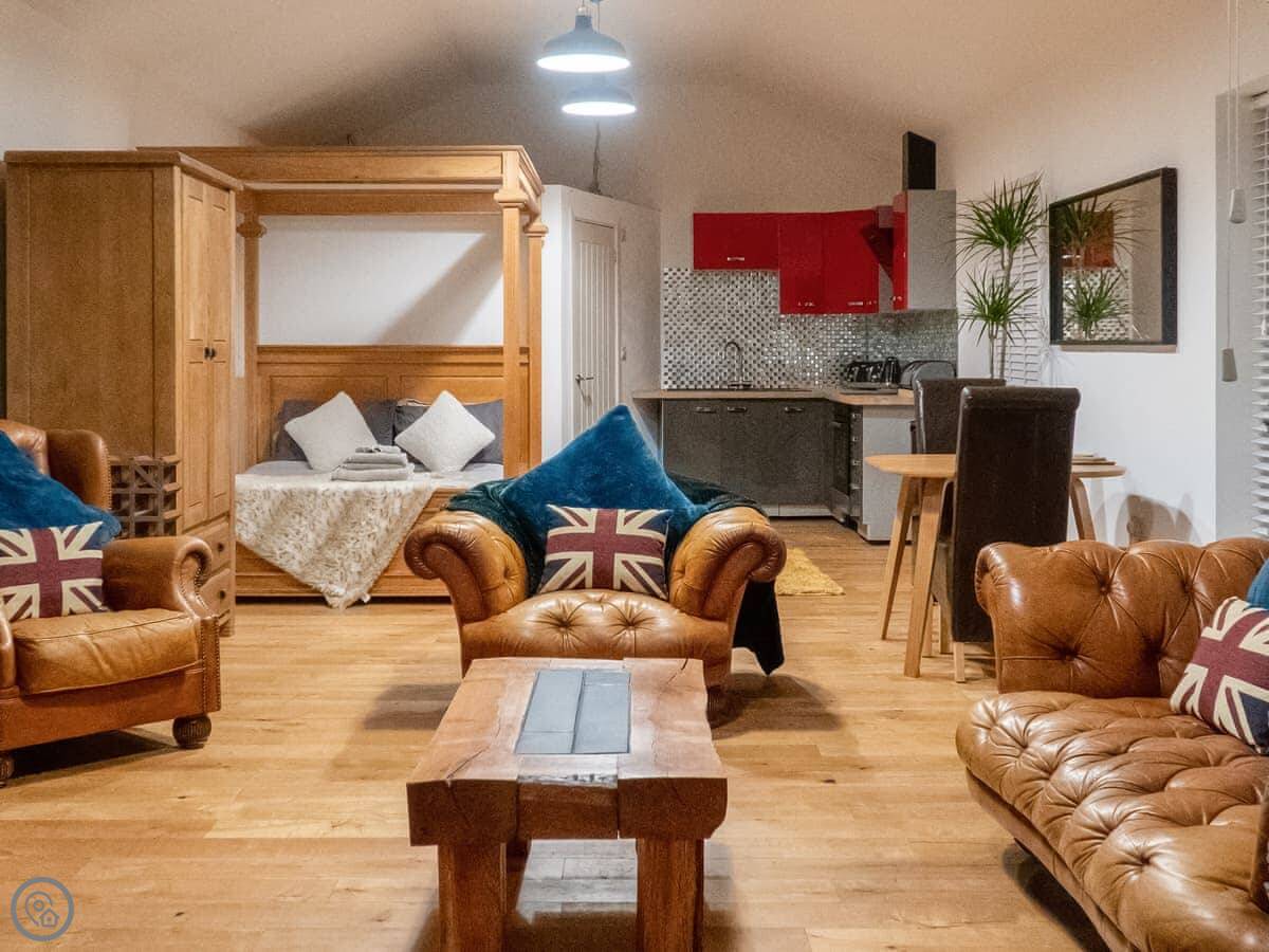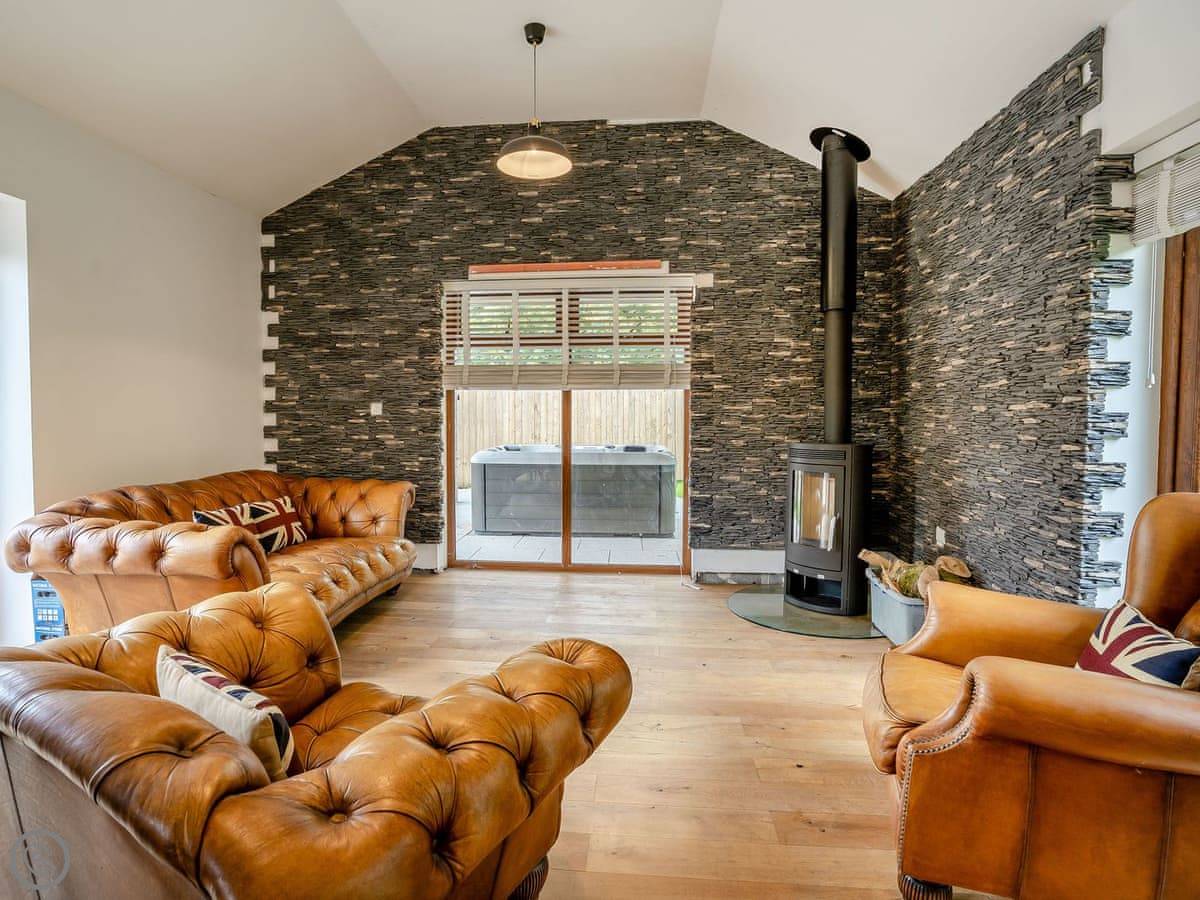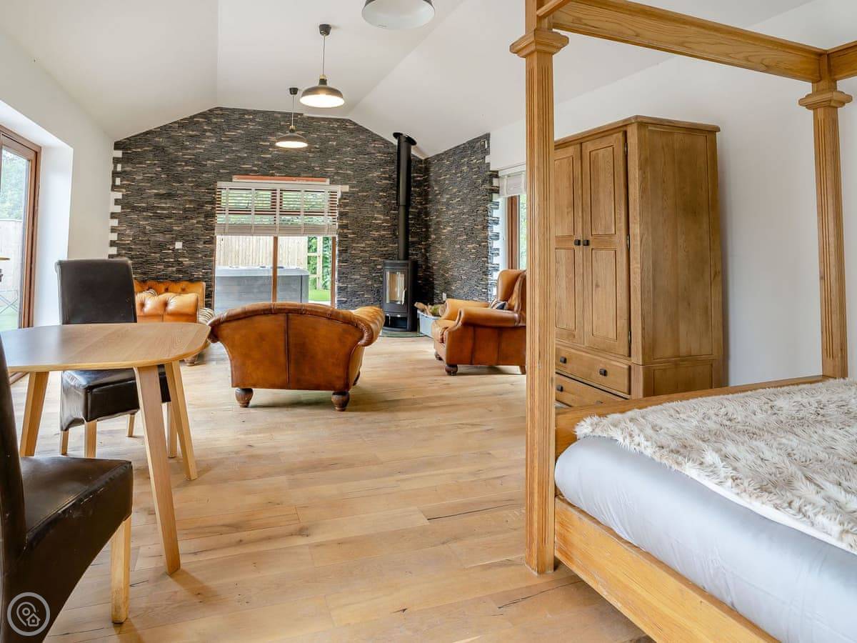 The cottage is detached, and it's got its own parking right there. There's an open plan living area, a woodburning stove, and a TV. Wifi is included. Outside, there's a barbecue.