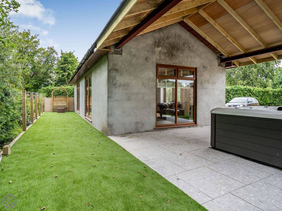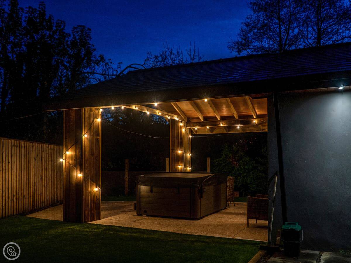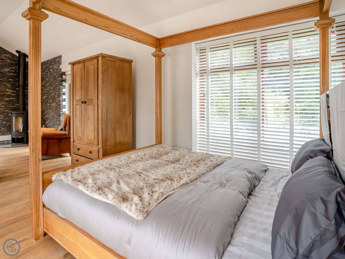 The cottage is detached, and it's got its own parking right there. There's an open plan living area, a woodburning stove, and a TV. Wifi is included. Outside, there's a barbecue.