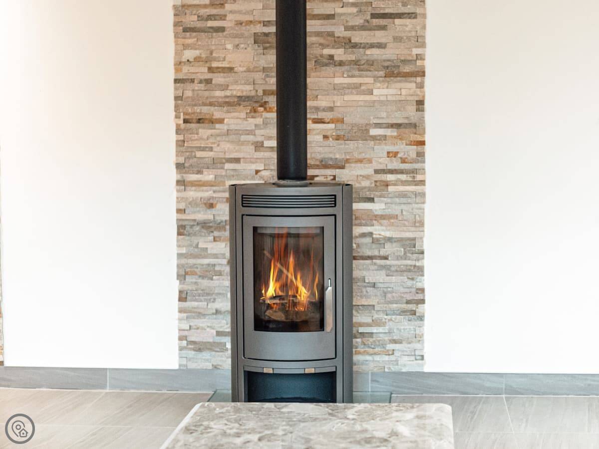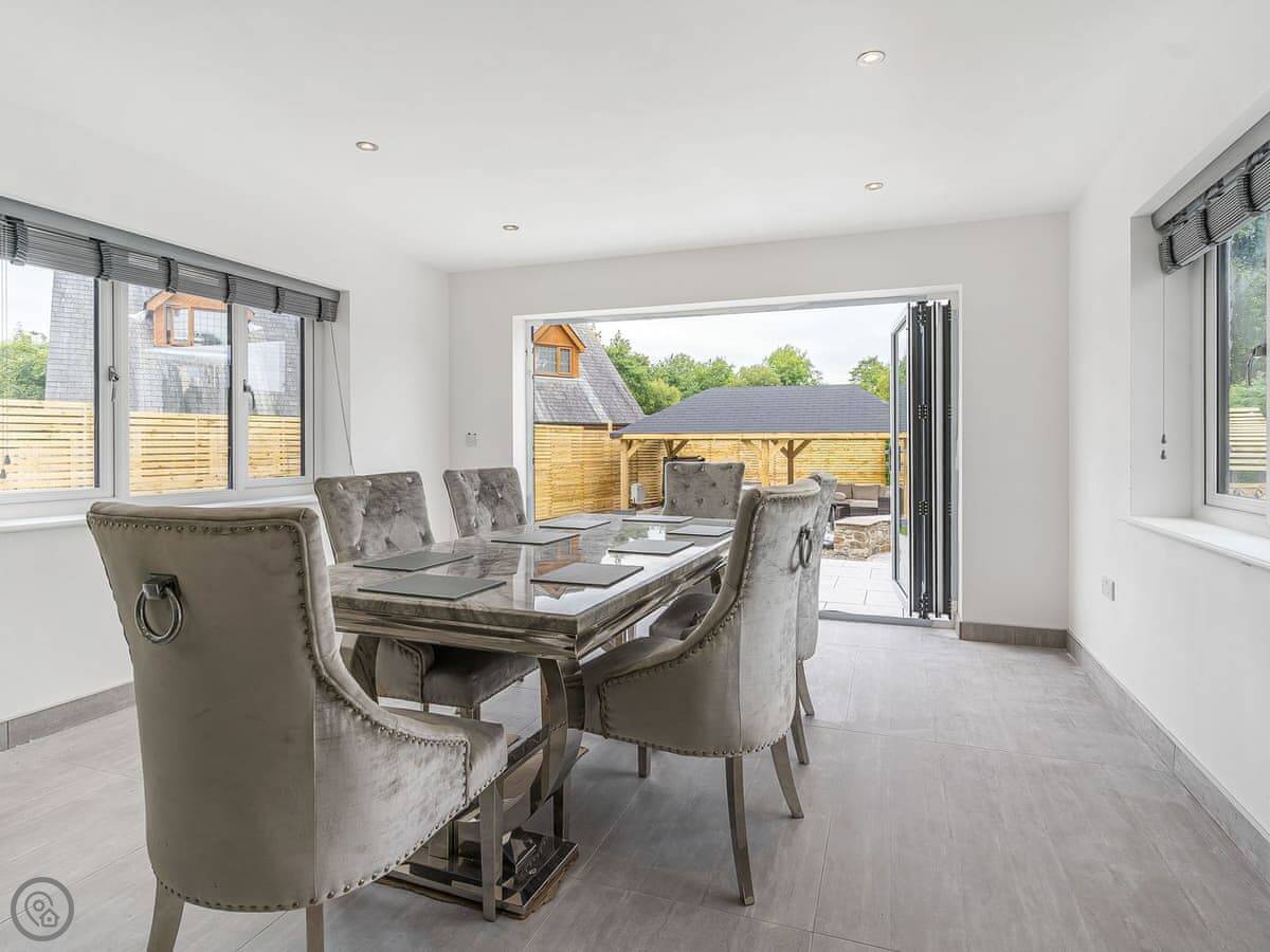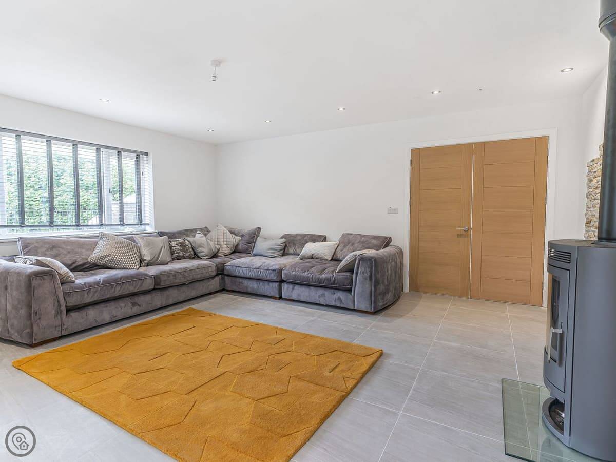 The main living space is an open-plan kitchen, dining, and sitting room. There’s a wood burner. The kitchen has a breakfast bar and a table for eight. Bi-fold doors open onto the garden.