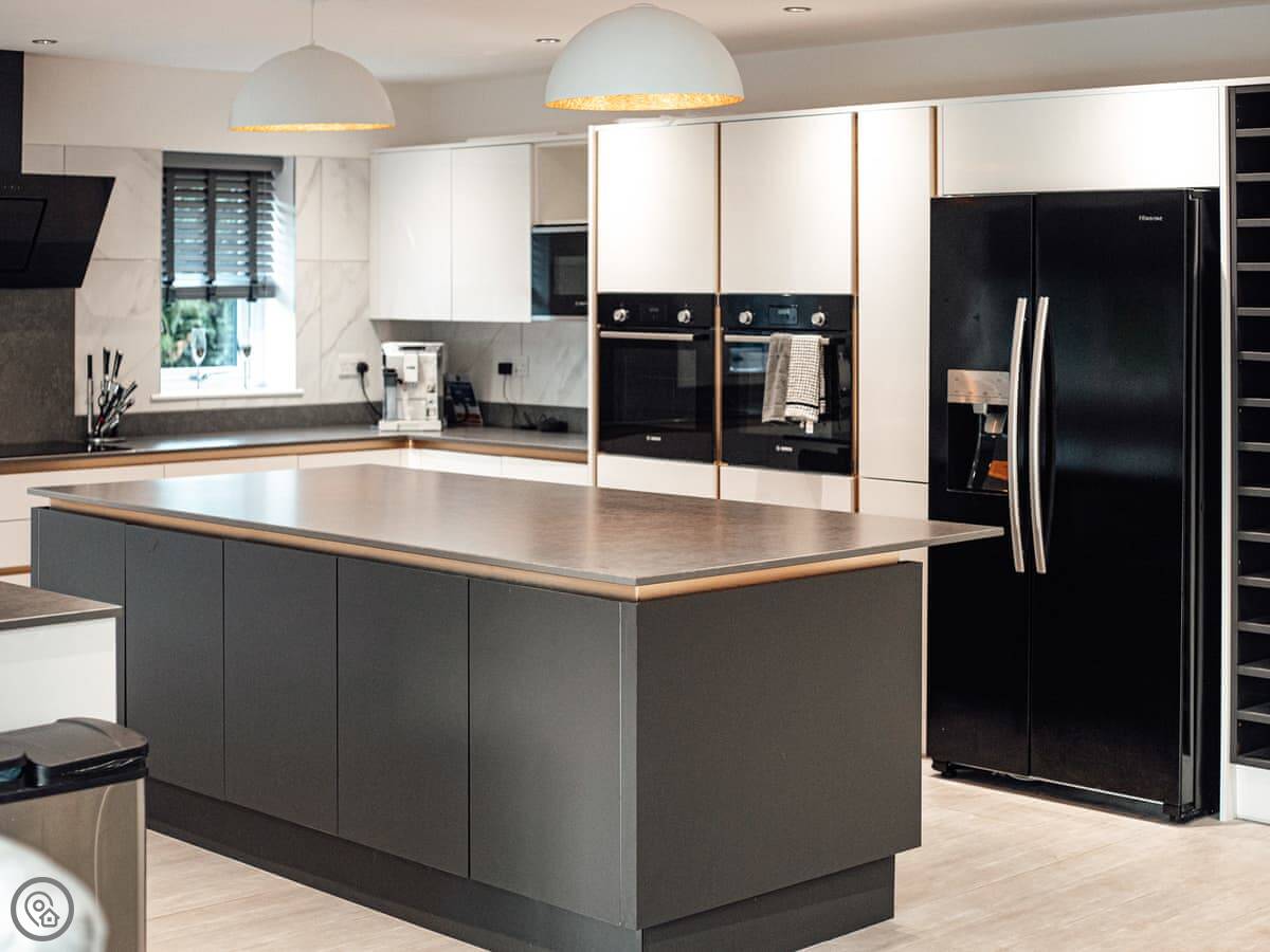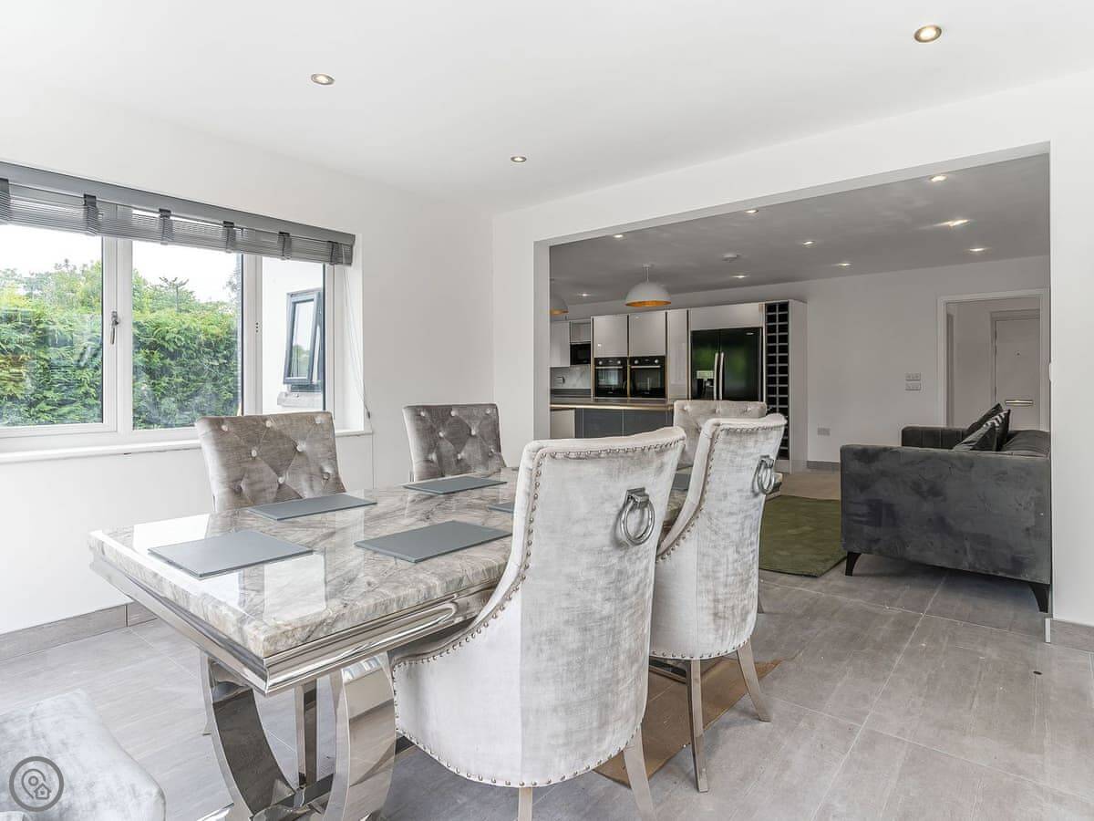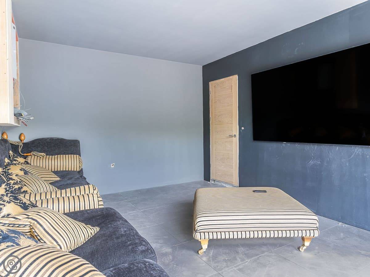 The main living space is an open-plan kitchen, dining, and sitting room. There’s a wood burner. The kitchen has a breakfast bar and a table for eight. Bi-fold doors open onto the garden.
