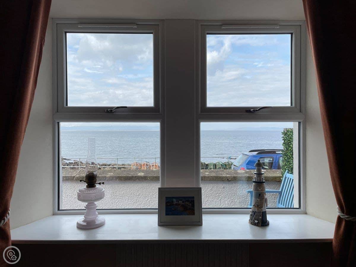 The garden wraps around the cottage. It's mostly lawn. The front bit is a paved sitting area, which is where everyone ends up to watch the water. You see fishing boats coming and going. We've seen dolphins from there, and seals are common. You might see more with binoculars.
