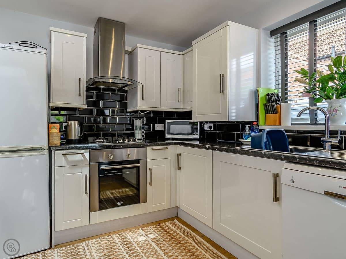 It lists a lot of facilities. The main ones are: there's a dishwasher, a washing machine, WiFi, a TV, and parking right outside. Bedding and towels are included. It takes two well-behaved pets.