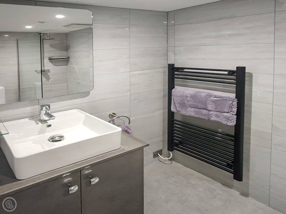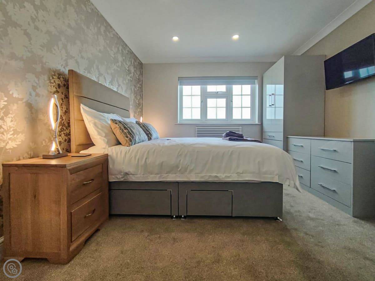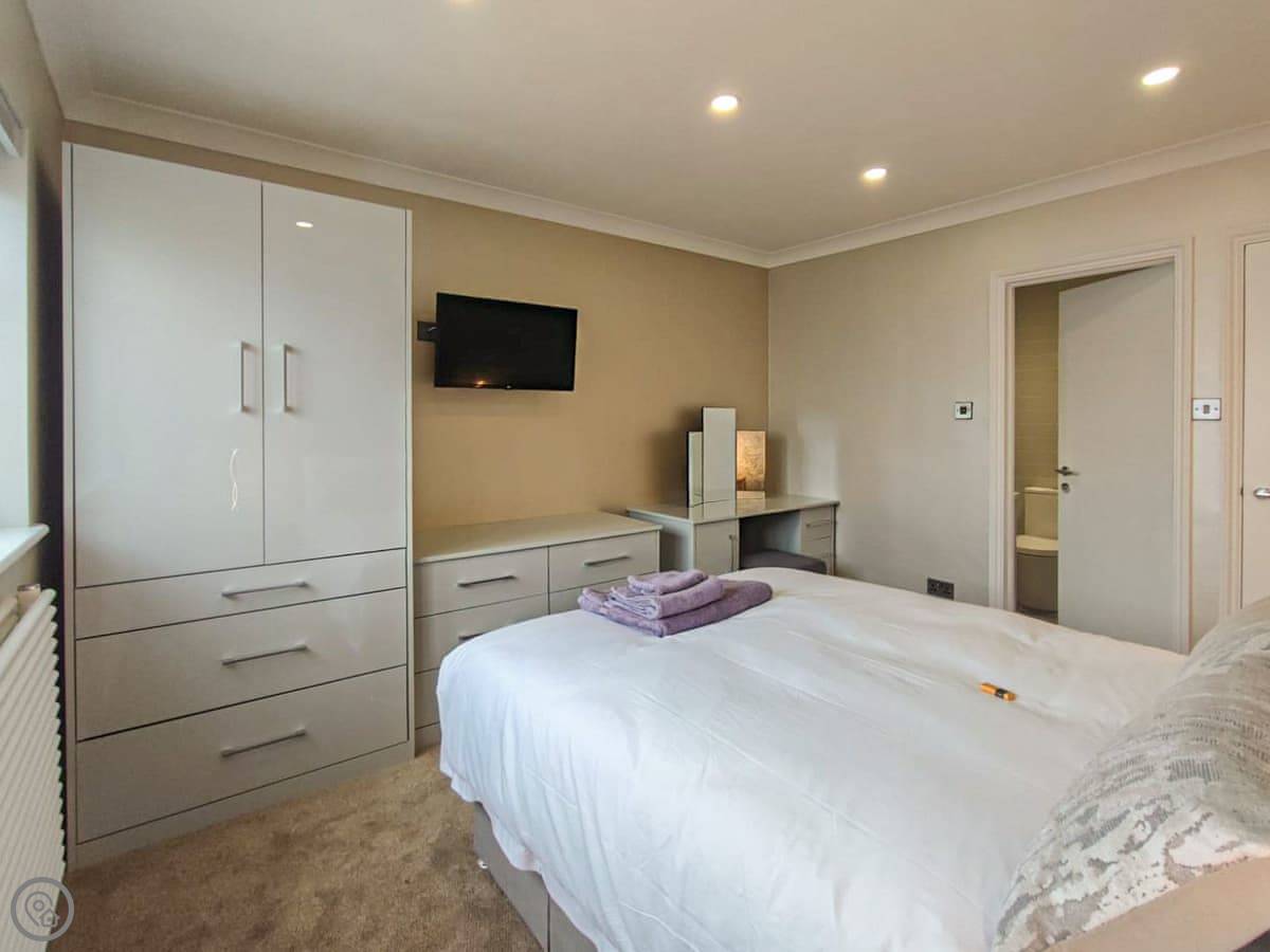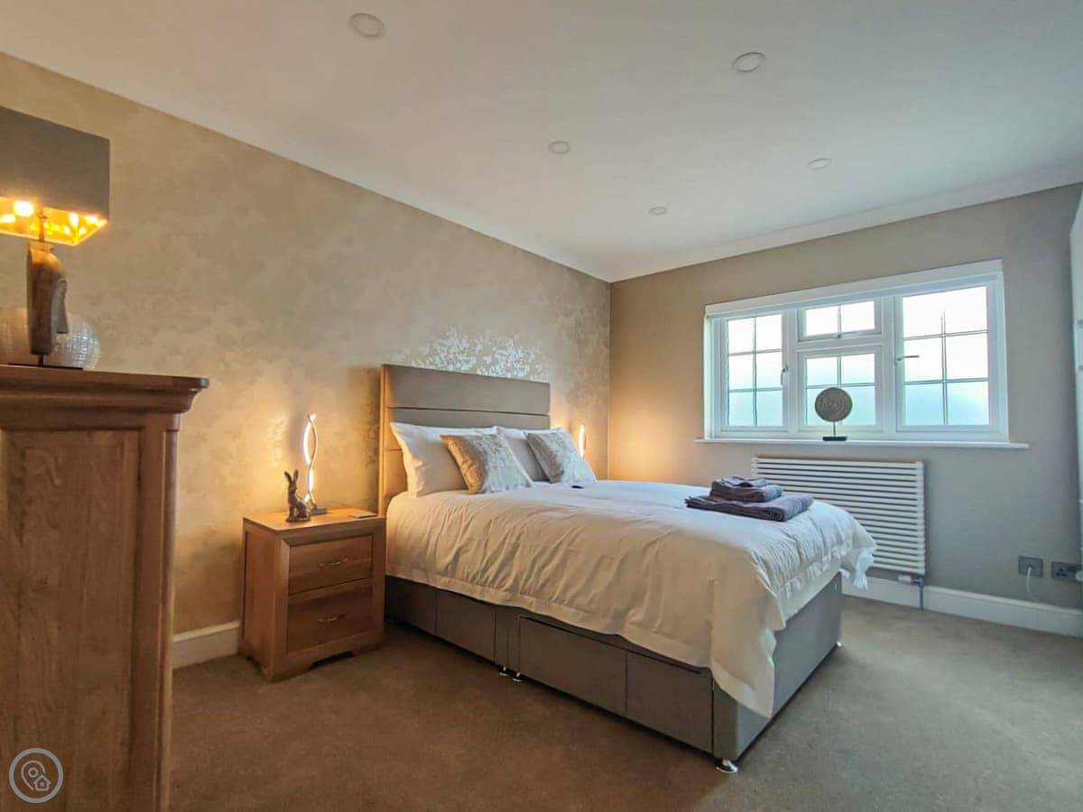 It's for four people. Two bedrooms, both with double beds and their own bathrooms. It's got a 5 Star rating, which means everything is new and well finished. The sofas in the lounge are electric, so you can put your feet up easily.