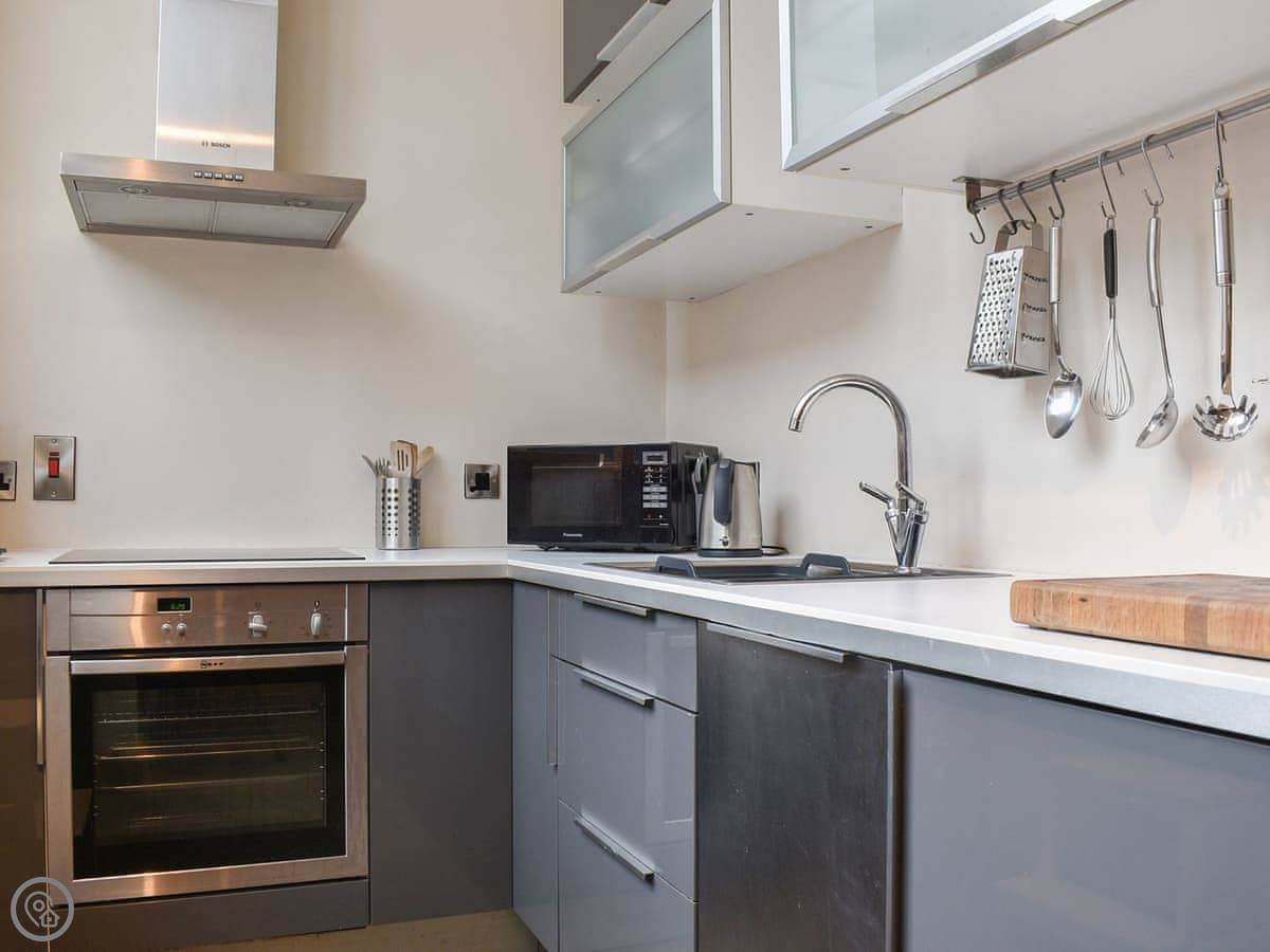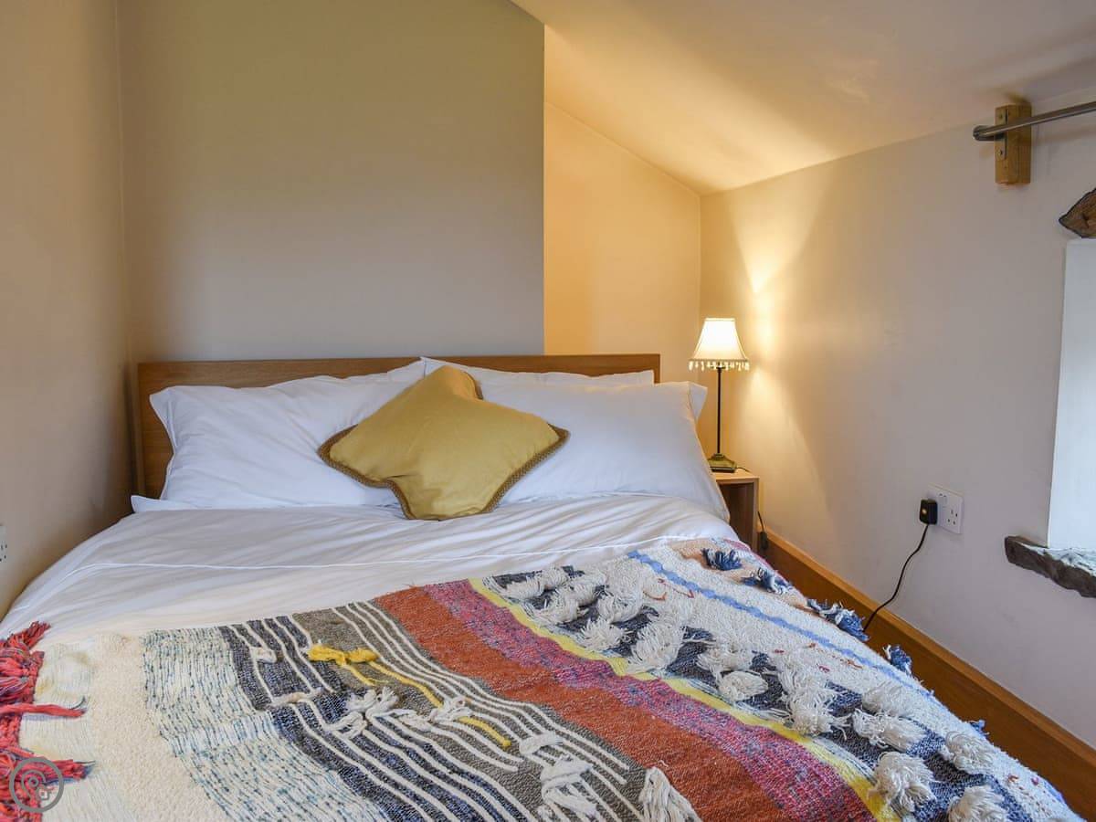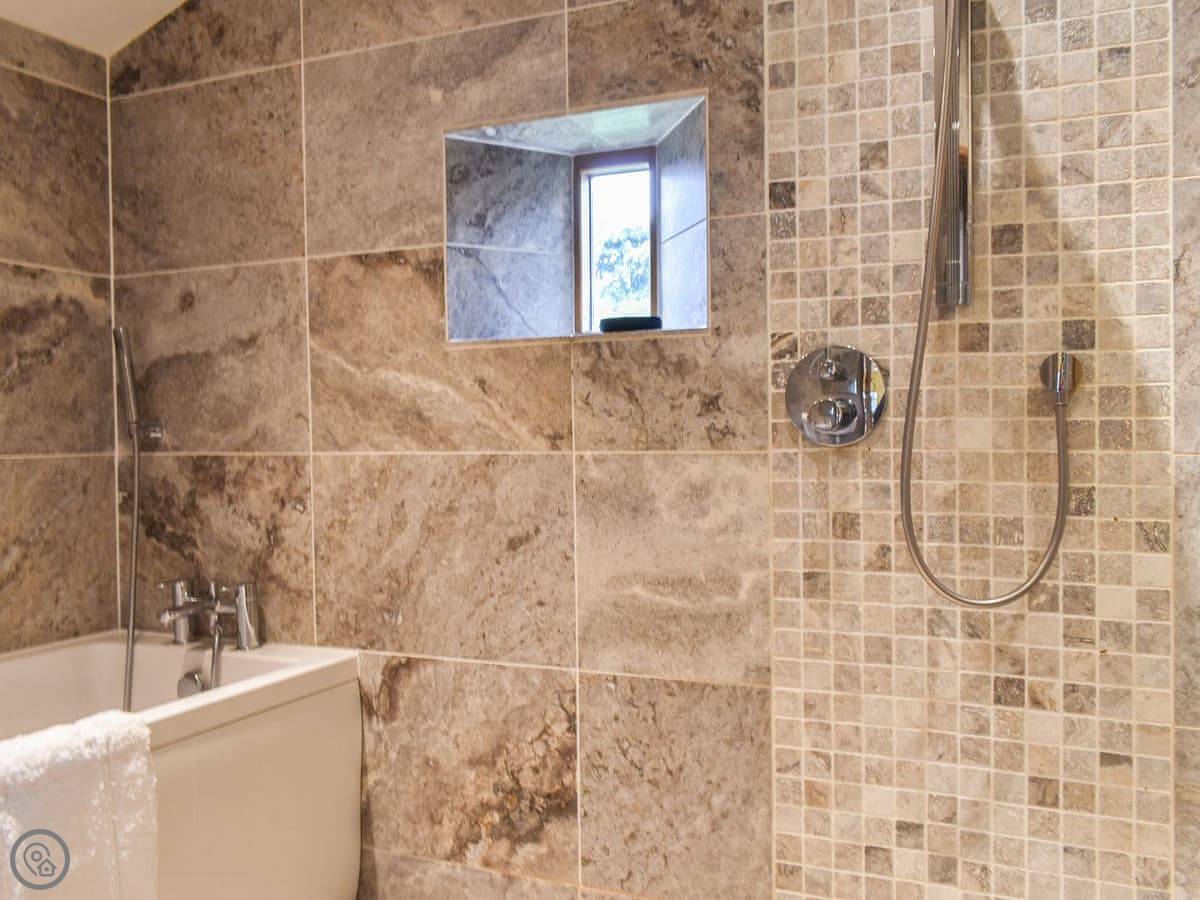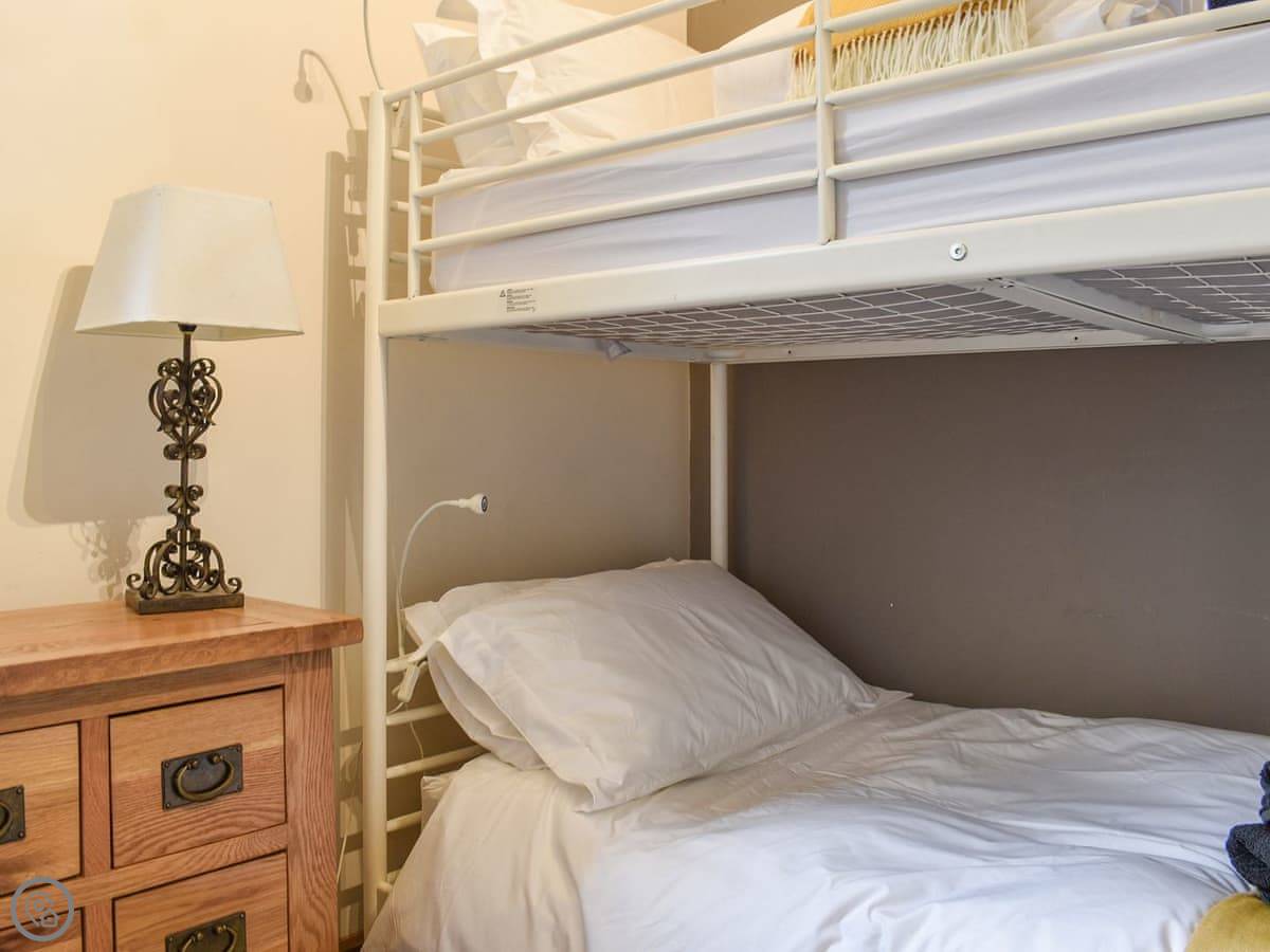 Step down onto the lower ground floor and you’ll find an open plan living space, with a well-equipped modern kitchen. There is a dining table with four chairs, a warming wood burner, Smart TV, and ample comfy seating. Patio doors take you out onto the enclosed back garden where outdoor furniture is positioned well to take in the amazing views. There is a small bedroom on the lower ground floor with single sized bunk beds, and a neatly tucked away washing machine should you need it. The ground floor wet room has separate bath, basin and open shower. The main double bedroom has en-suite facilities with a cubicle shower.