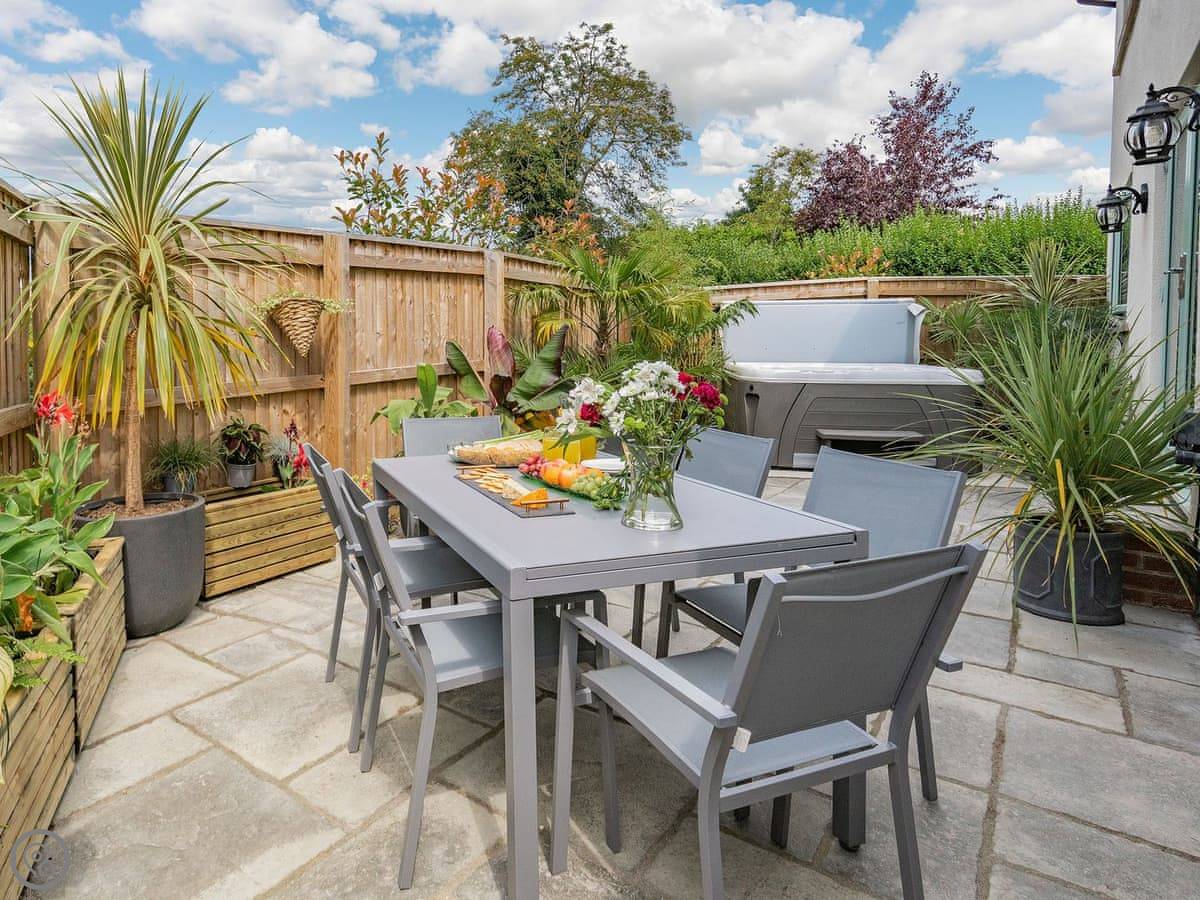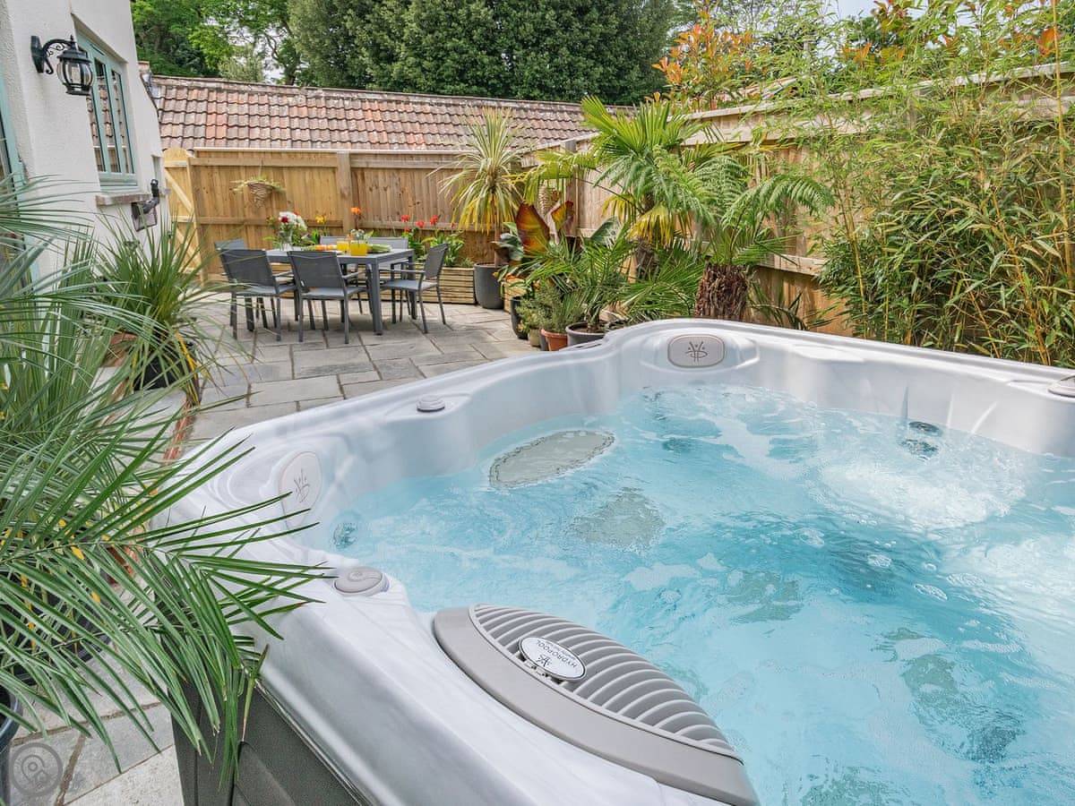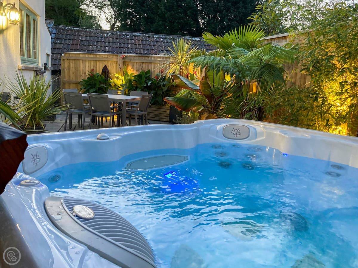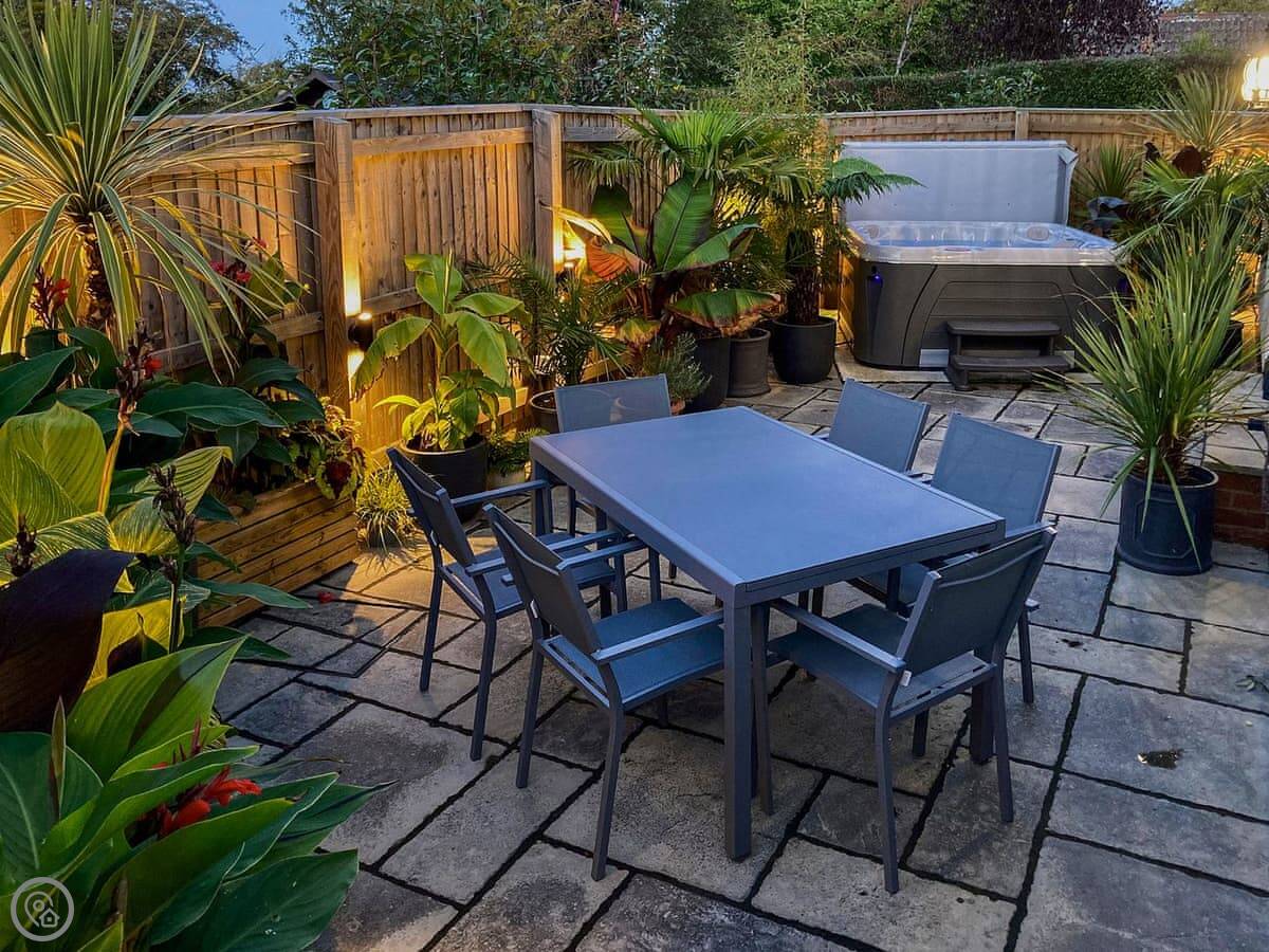 Downstairs, the kitchen is big and open plan, with a table for six. The sitting room is separate. Off the kitchen there's a garden room with doors out to the back courtyard. That's where the hot tub is. The garden is enclosed, which is handy if you've got kids or a dog.