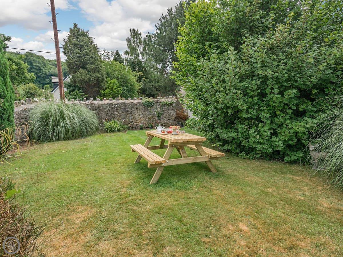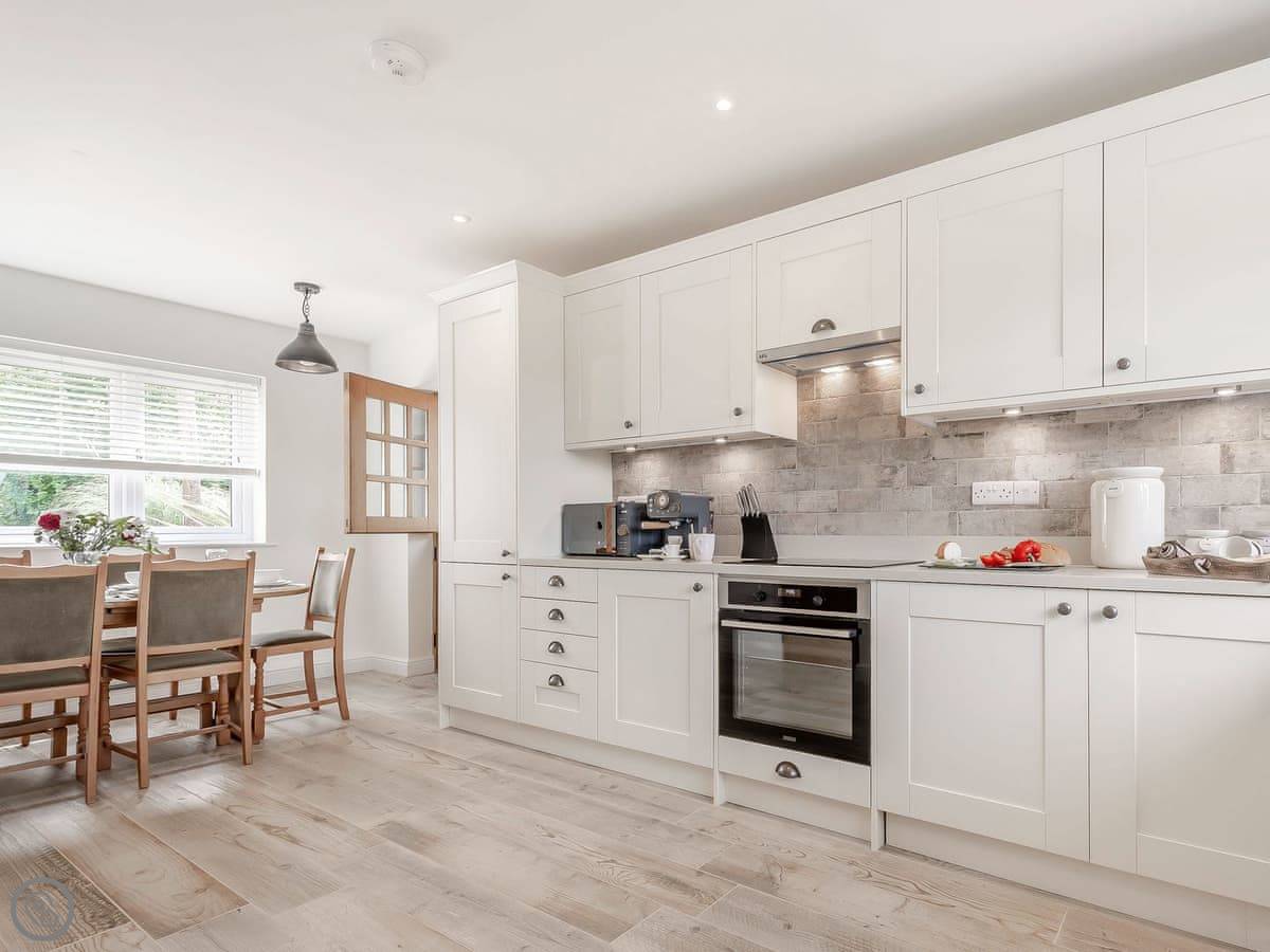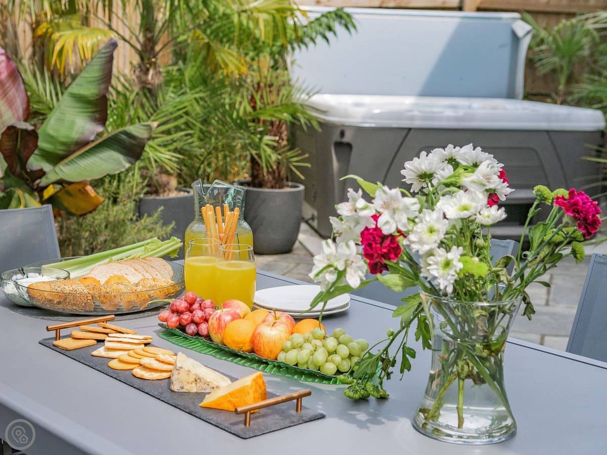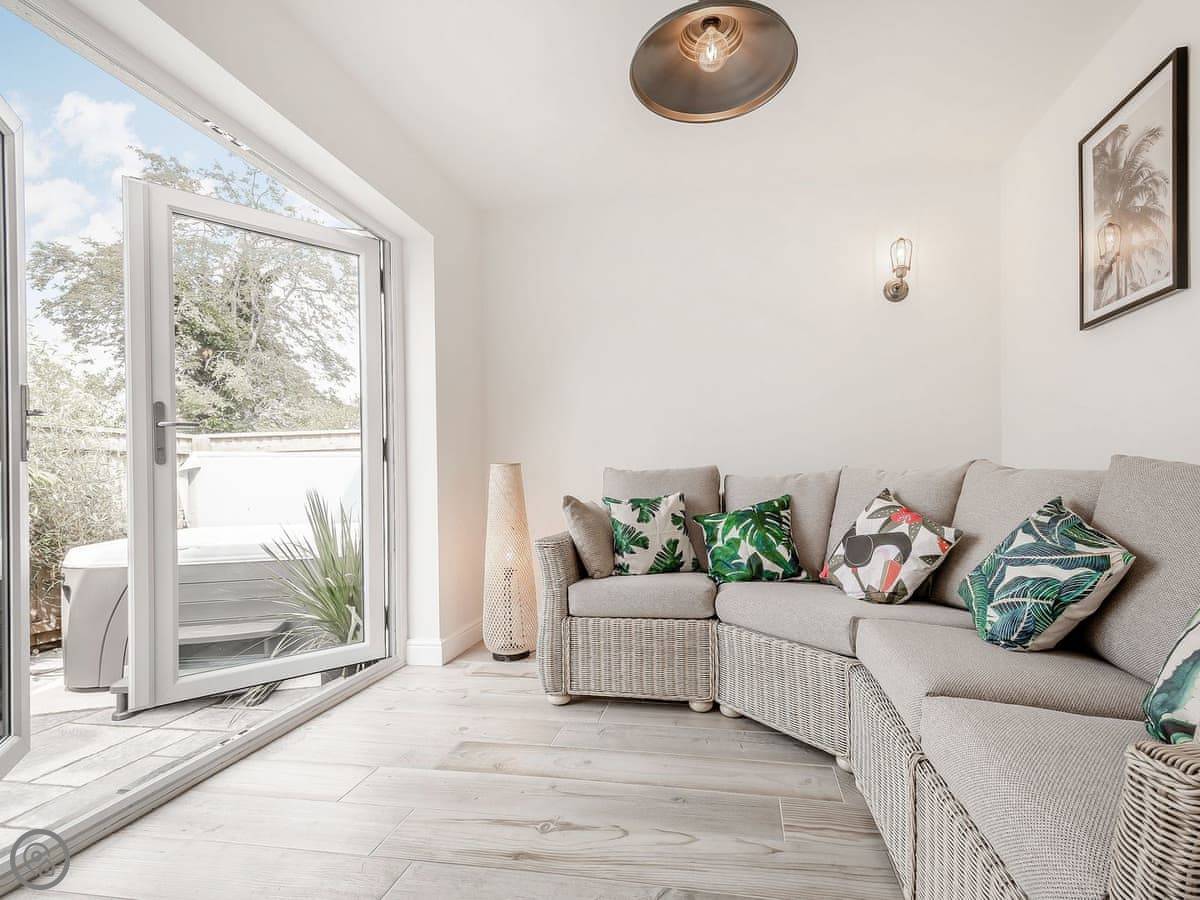 Downstairs, the kitchen is big and open plan, with a table for six. The sitting room is separate. Off the kitchen there's a garden room with doors out to the back courtyard. That's where the hot tub is. The garden is enclosed, which is handy if you've got kids or a dog.
