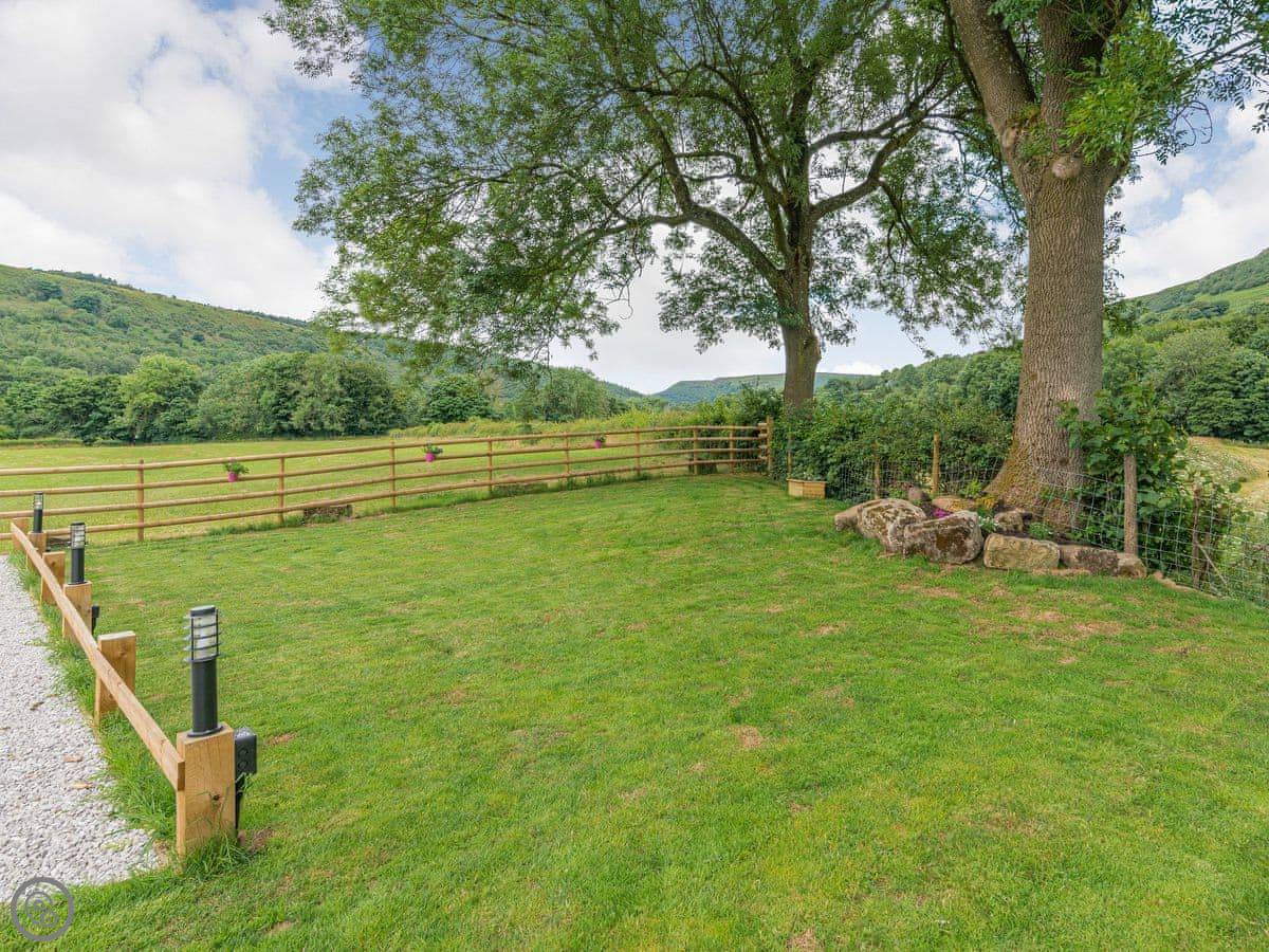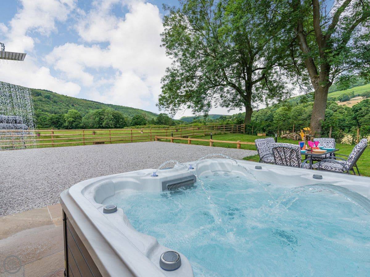 Outside, there's a garden with a patio. It's enclosed. There's a hot tub in a private spot, looking out at the view. The River Derwent runs along the edge of the farm land, so you can go for a swim if you're brave. Parking is right outside.