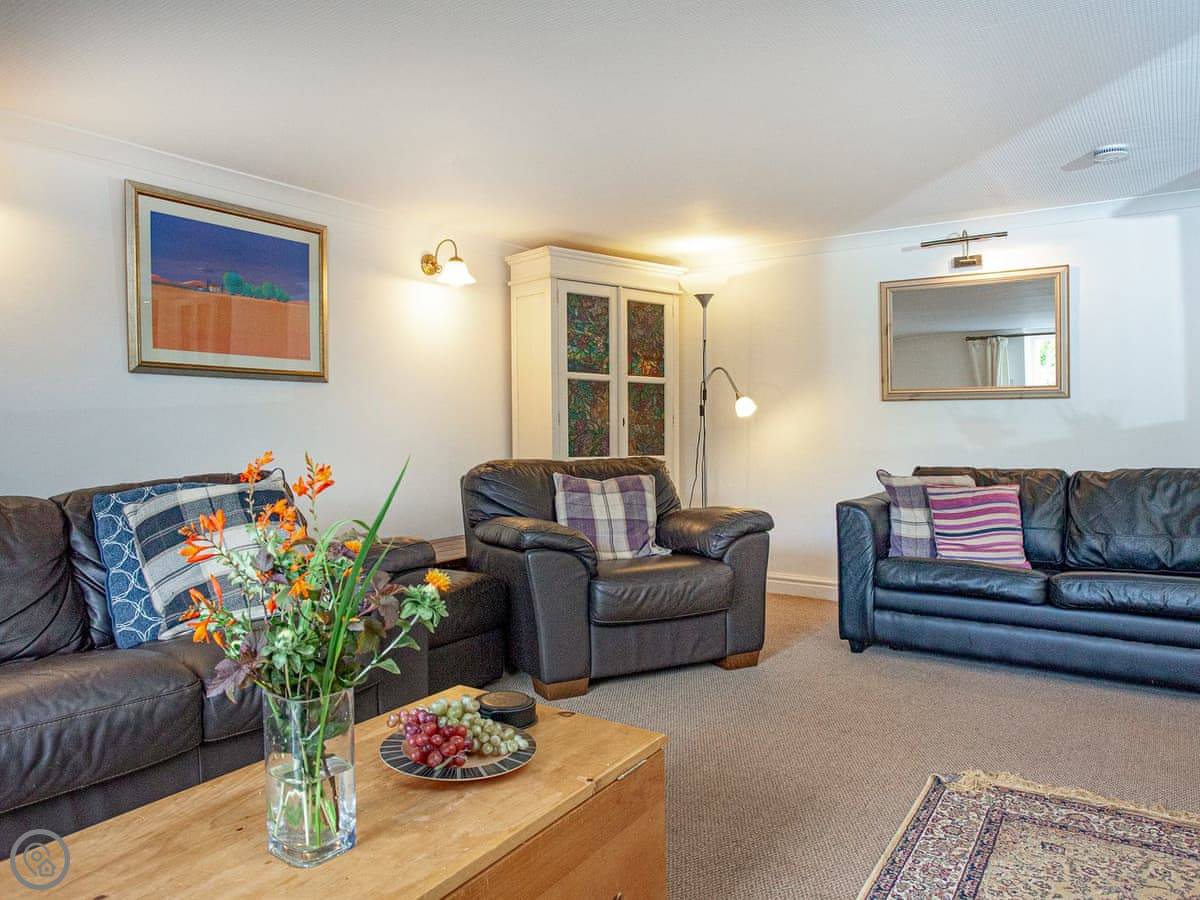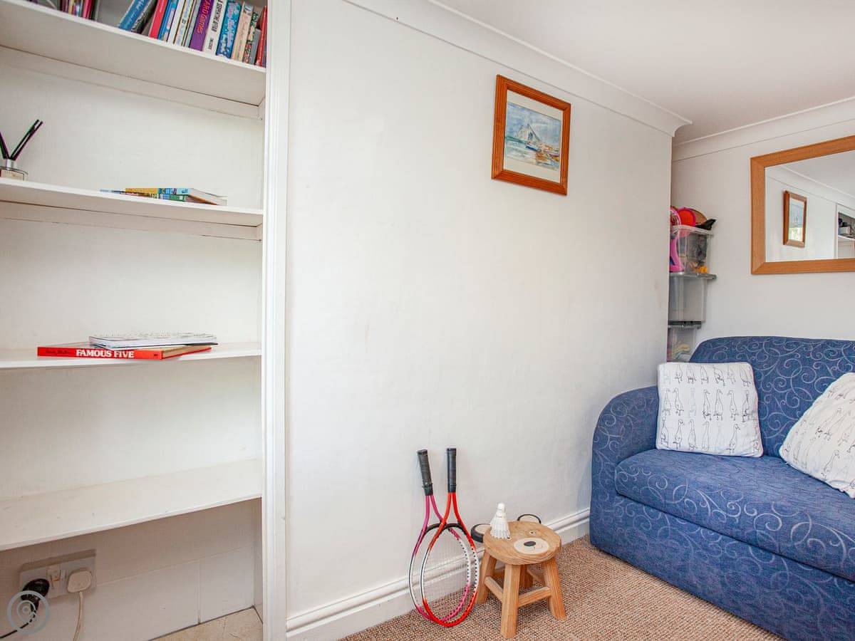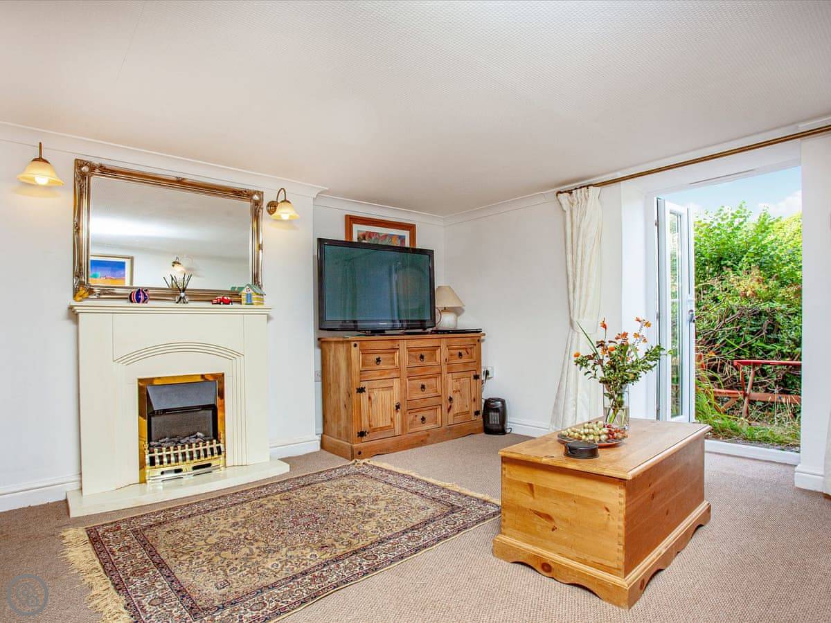 There’s a small extra room just inside with a single sofa bed in it. It's useful if you need another sleeping space or somewhere to put bags. The living area has a double sofa bed and French doors that open onto a shared lawn.