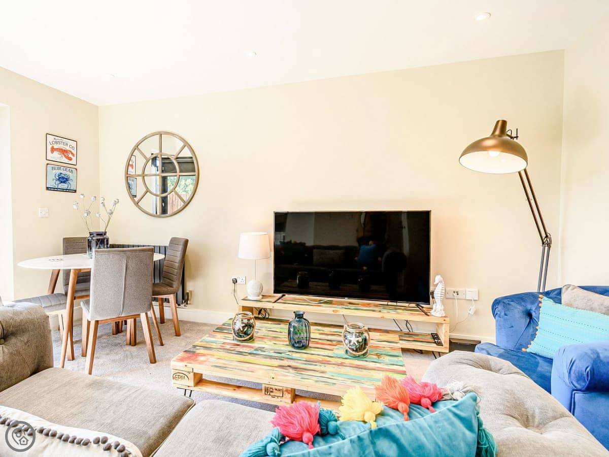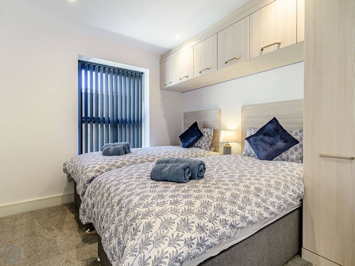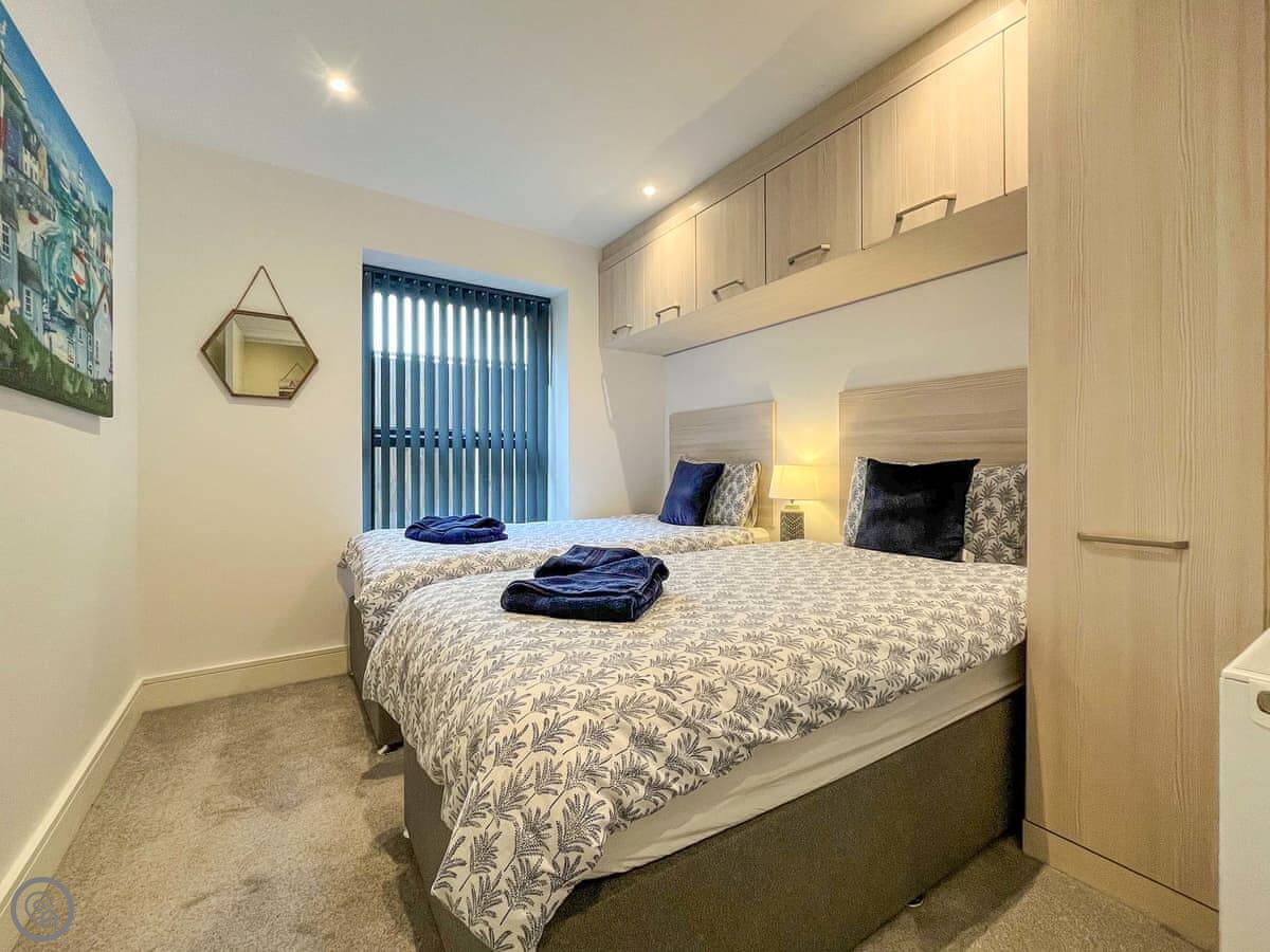 Stepping inside you are welcomed into a beautifully presented open plan living area bathed in light with large windows as well as glass doors opening out onto your private enclosed patio, where you can sit out and soak up the sun, perhaps enjoy al fresco dining with a glass of something special. The living area has comfortable seating around the large Smart TV, with a modern kitchen with integrated appliances. The room is complete with a dining table, perfect for enjoying meals together. There are two bedrooms, the master double bedroom as well as a twin both with fitted wardrobes. Each room is carefully furnished to ensure you have a comfortable and welcoming stay. The apartment is finished with a bath room with a shower over the bath where you can start or end each day in this refreshing shower or a relaxing soak.