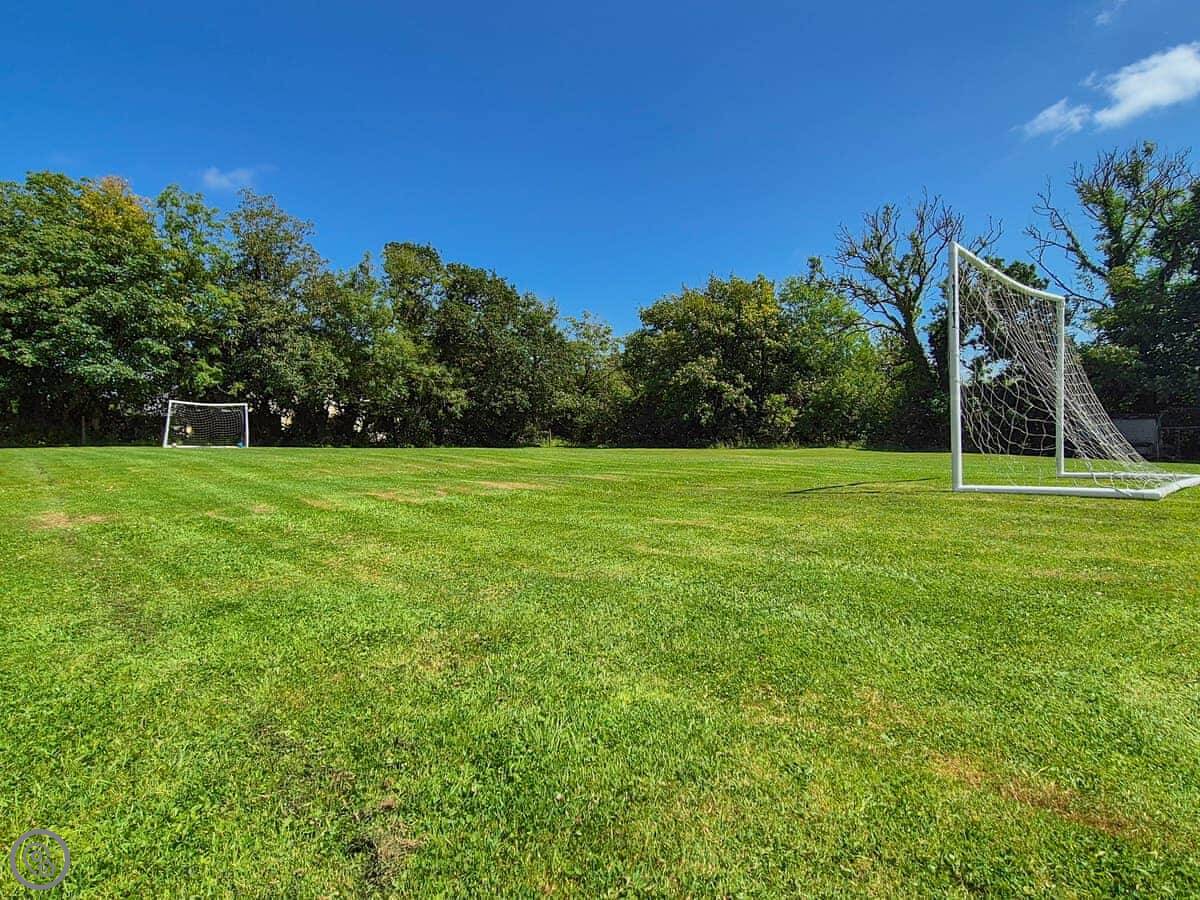 Outside, there's a patio with a hot tub, and a pebbled garden. From early April to the end of September, there's a private above-ground swimming pool you can use. You share access to seven acres of land with the other cottage on site. There's a games lawn with football goals, and a small lake where you can fish. There are some horses here, and you can help groom them if you arrange it with me. You can also collect eggs from the chickens.