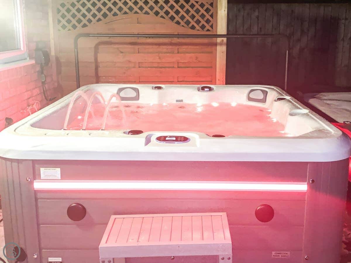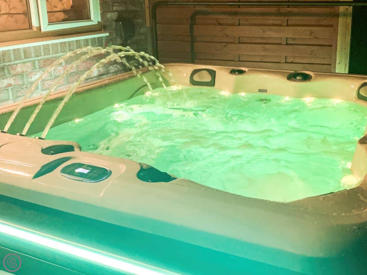 The living area is open plan. There's a kitchen with a washing machine, a dining bit, and sofas. The patio doors open out to a seating area and a hot tub. The hot tub is private. It's yours to use.