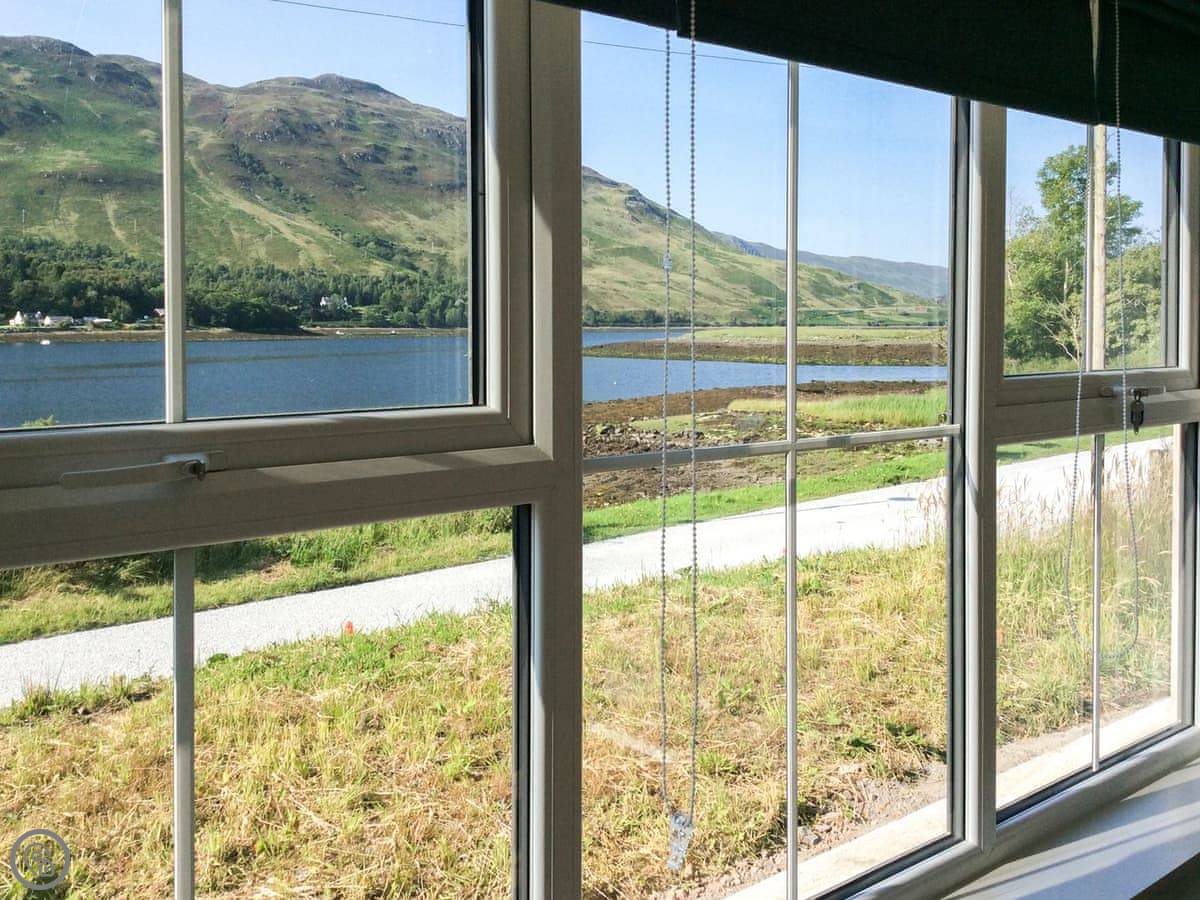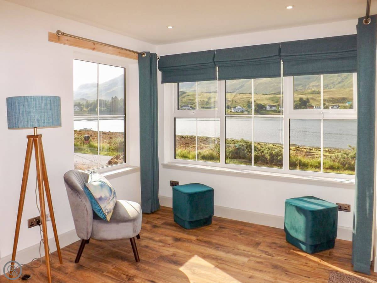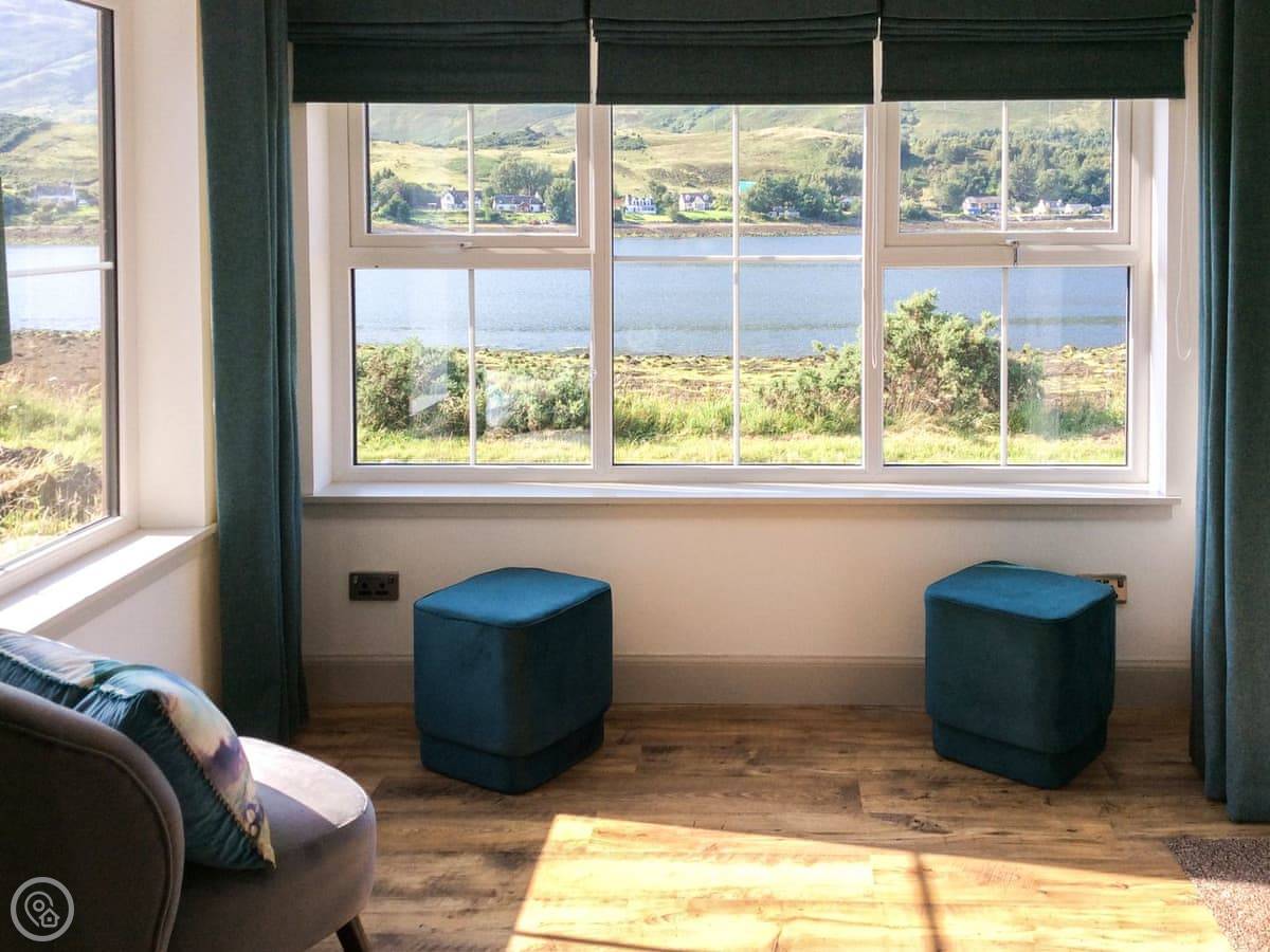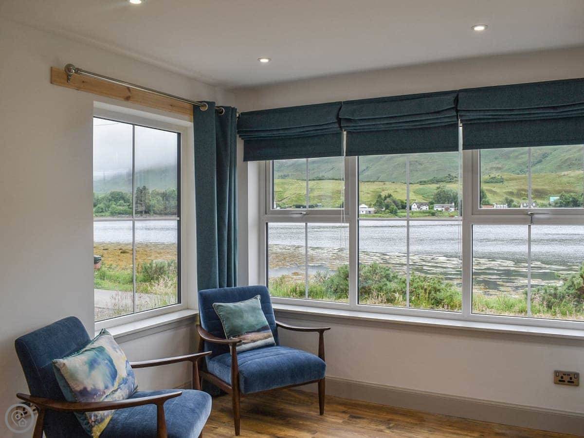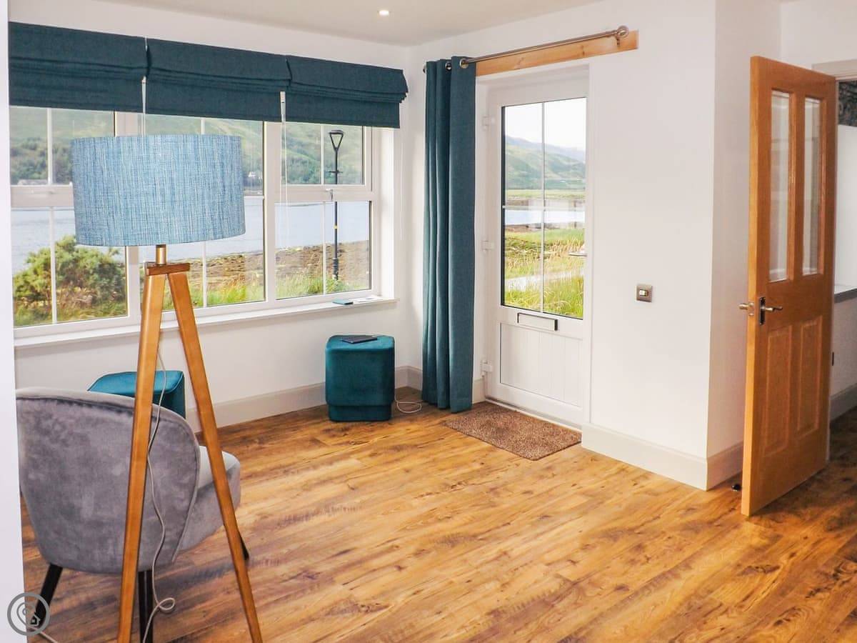 It sleeps four in two bedrooms. There are two bathrooms, one with a bath upstairs and a walk-in shower downstairs. The downstairs bedroom can be set up as a twin or a super king. Everything has a view of the loch. The living space is open-plan with high ceilings and big windows.