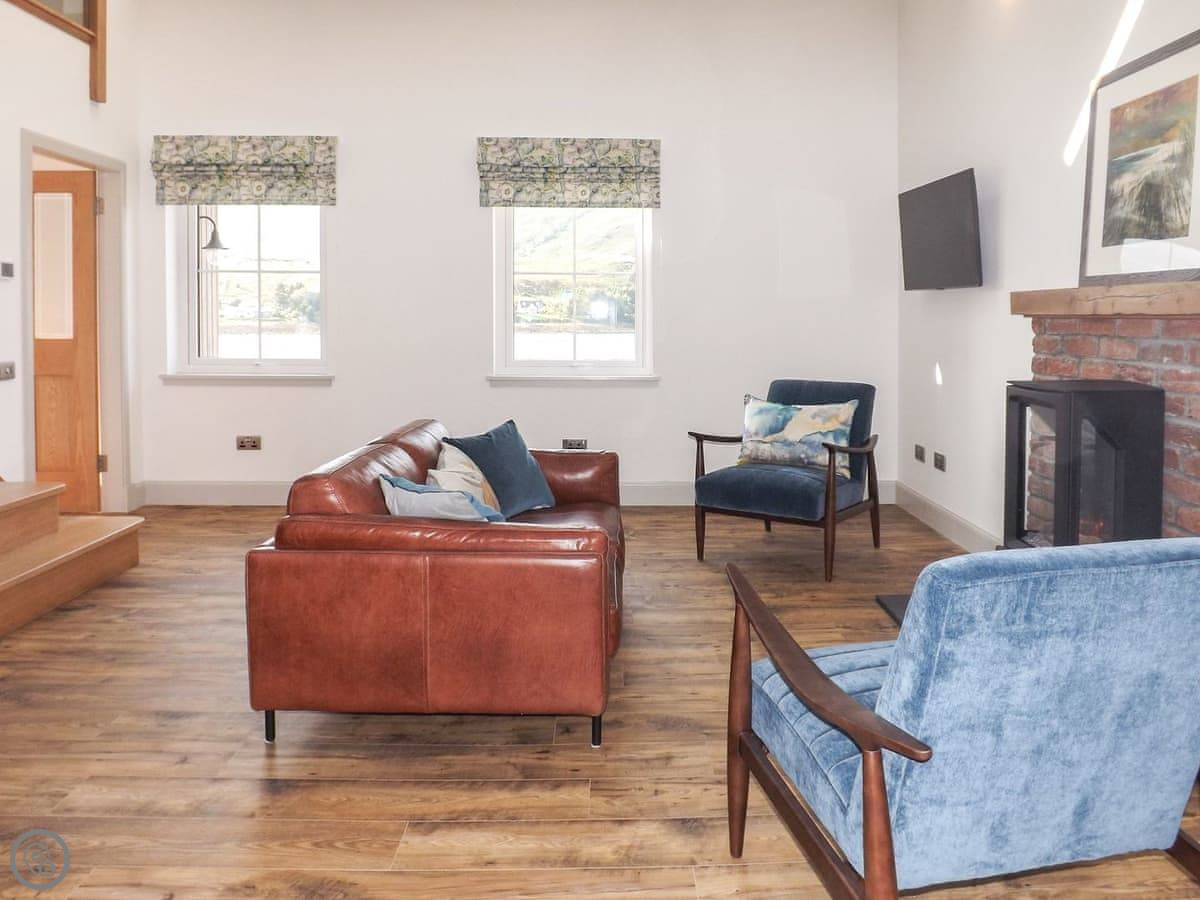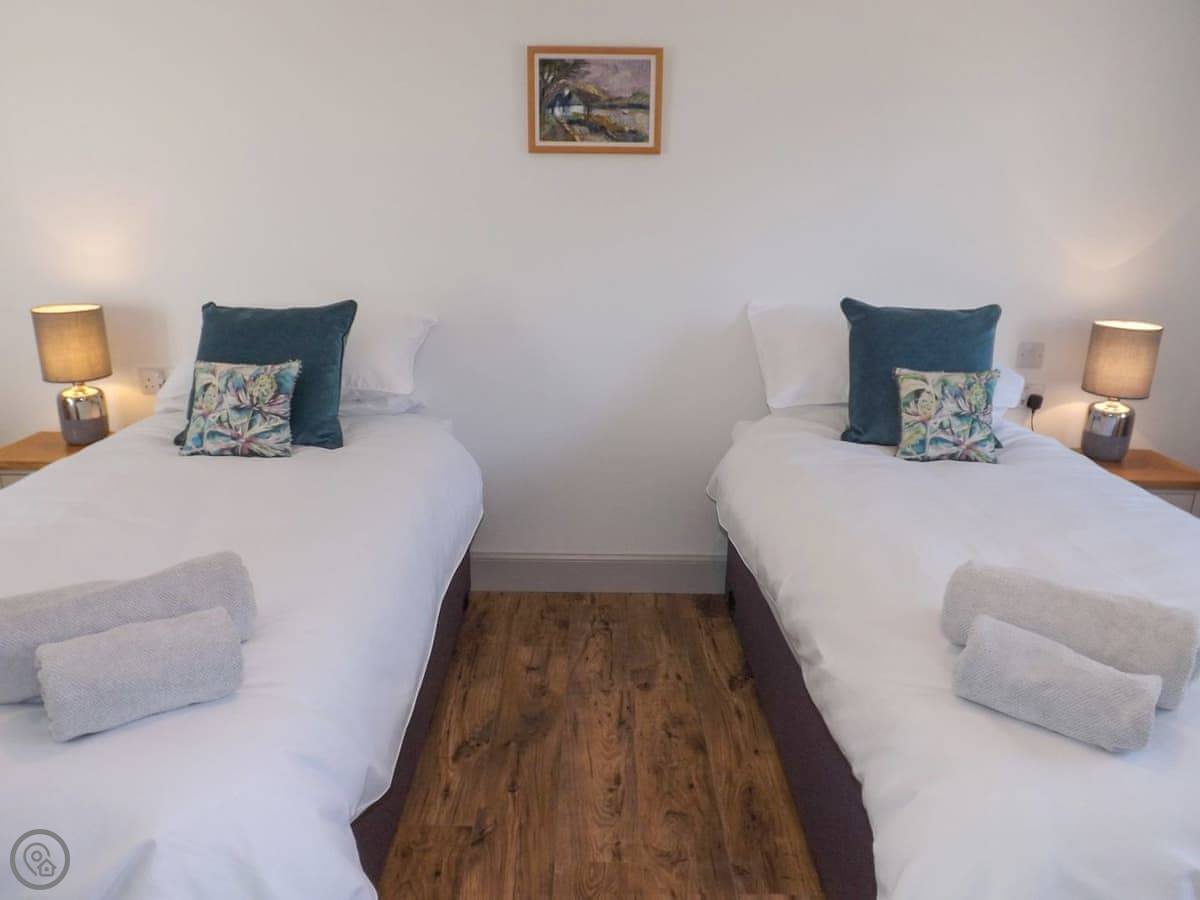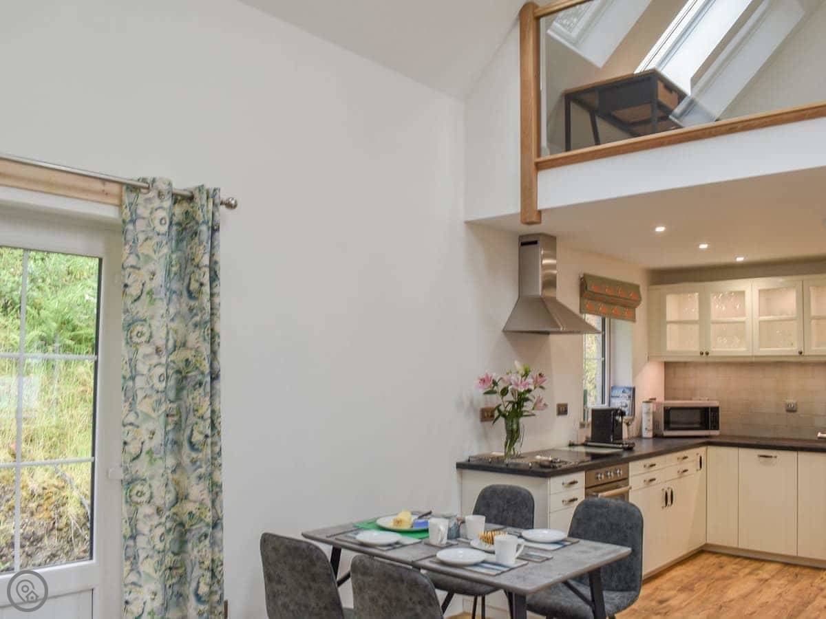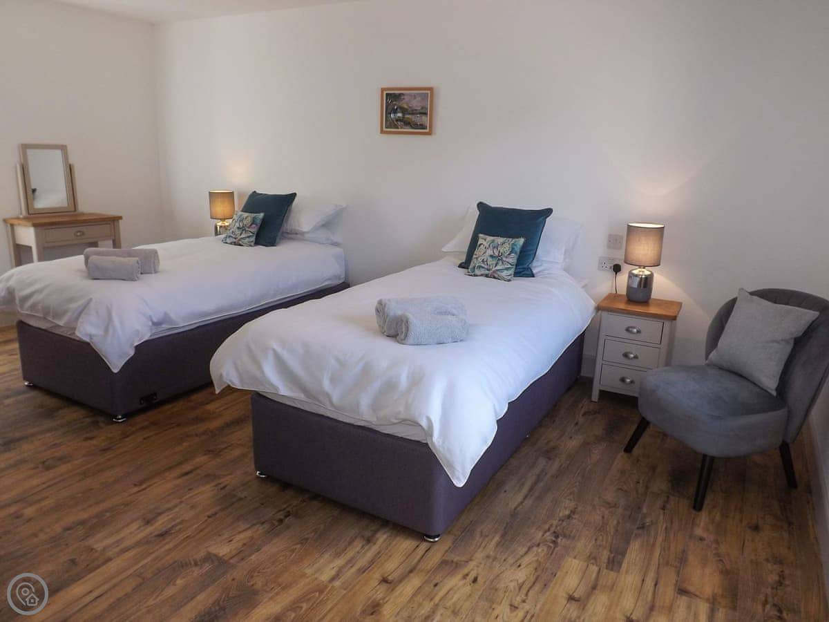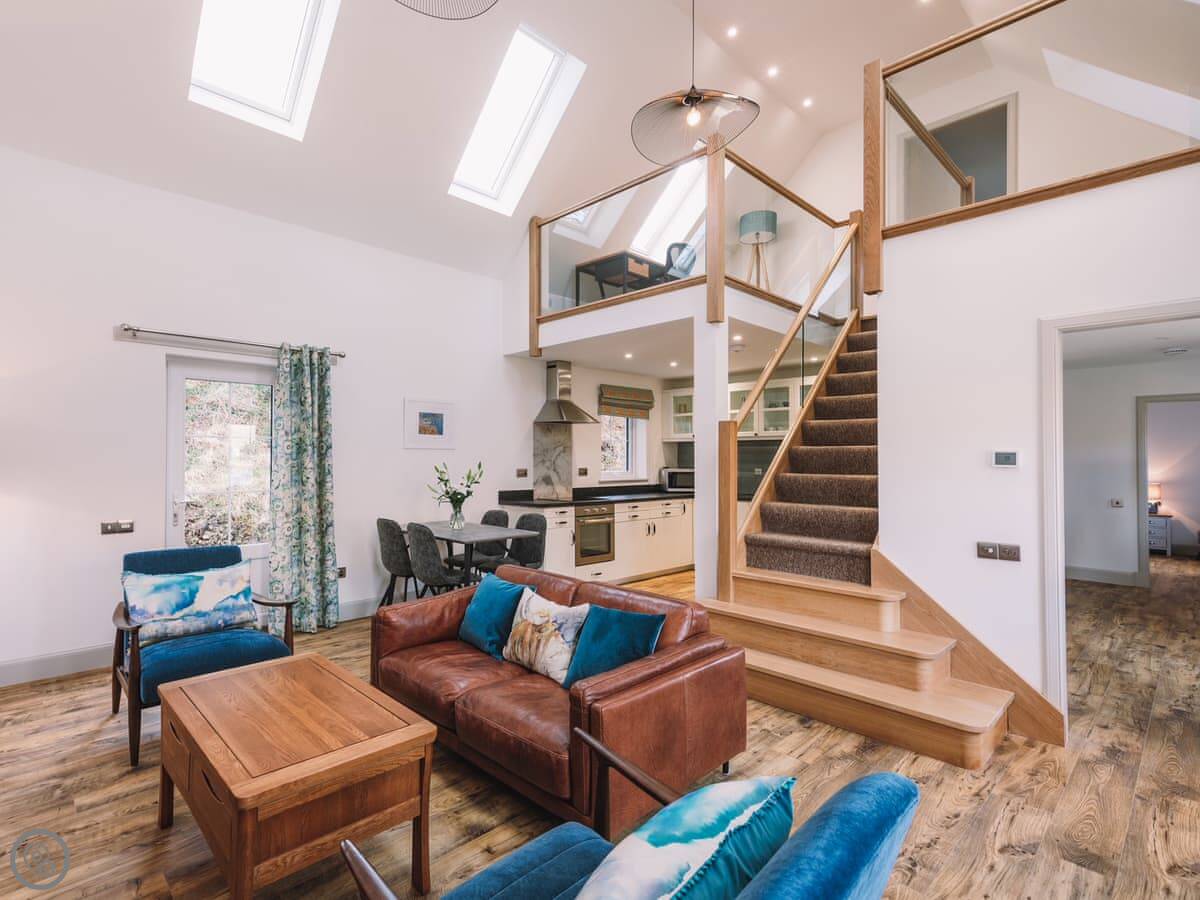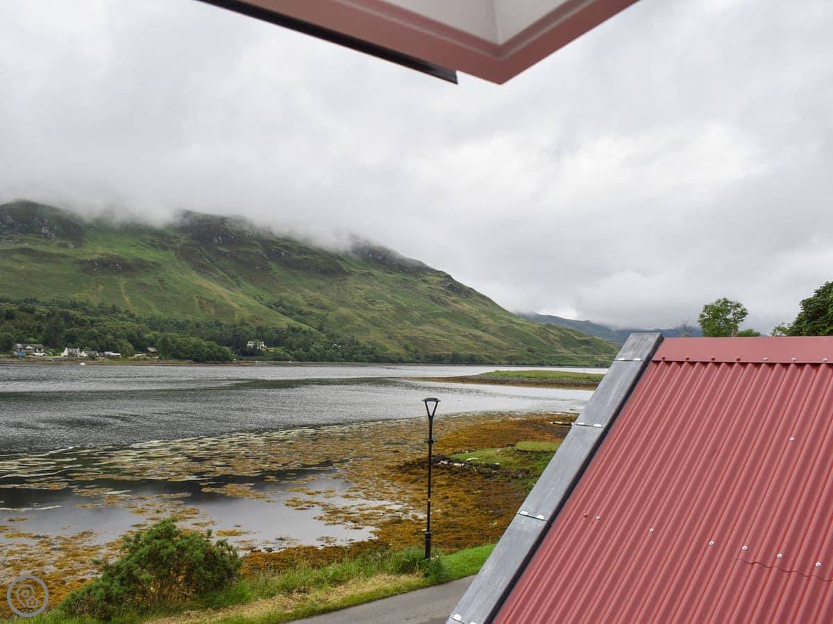 It sleeps four in two bedrooms. There are two bathrooms, one with a bath upstairs and a walk-in shower downstairs. The downstairs bedroom can be set up as a twin or a super king. Everything has a view of the loch. The living space is open-plan with high ceilings and big windows.