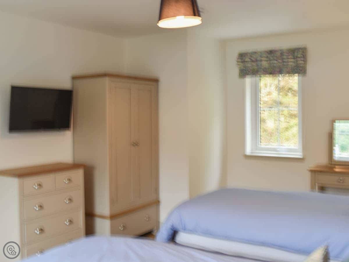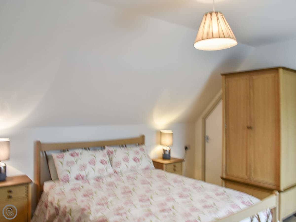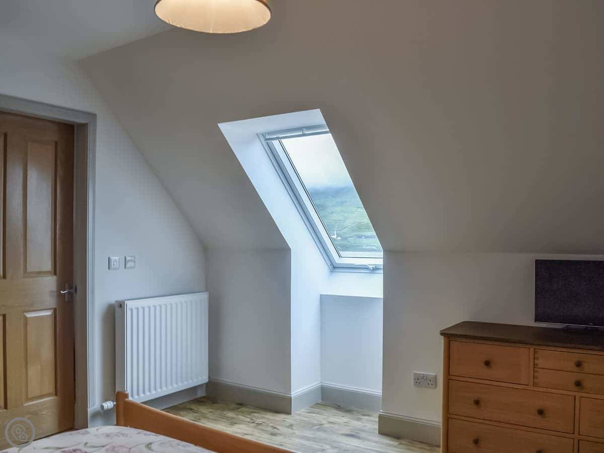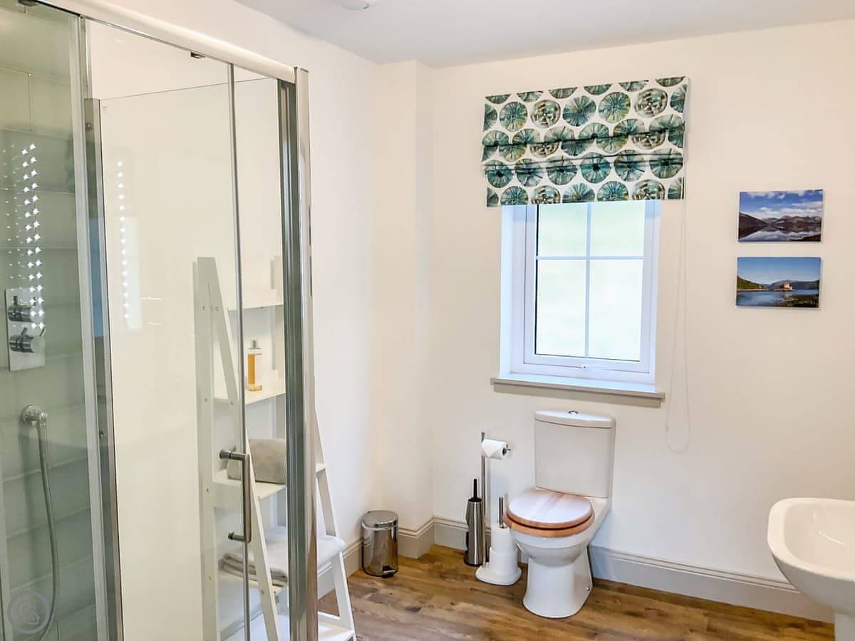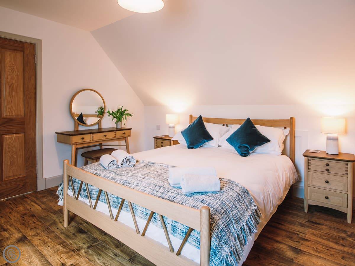 It sleeps four in two bedrooms. There are two bathrooms, one with a bath upstairs and a walk-in shower downstairs. The downstairs bedroom can be set up as a twin or a super king. Everything has a view of the loch. The living space is open-plan with high ceilings and big windows.