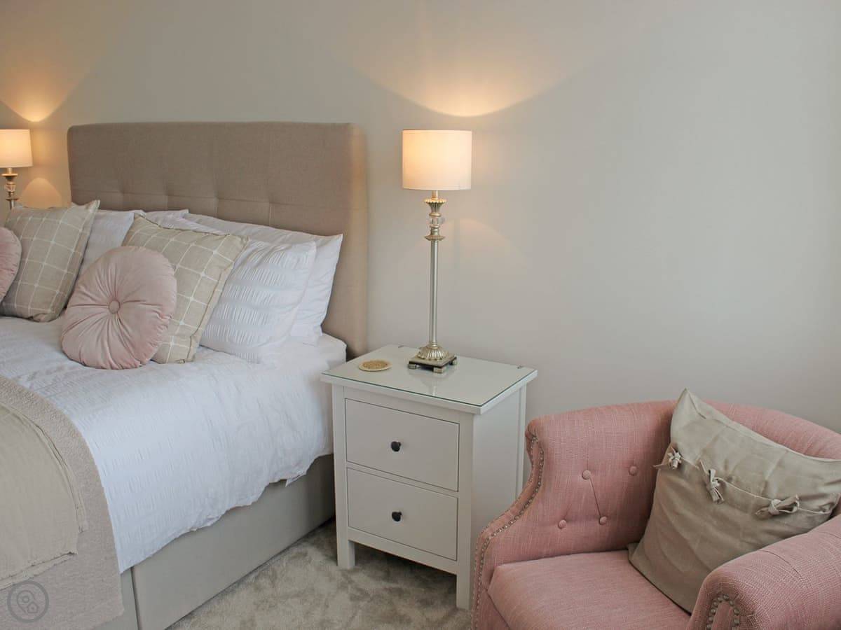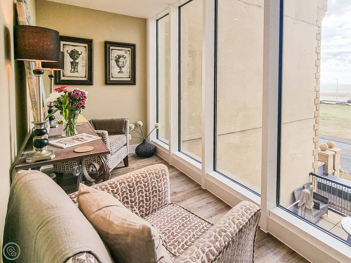 The beautifully decorated and furnished bedroom has plush carpets, a kingsize bed, walk in wardrobe and again enjoys amazing sea views. The bathroom has a bath with shower over, toilet and heated towel rail. The pièce de résistance of this outstanding apartment is just off the hallway, where floor to ceiling windows enjoy unrivalled views of the sea and beach; it’s the ultimate spot to sit and unwind with a glass of your favourite tipple while you watch the sun set.