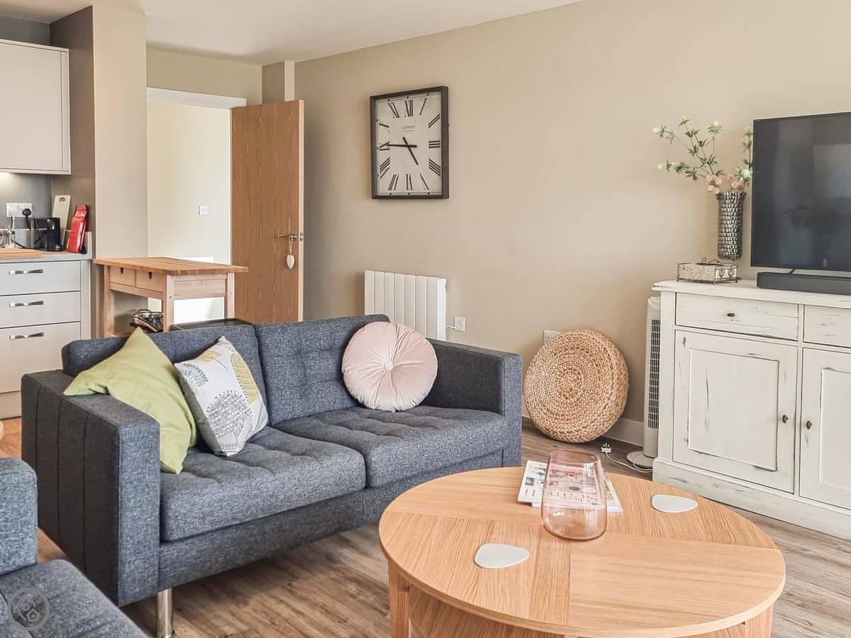 Inside, the bright central hallway leads to the spacious open plan living area which has been tastefully furnished to a high standard yet provides comfortable seating for you to enjoy as well as stunning sea views that can be seen throughout the room. The dining area is directly in front of the window while the well-equipped kitchen area is set at the rear of the room. The living area sits centrally and has a Smart TV with soundbar