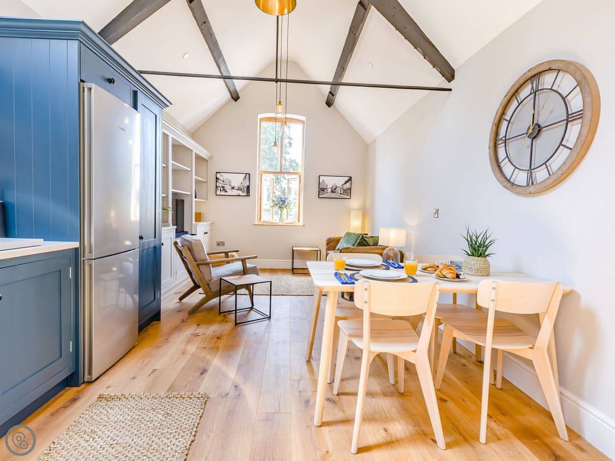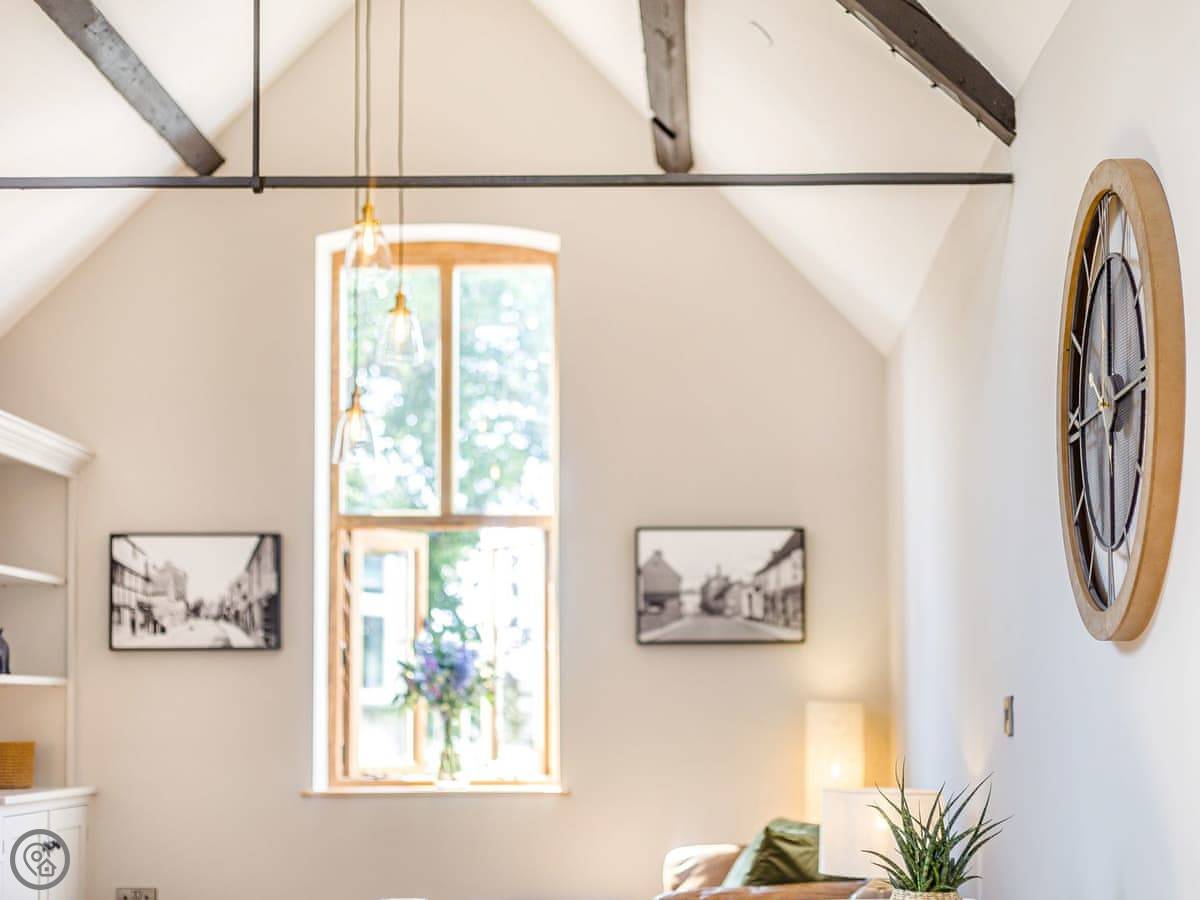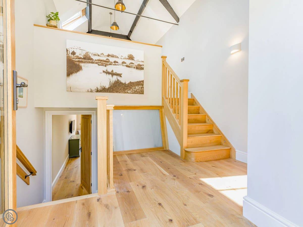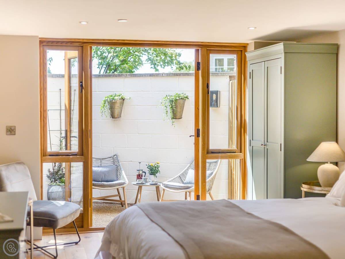 It’s split over two levels. You walk into a hallway. One set of stairs goes down to the bedroom. That’s got a super king bed and French doors out to a private walled courtyard. The other stairs go up to the main living space. That’s open plan with a kitchen, and the ceiling is high and vaulted. There’s a big window that looks out towards the river and the old bridge. It has underfloor heating.