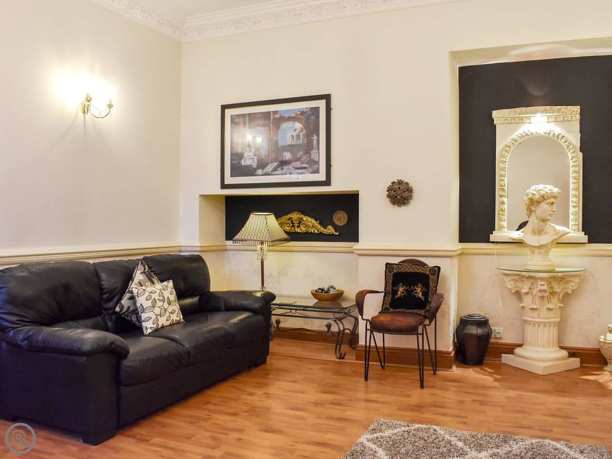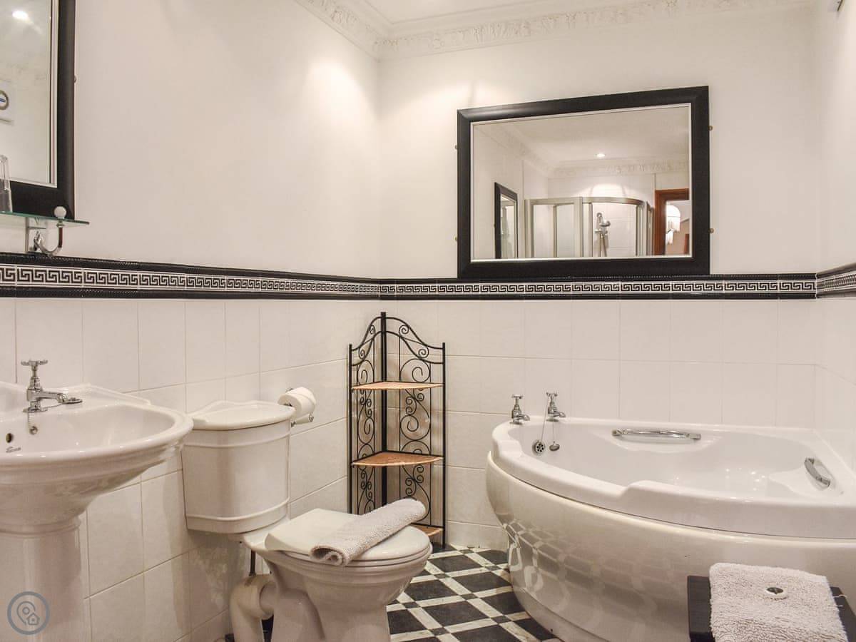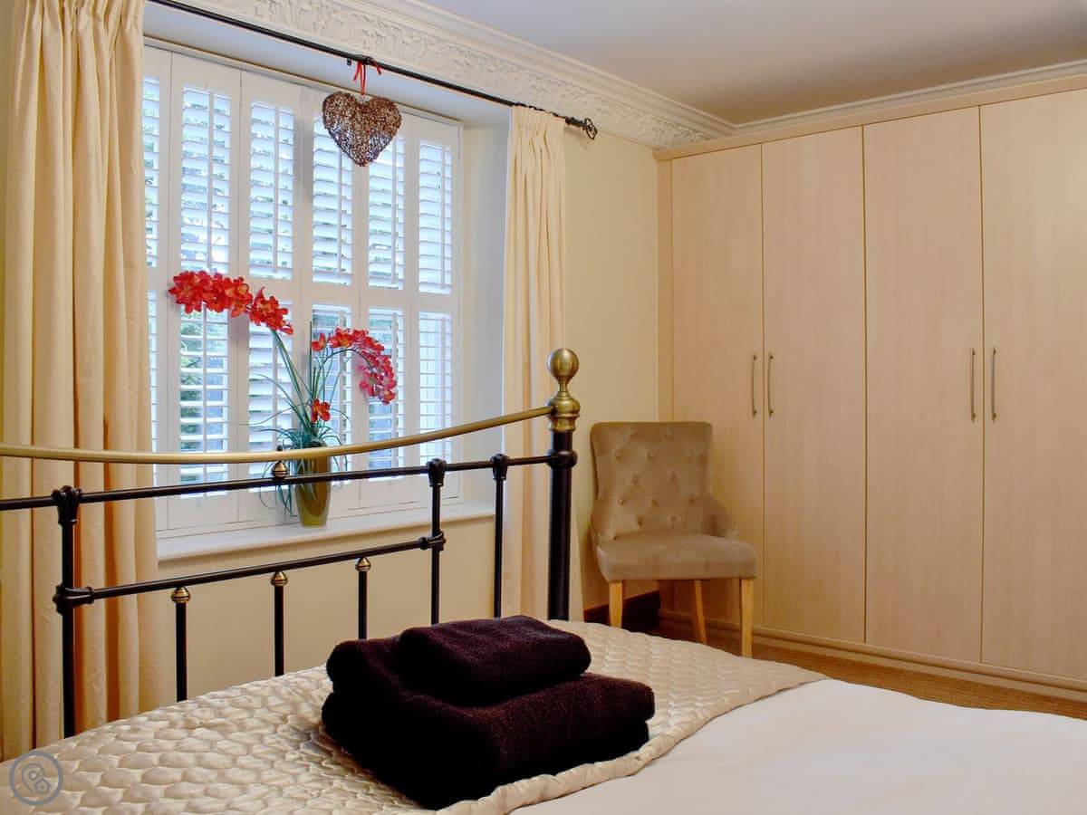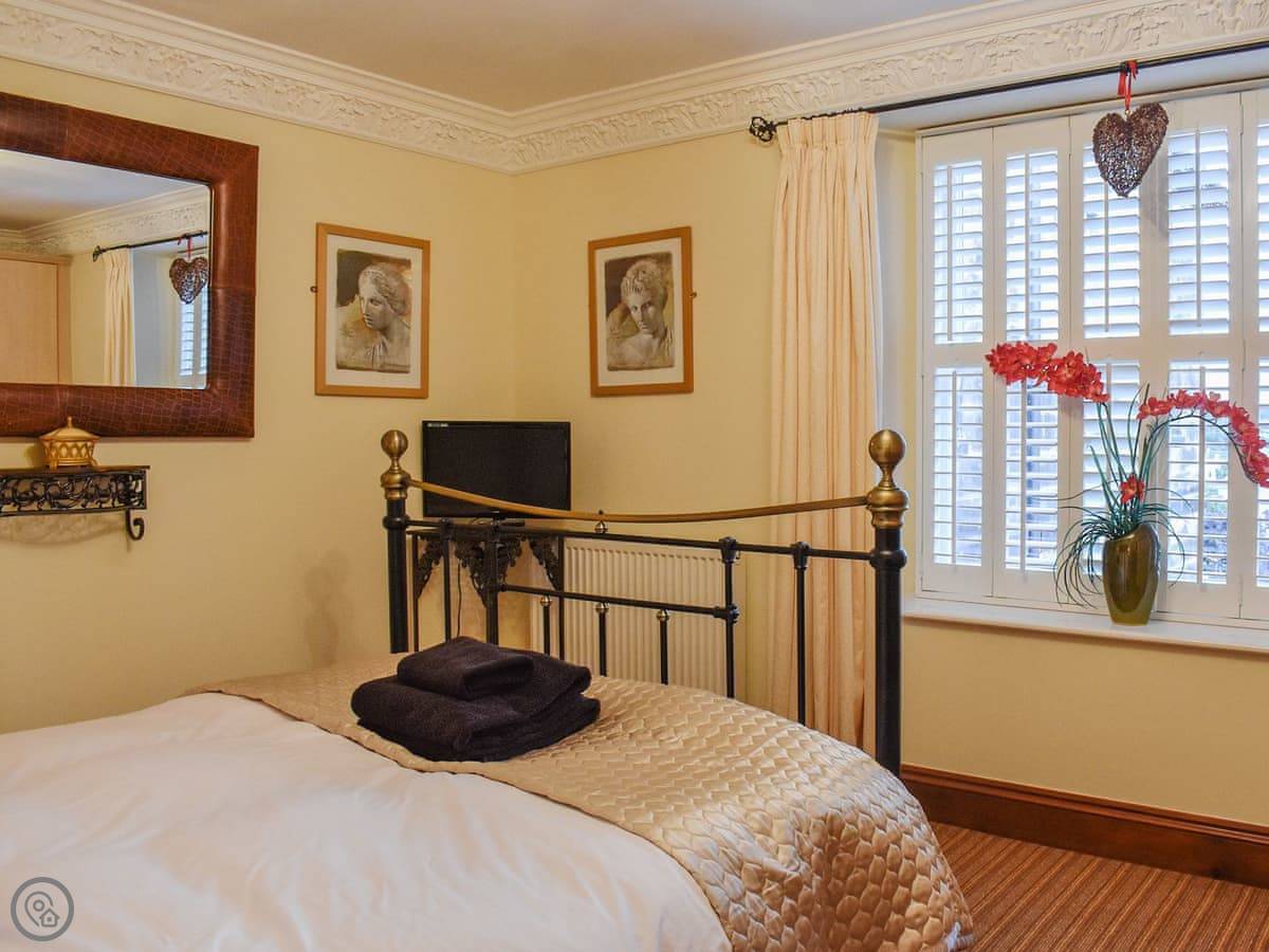 With its high ceilings, large windows and double frontage, the property is both light and spacious with over 1, 000 sq ft of accommodation spread over two floors. Downstairs there is a generous lounge with a feature fireplace, and seating on three leather sofas. The large kitchen/diner has integrated appliances, heated slate flooring, and good sized dining table where you can all be seated together, there is a separate WC/utility on the ground floor as well as a compact single bedroom with a day bed. Upstairs there are three bedrooms, two of which are large doubles both with TV’s and large wardrobes, the master also has an en-suite shower room. The final bedroom is another single room. The family bathroom has both a shower cubicle and a corner bath. To the front there is a stone terrace with space for outside seating that enjoys a south-facing aspect and elevated views across the park. There is also private parking for up to two vehicles directly in front of the property, which is a rare find in the town centre.