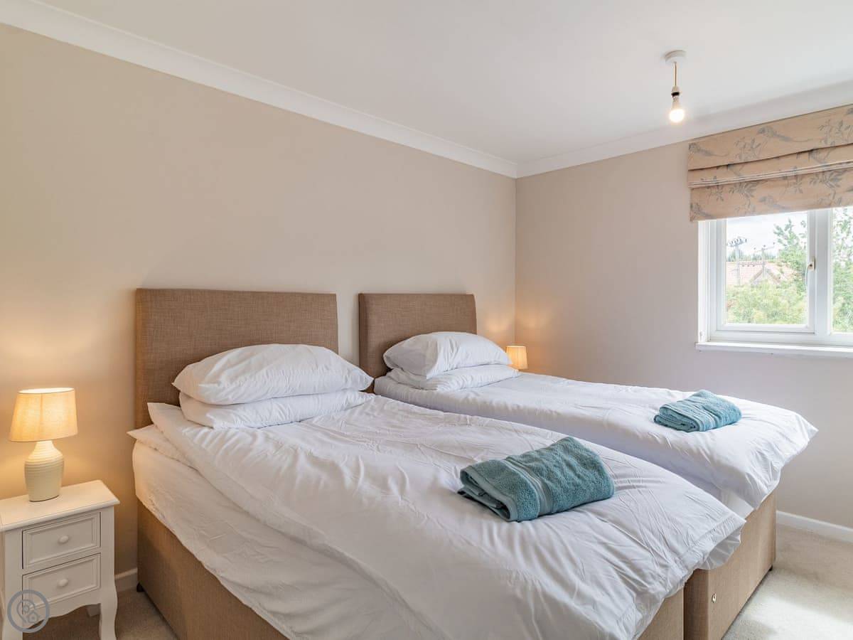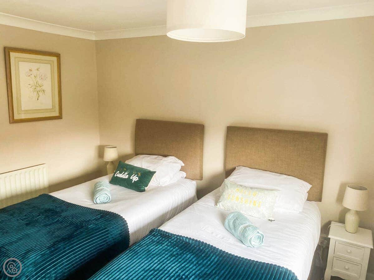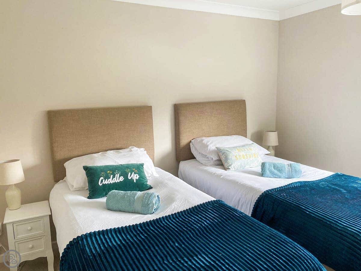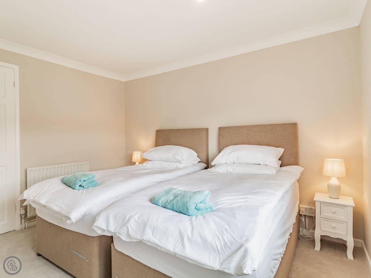 Upstairs, two of the bedrooms have zip and link beds. That means you can have them as super king size beds or as twins. Useful if you're two couples or a family. The stairs are fine, but they are a bit steep at the top, just so you know.