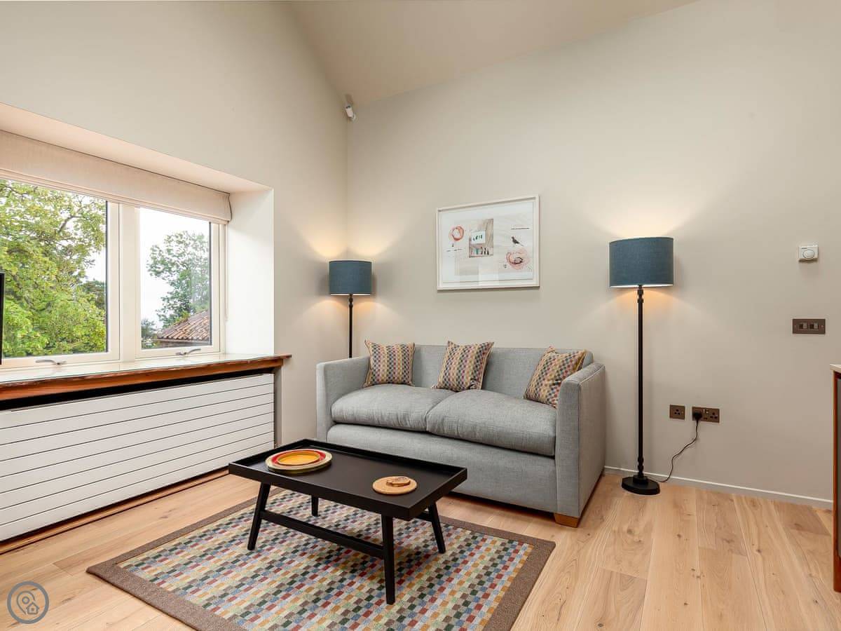 You're up high in the living room, so you get a good view out over the fields to the sea. The bedroom is on the ground floor and opens onto a shared courtyard. The stairs inside are quite steep, because it's a tall, old building.