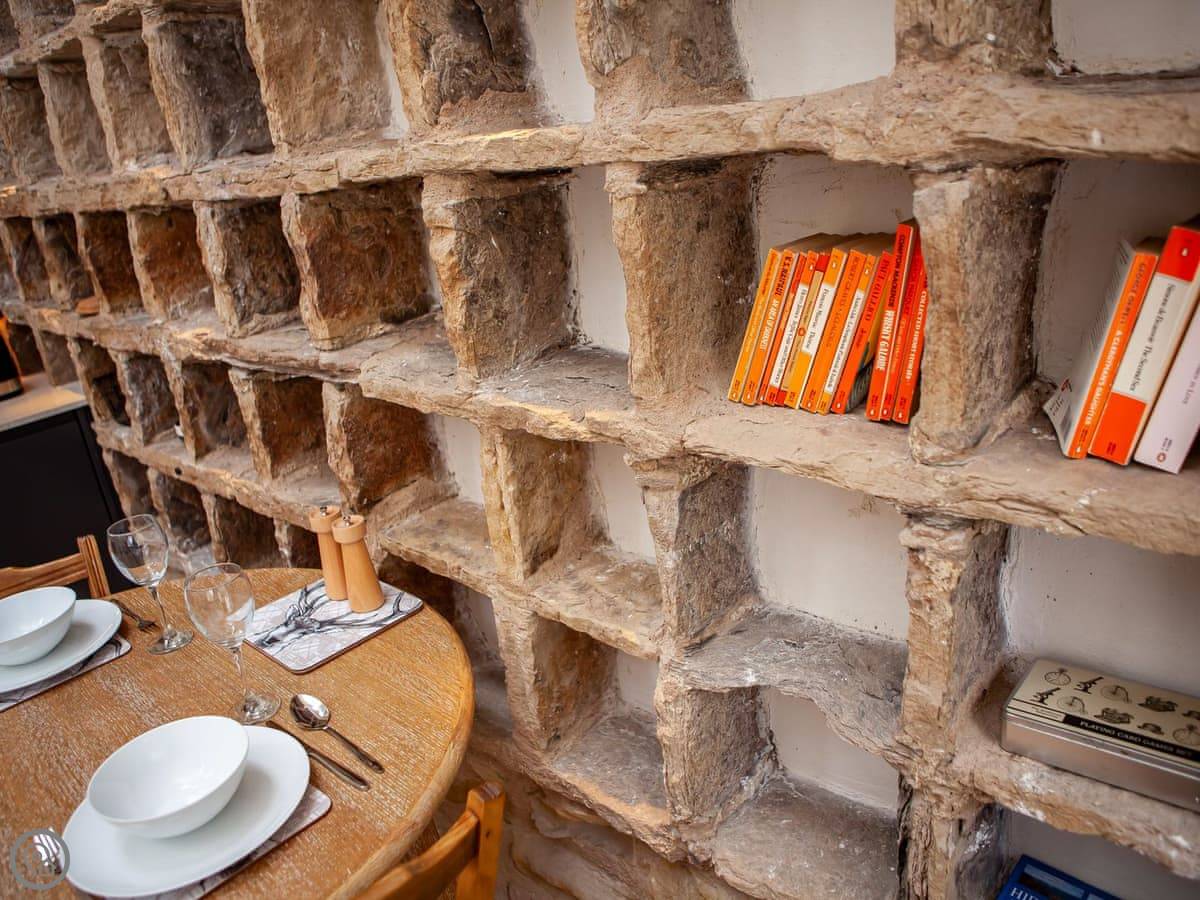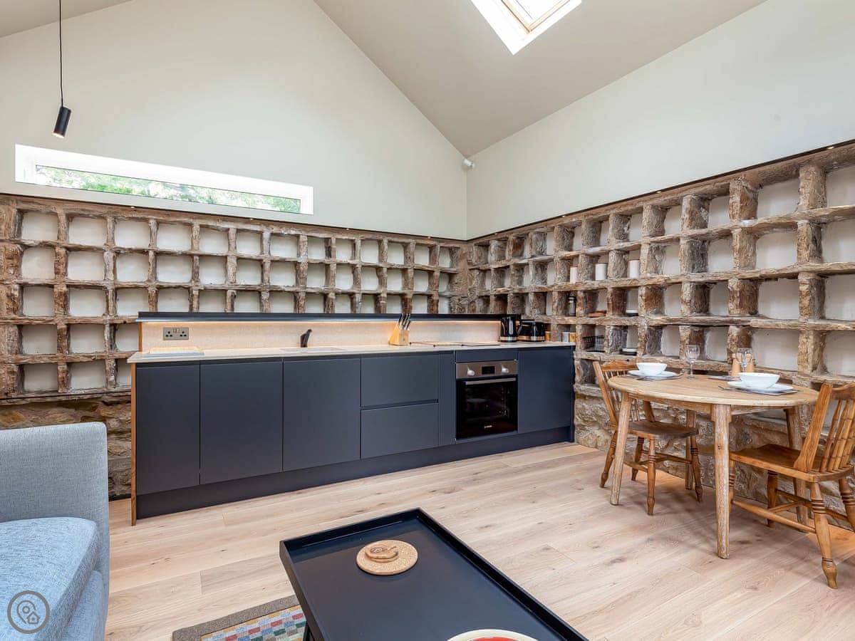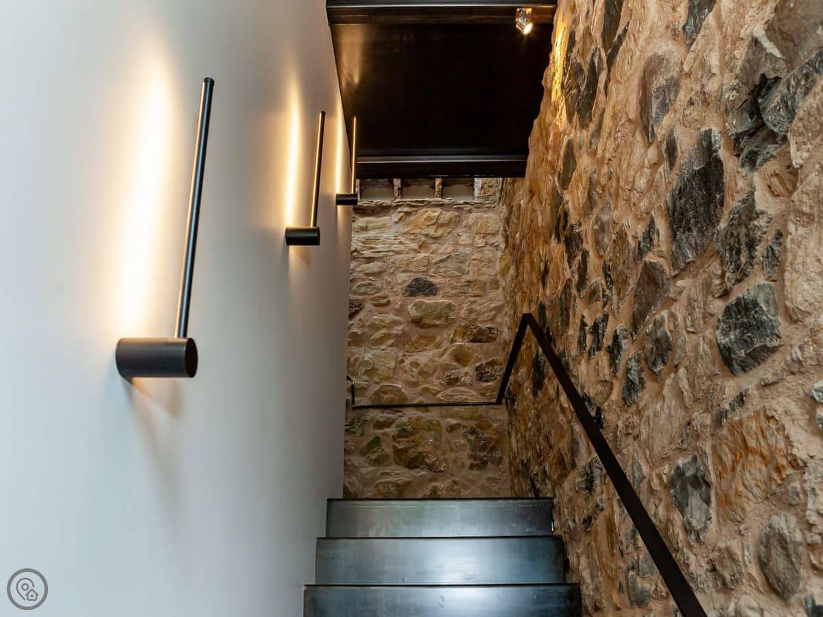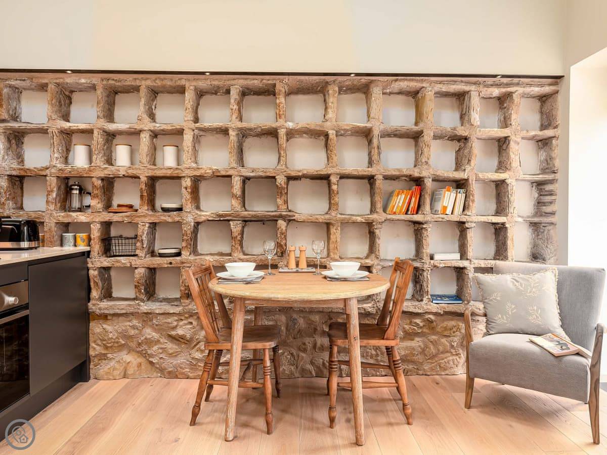 It's a doocot that's been done up. A doocot is an old building for doves. It's tall and has thick stone walls. The inside is all new, with a big bed and an open plan living space upstairs. They've kept a lot of the old nesting boxes in the walls, which is interesting to look at. There are some nice bits of wood from a local tree.