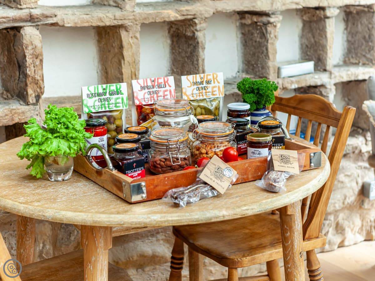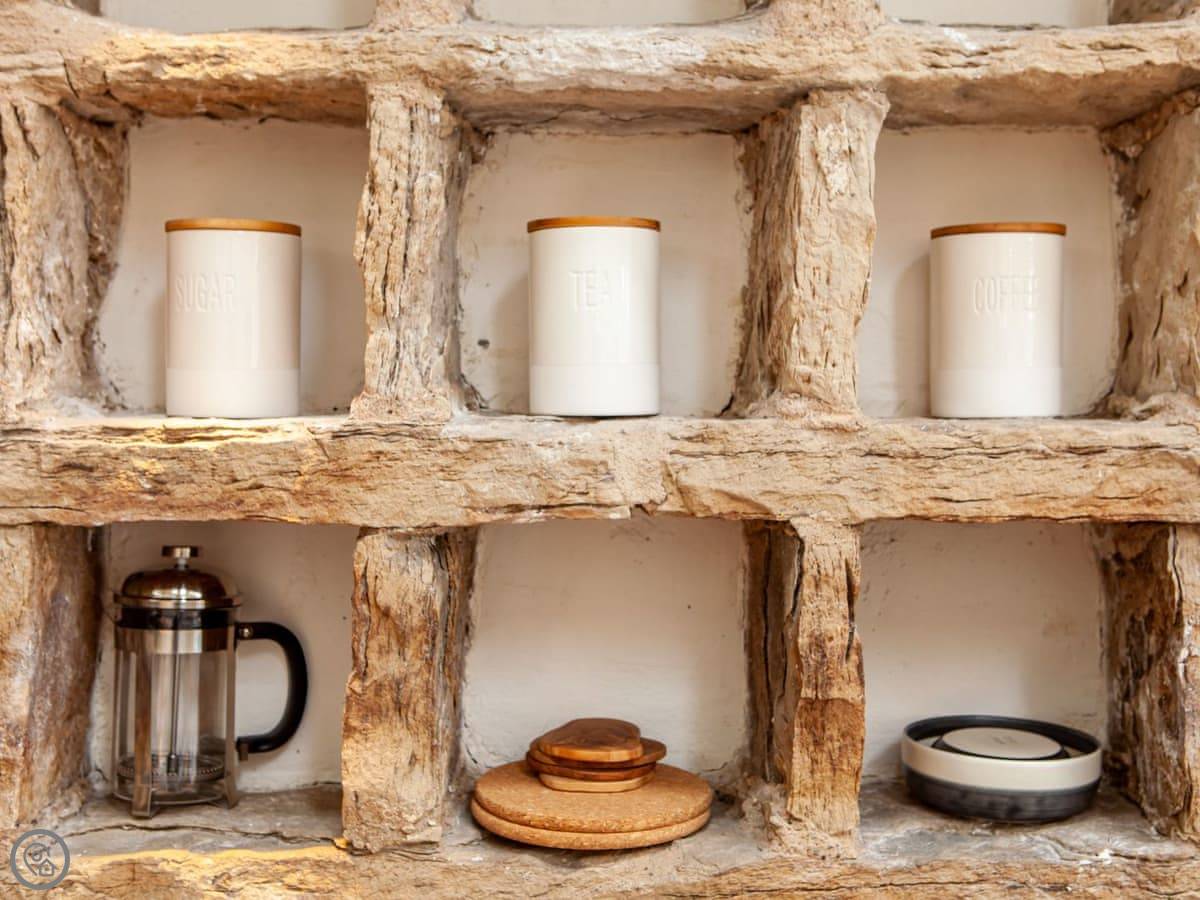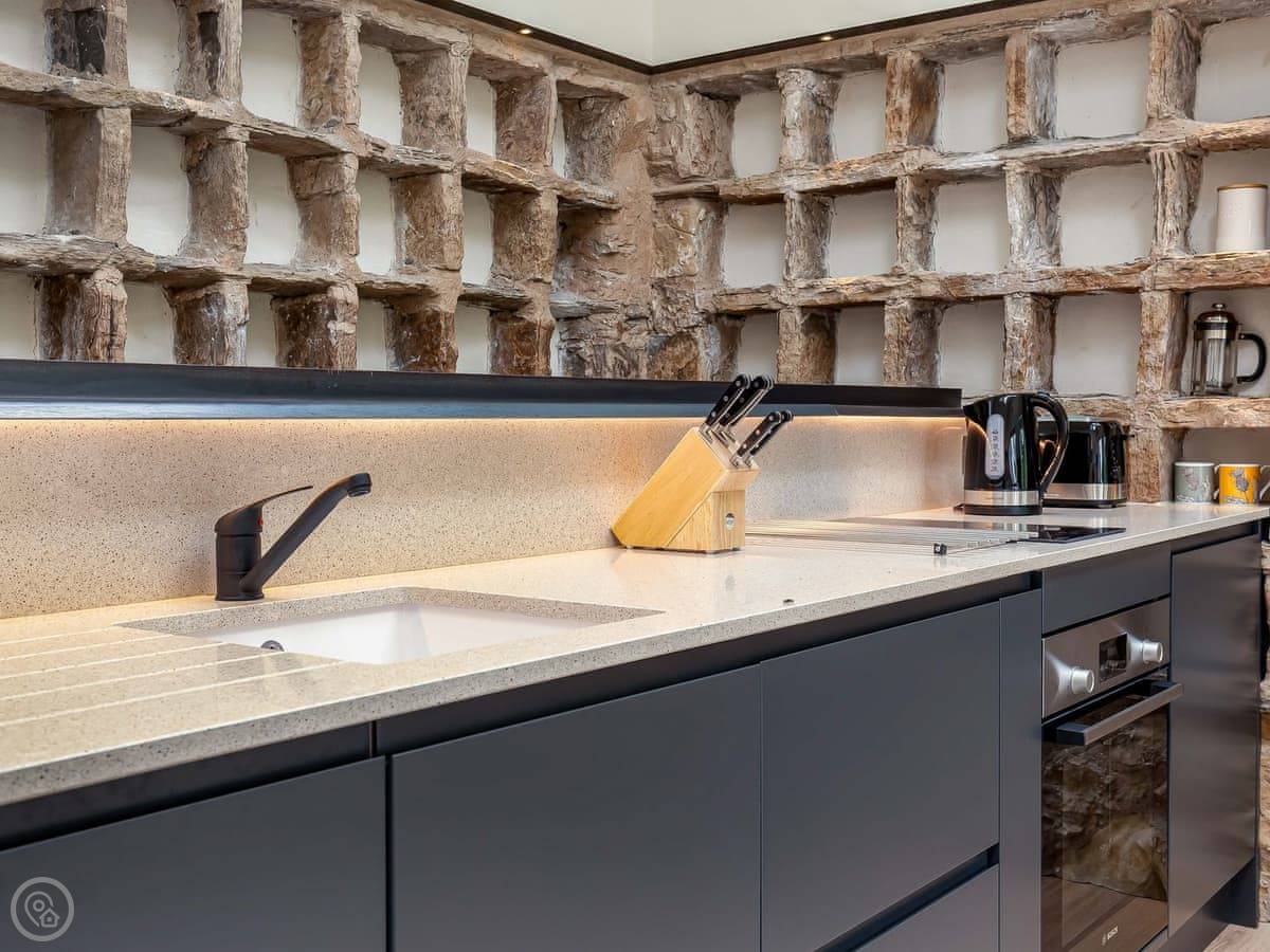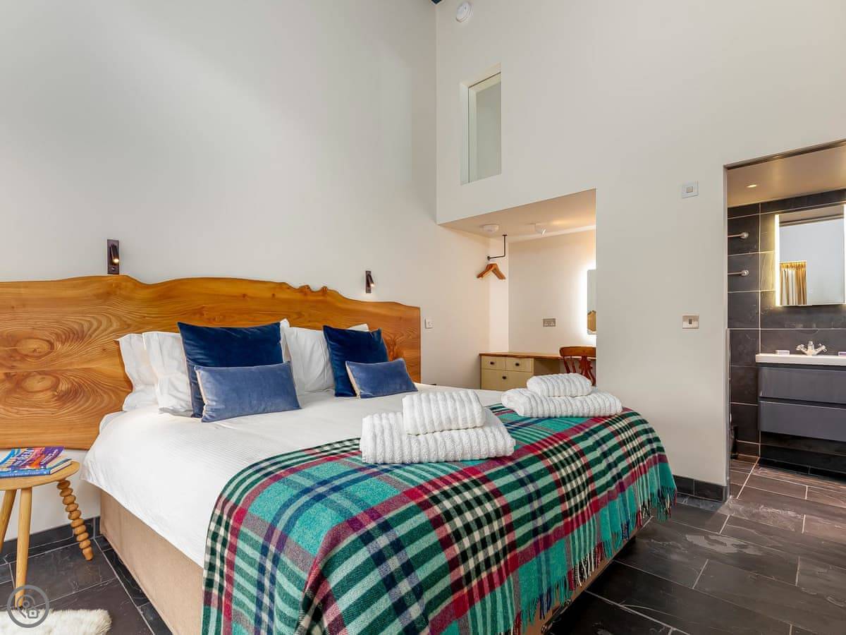 It's a doocot that's been done up. A doocot is an old building for doves. It's tall and has thick stone walls. The inside is all new, with a big bed and an open plan living space upstairs. They've kept a lot of the old nesting boxes in the walls, which is interesting to look at. There are some nice bits of wood from a local tree.