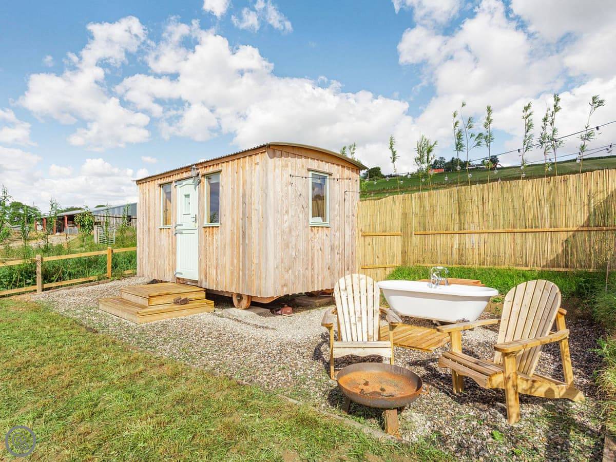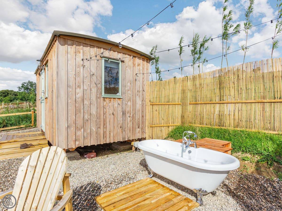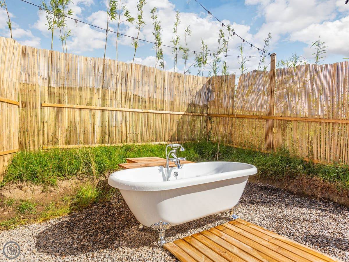Outside, there's a deck with a table and chairs. There's also a private hot tub on a raised deck next to the hut. You get a firepit too.