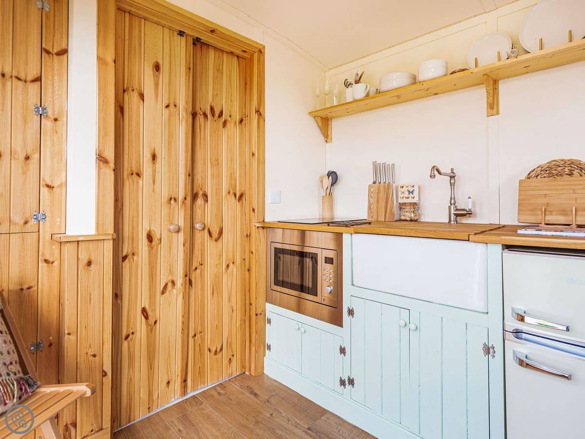 The hut itself is one open-plan room with a kitchen area and a bed. It's simple and clean. There's a shower room. Everything is on the ground floor and the entrance has no steps.