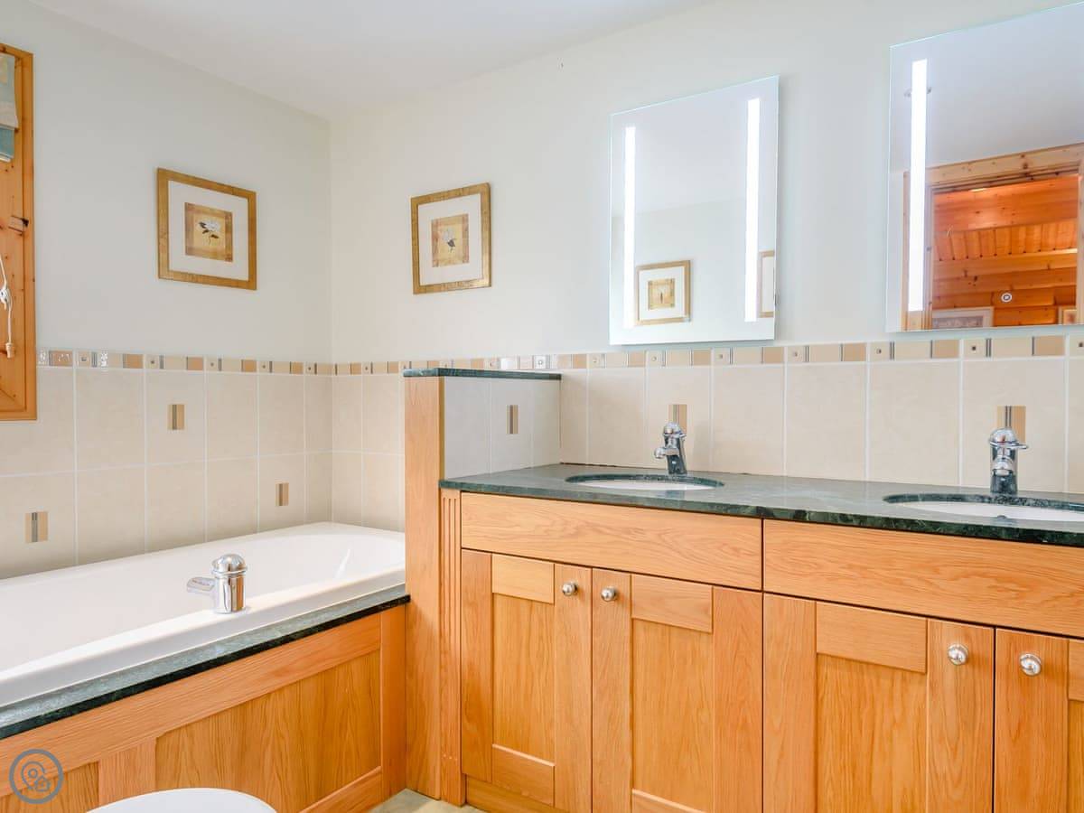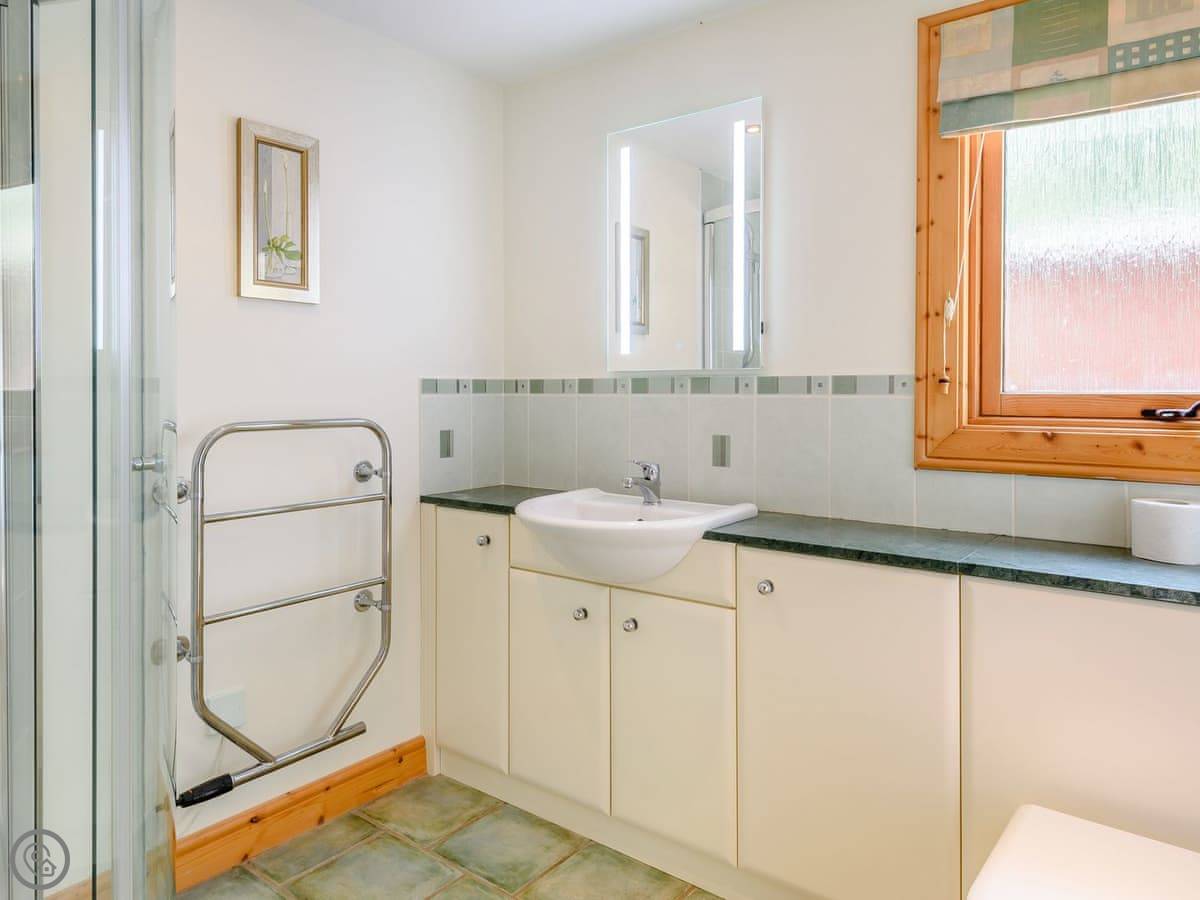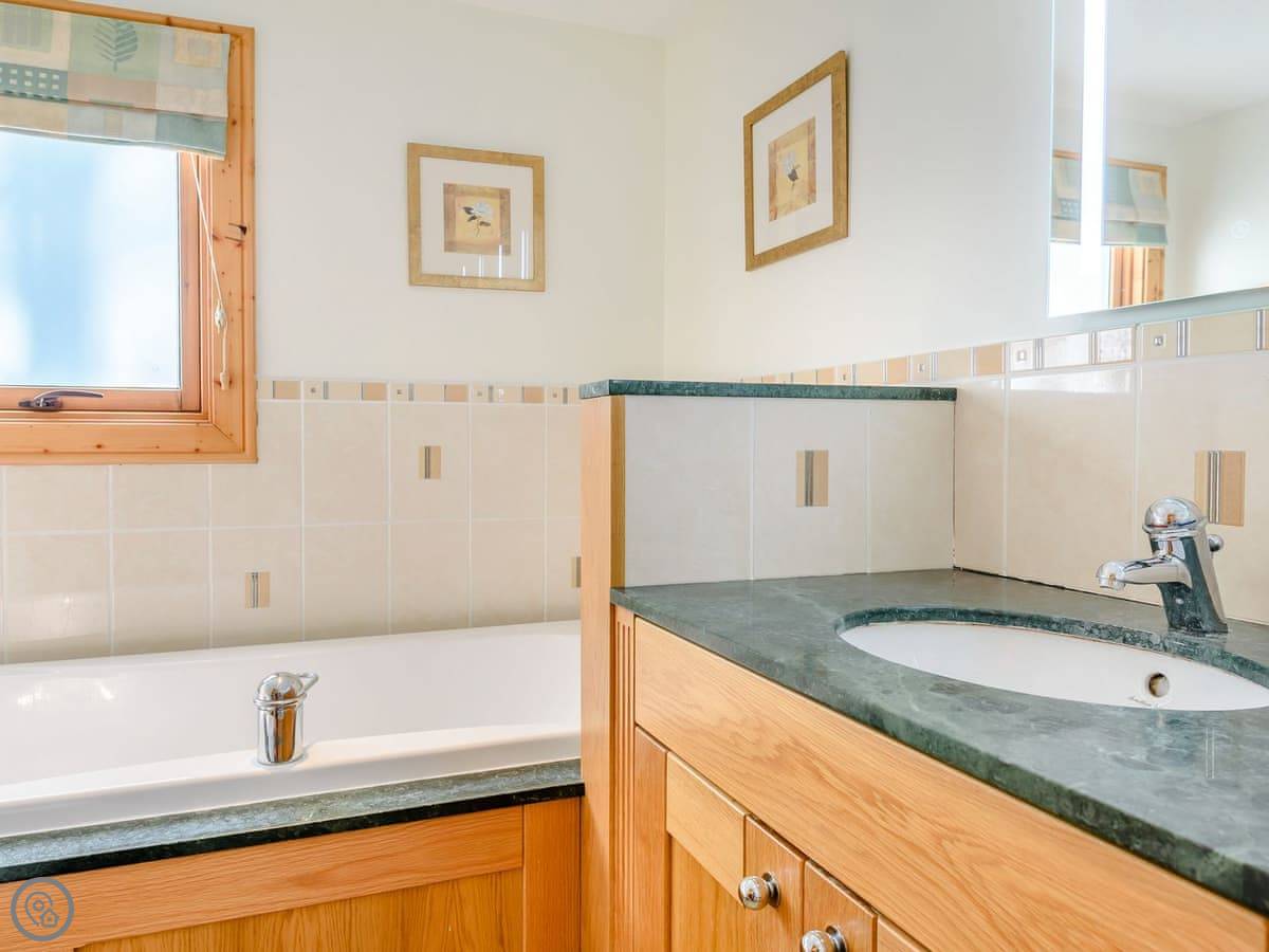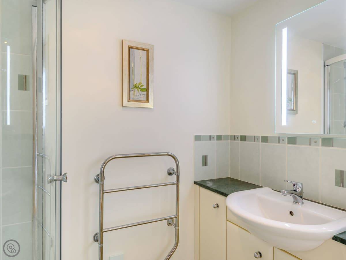 It sleeps four. Two bedrooms and one bathroom with a shower. The bathroom is downstairs. The stairs are fine, normal ones.