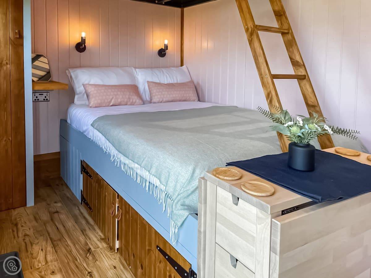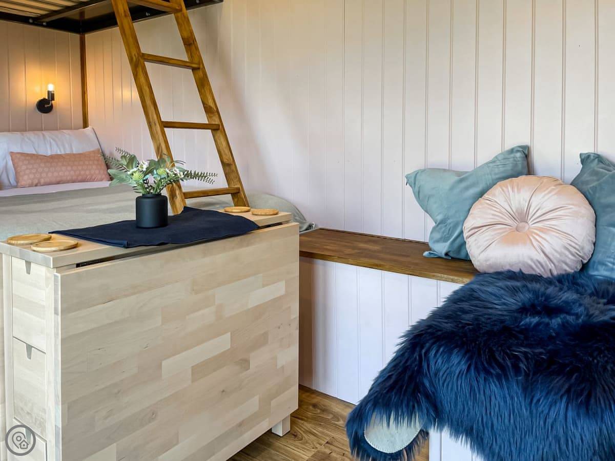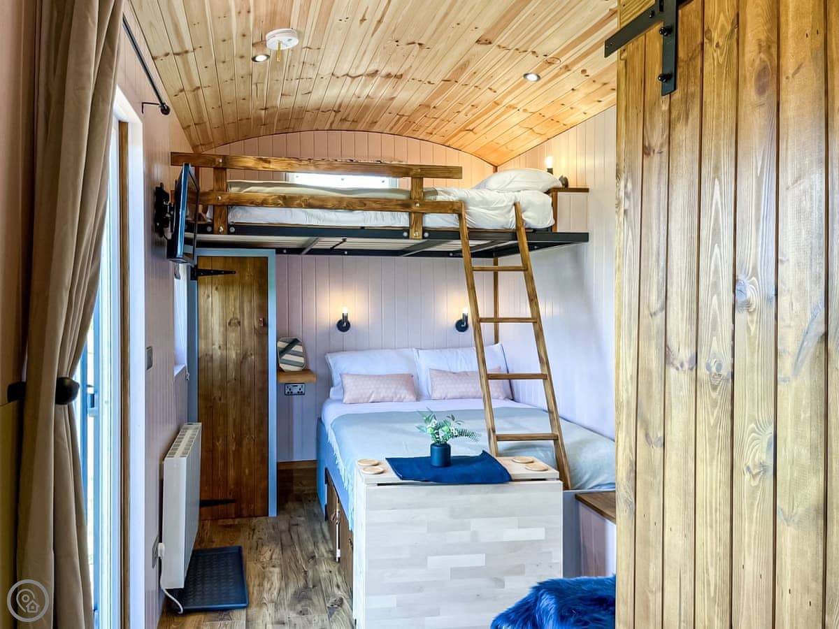 Inside, it's all one room. It sleeps four on a double bunk bed, so it's a double on the bottom and another on top. There's a small kitchen area with an oven and a fridge, a table, and a shower room. It's got Wi-Fi and a TV. The heating is electric radiators. They've done it up well, it's comfortable.